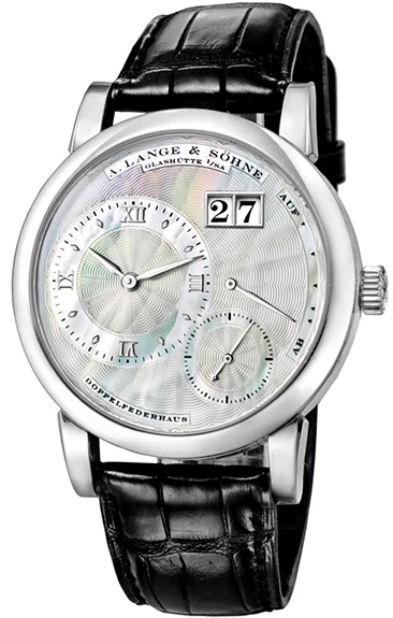 Бренд: A. Lange & Söhne; Кому: Мужские; Состояние: Как новые; Механизм: С ручным заводом; Стекло: Сапфировое; Комплектация: тревел бокс; Материал: 18- к белое золото; Запас хода: 72 часа; Калибр: L901.4; Циферблат: Перламутровый; Размер корпуса: 38,5 мм; Функции: Дата, часы, минуты, секунды, Запас хода;