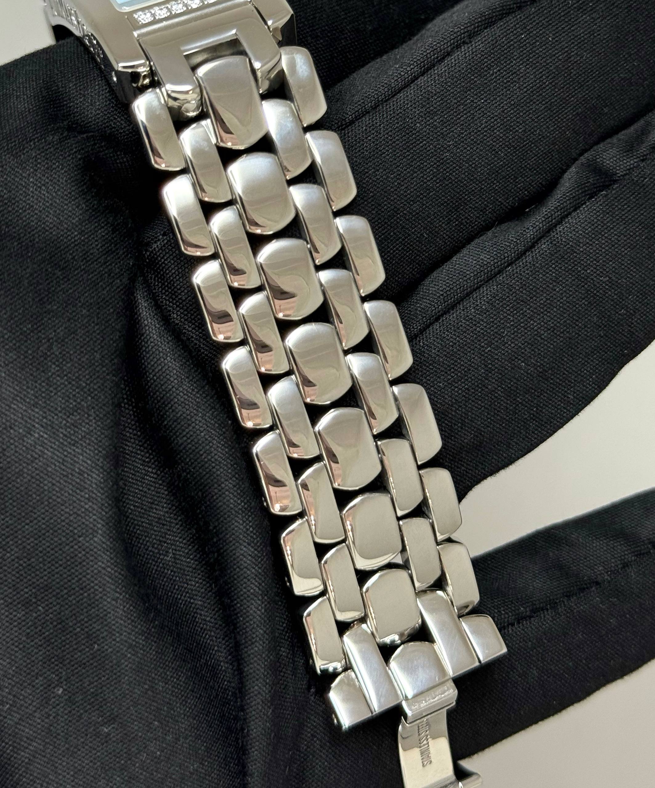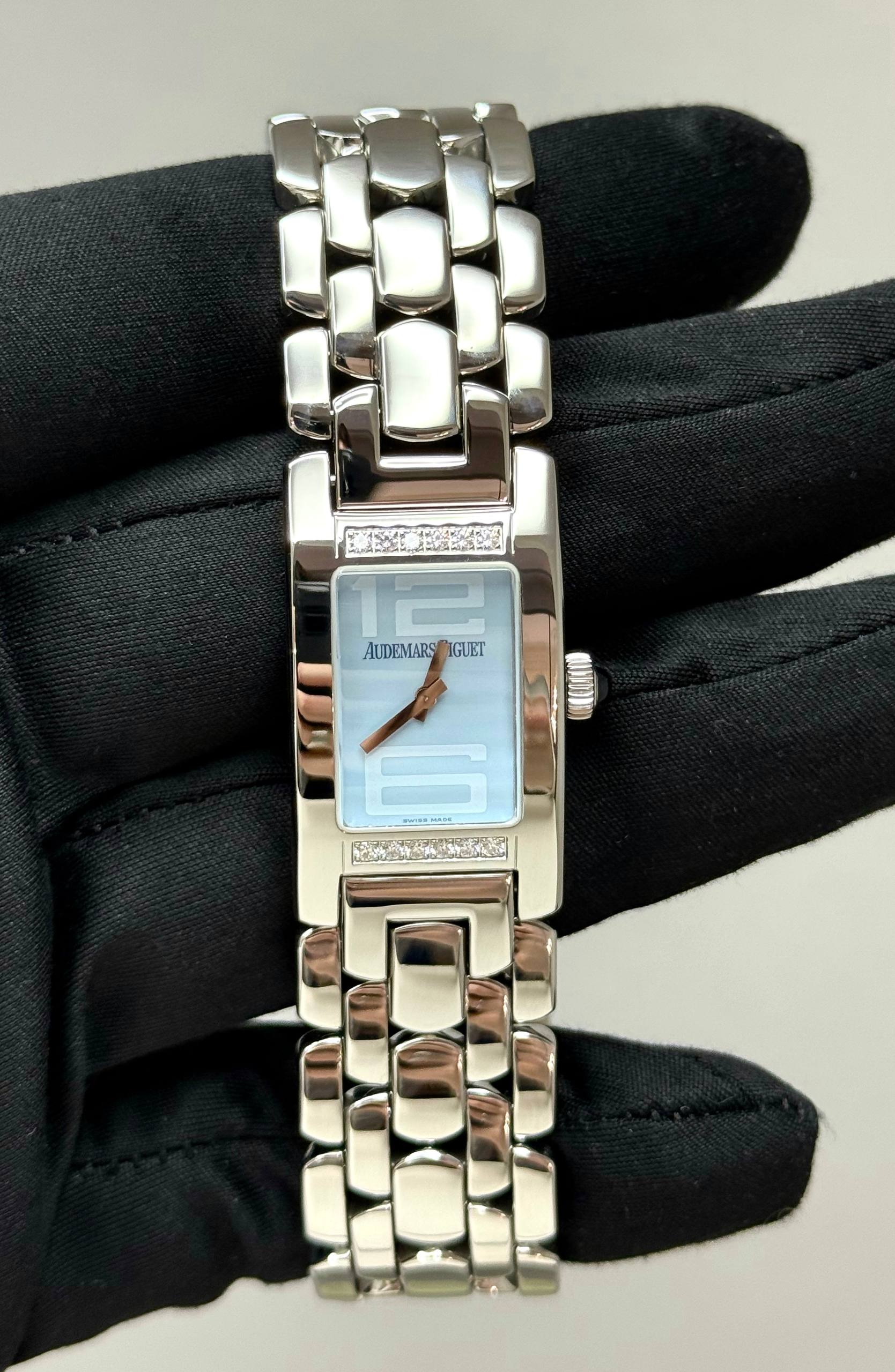 Бренд: Audemars Piguet; Кому: Женские; Состояние: Как новые; Механизм: Кварц; Ремешок: Сталь; Материал: Сталь; Стекло: Сапфировое; Форма: Прямоугольник; Застежка: Раскладывающаяся; Материал застежки: Сталь; Комплектация: Переноска; Водонепроницаемость : 30 м; Страна: Швейцария; Циферблат: Голубой; Размер браслета: 16 см; Размер корпуса: 20 х 35.5 мм; Функции: Часы, минуты;