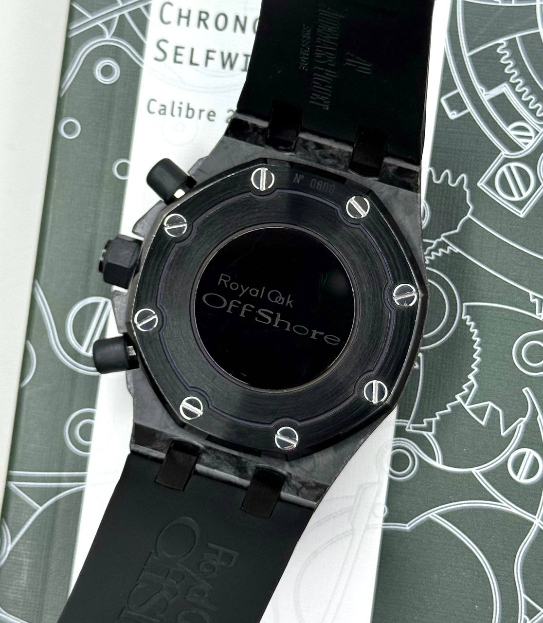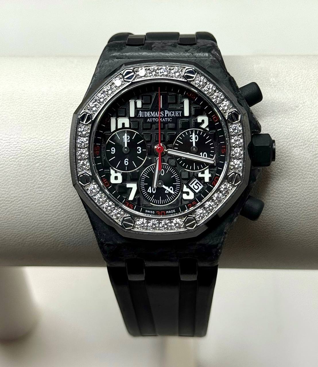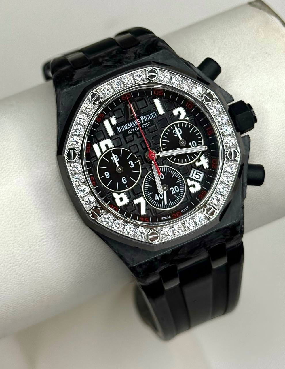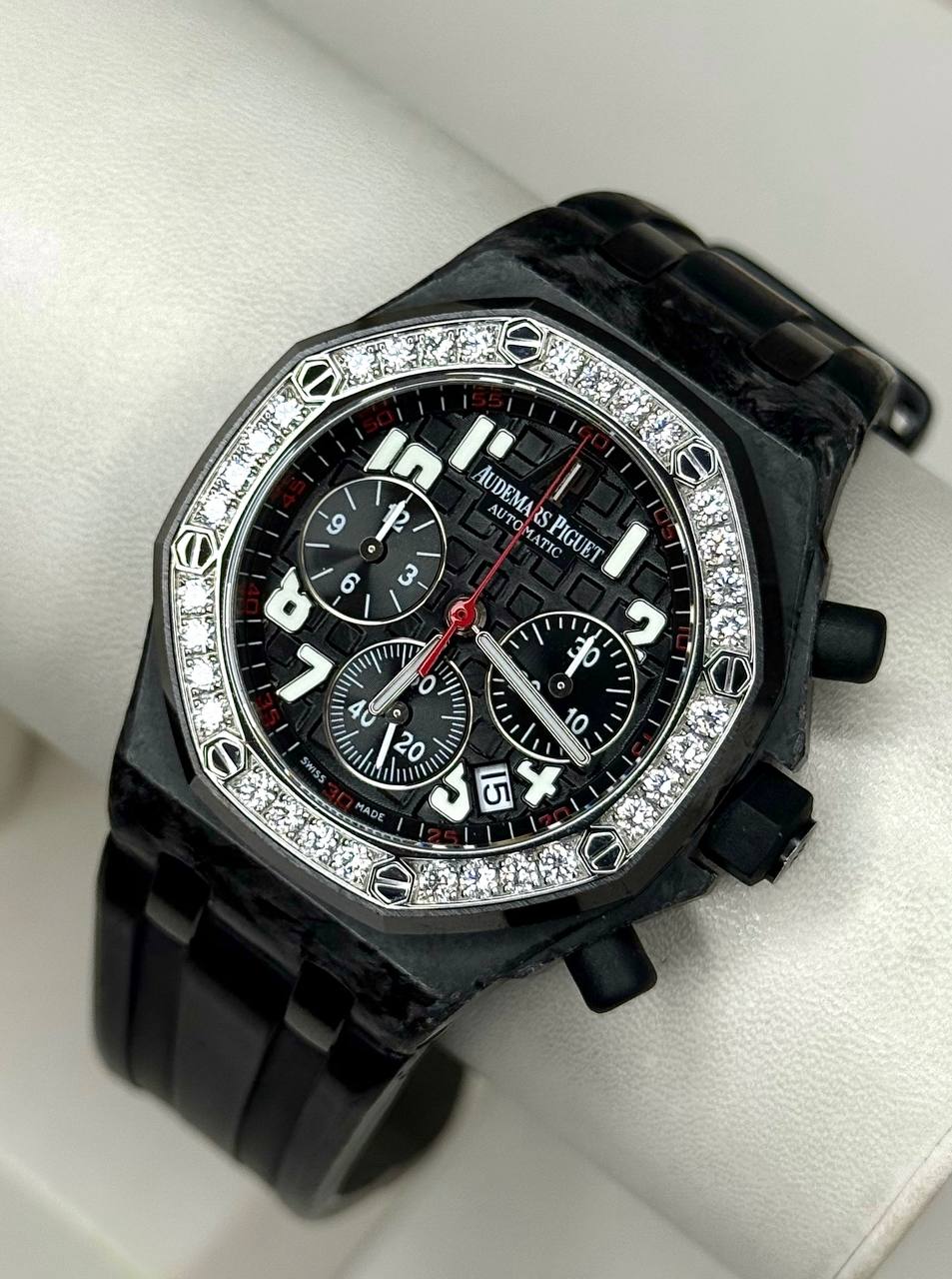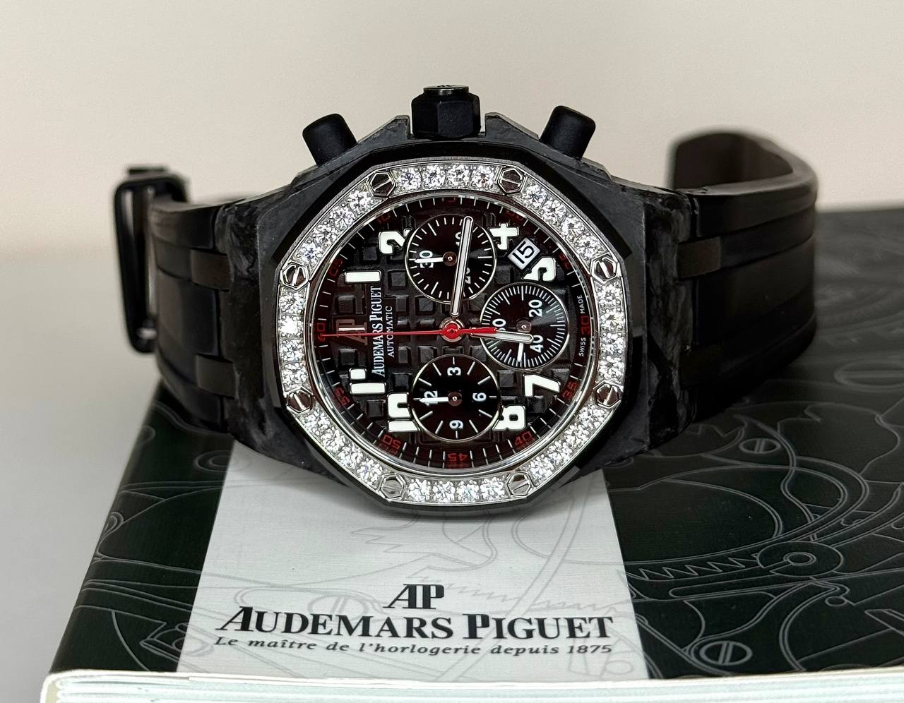 Бренд: Audemars Piguet; Кому: Женские; Состояние: С пробегом; Механизм: Механика с автоподзаводом; Ремешок: Каучук; Стекло: Сапфировое; Форма: Круг; Застежка: Раскладывающаяся; Комплектация: Документы; Год: 2011; Водонепроницаемость : 50 м; Калибр: AP2385; Страна: Швейцария; Цвет корпуса: Черный; Цвет ремешка: Черный; Циферблат: Черный; Безель: 32 бриллианта классической огранки ~1,25 ct; Размер корпуса: 37 мм; Функции: Дата, часы, минуты, секунды, хронограф;