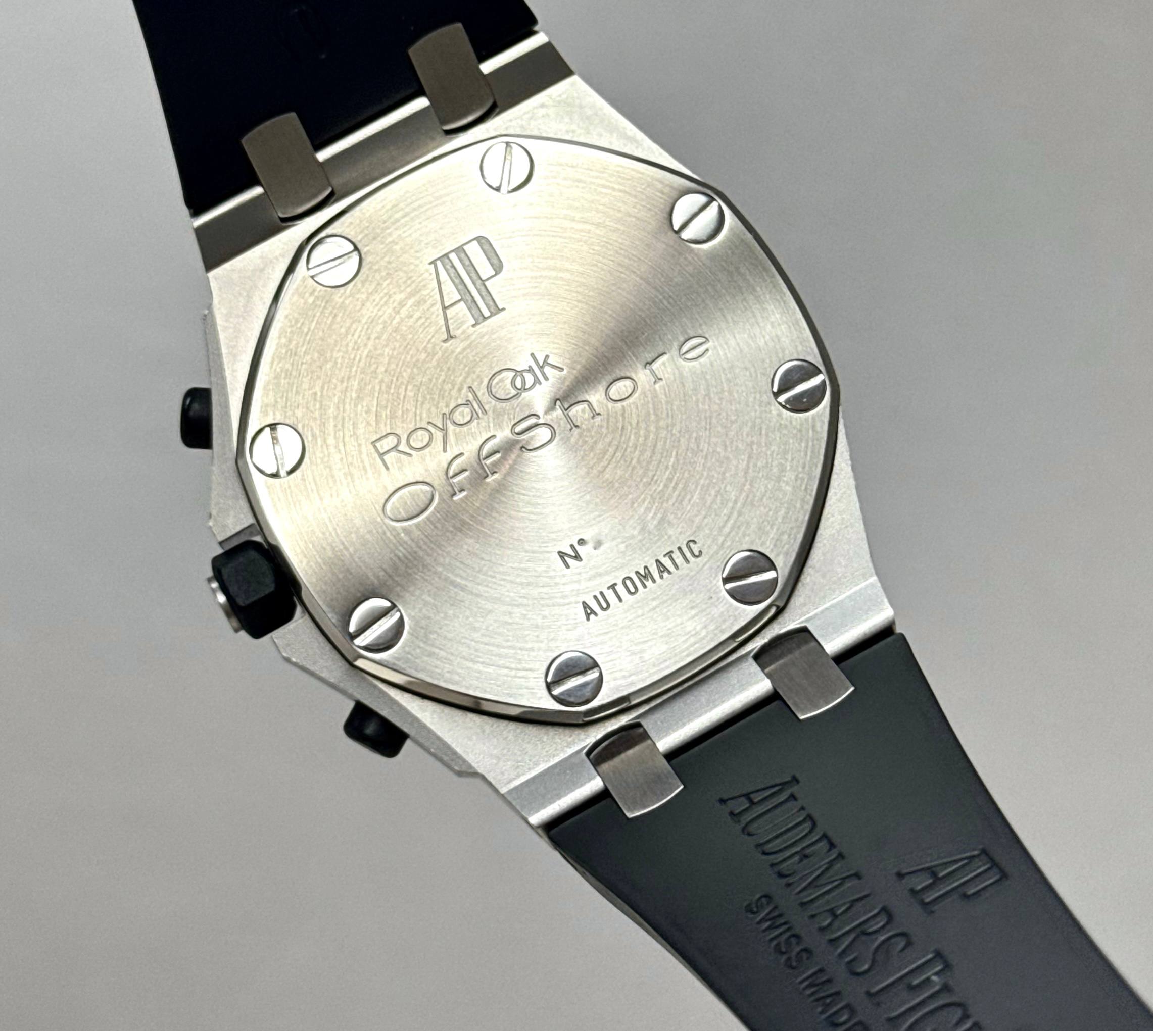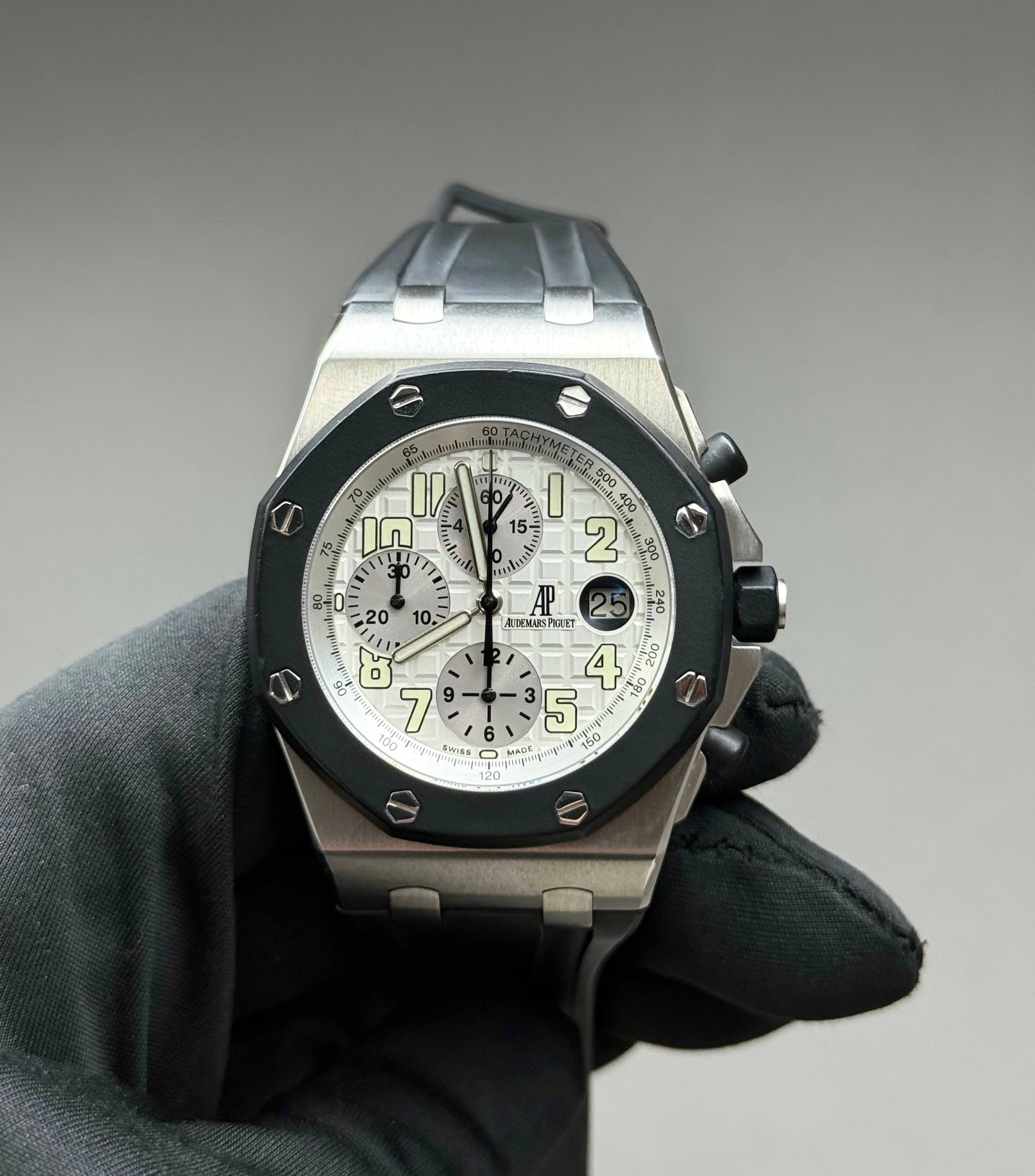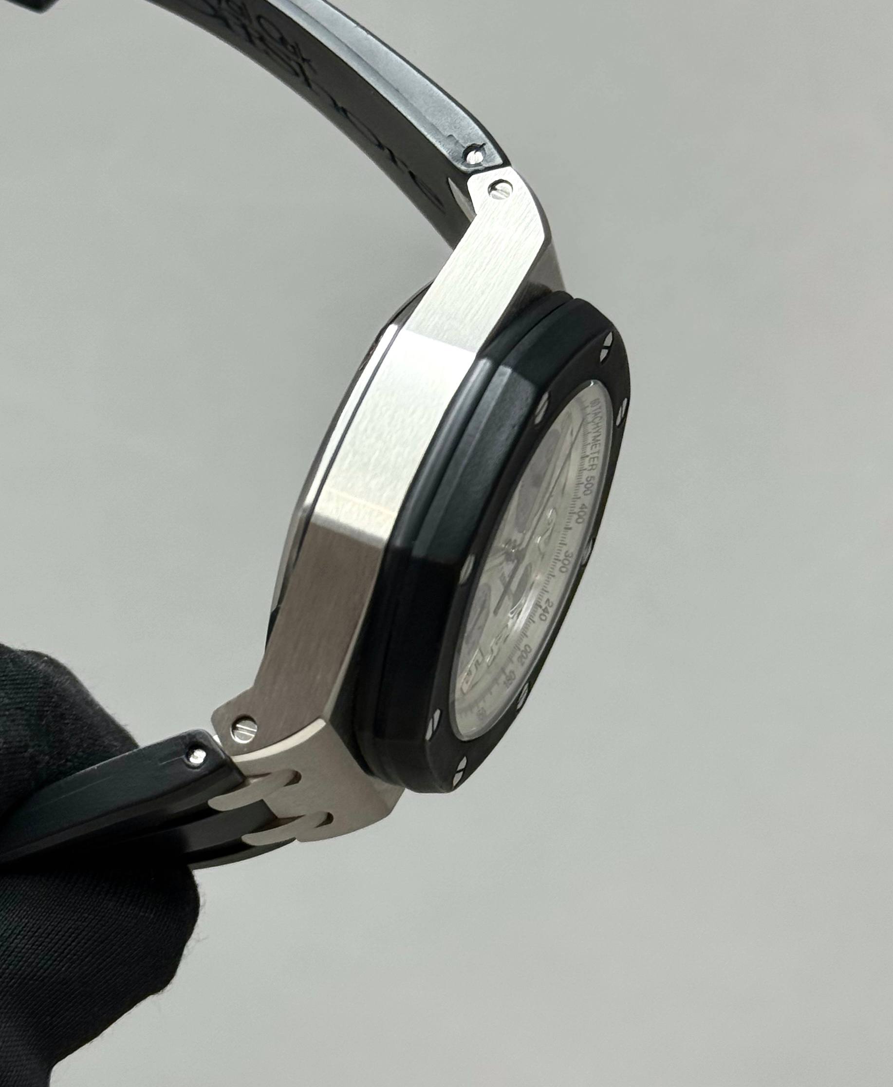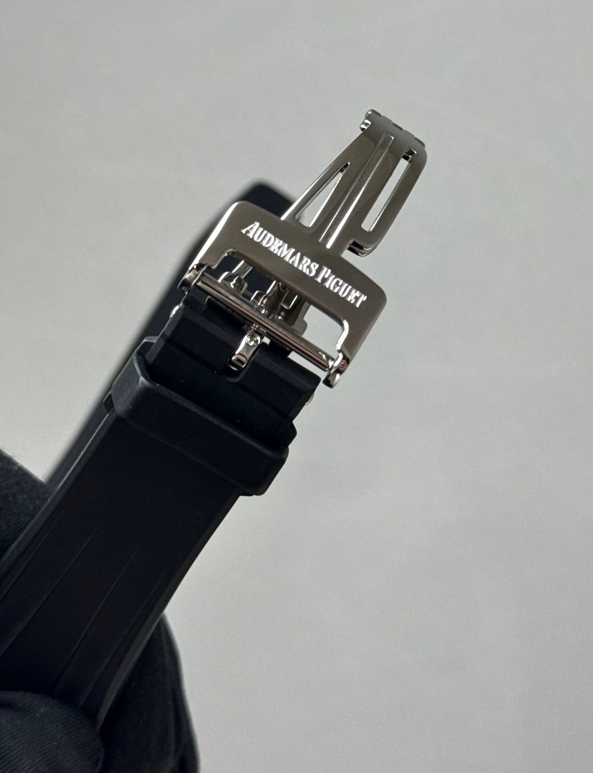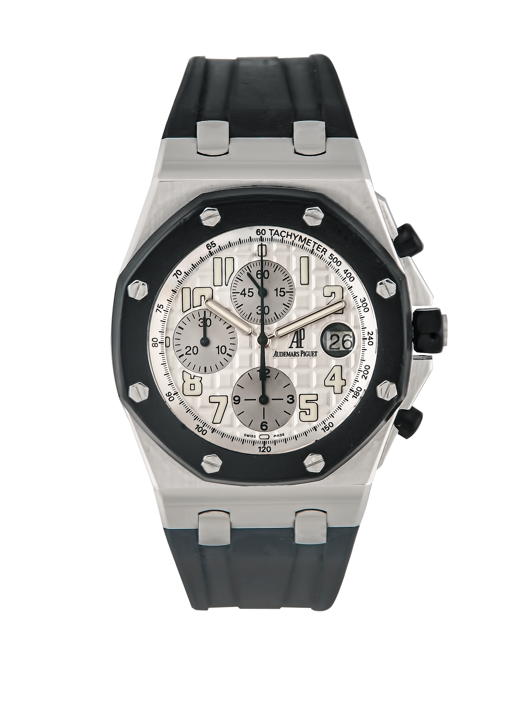 Бренд: Audemars Piguet; Кому: Мужские; Состояние: С пробегом; Механизм: Механика с автоподзаводом; Ремешок: Каучук; Материал: Сталь; Стекло: Сапфировое; Форма: Круг; Застежка: Раскладывающаяся; Материал застежки: Сталь; Комплектация: Переноска; Водонепроницаемость : 100 м; Запас хода: 40 ч; Калибр: AP 2326/2840; Страна: Швейцария; Цвет ремешка: Черный; Циферблат: Серый; Размер корпуса: 42 мм; Функции: Дата, часы, минуты, секунды, хронограф, тахиметр;