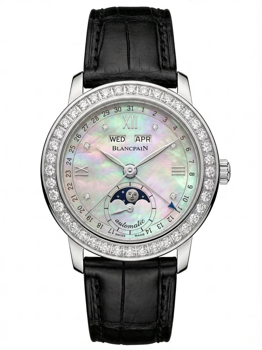 Бренд: Blancpain; Кому: Женские; Состояние: Как новые; Механизм: Механика с автоподзаводом; Ремешок: Кожа; Материал: Сталь; Стекло: Сапфировое; Форма: Круг; Застежка: Пряжка; Материал застежки: Сталь; Комплектация: Переноска; Водонепроницаемость : 30 м; Запас хода: 100 ч; Калибр: Blancpain 6763; Циферблат: Перламутровый; Размер ремня: 19.5 см; Размер корпуса: 34 мм; Функции: Дата, часы, минуты, секунды, день недели, месяц, фаза луны;