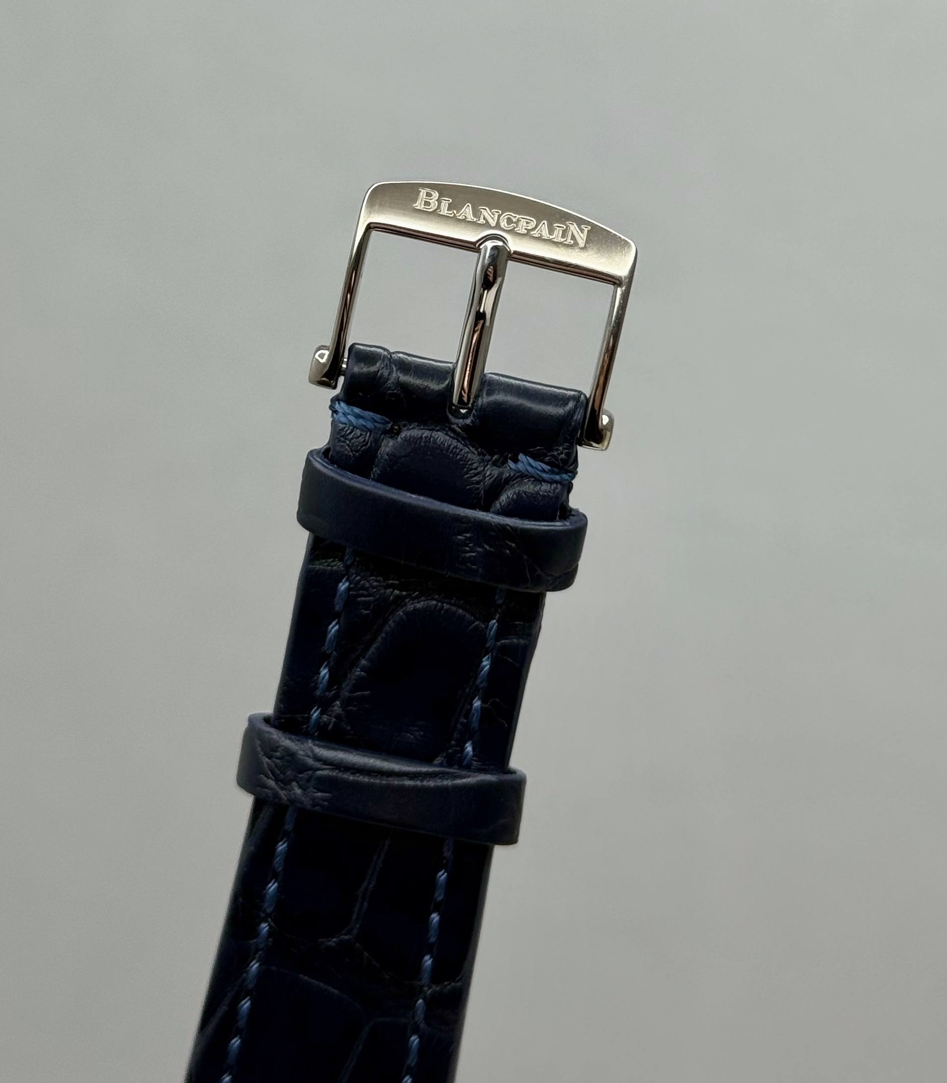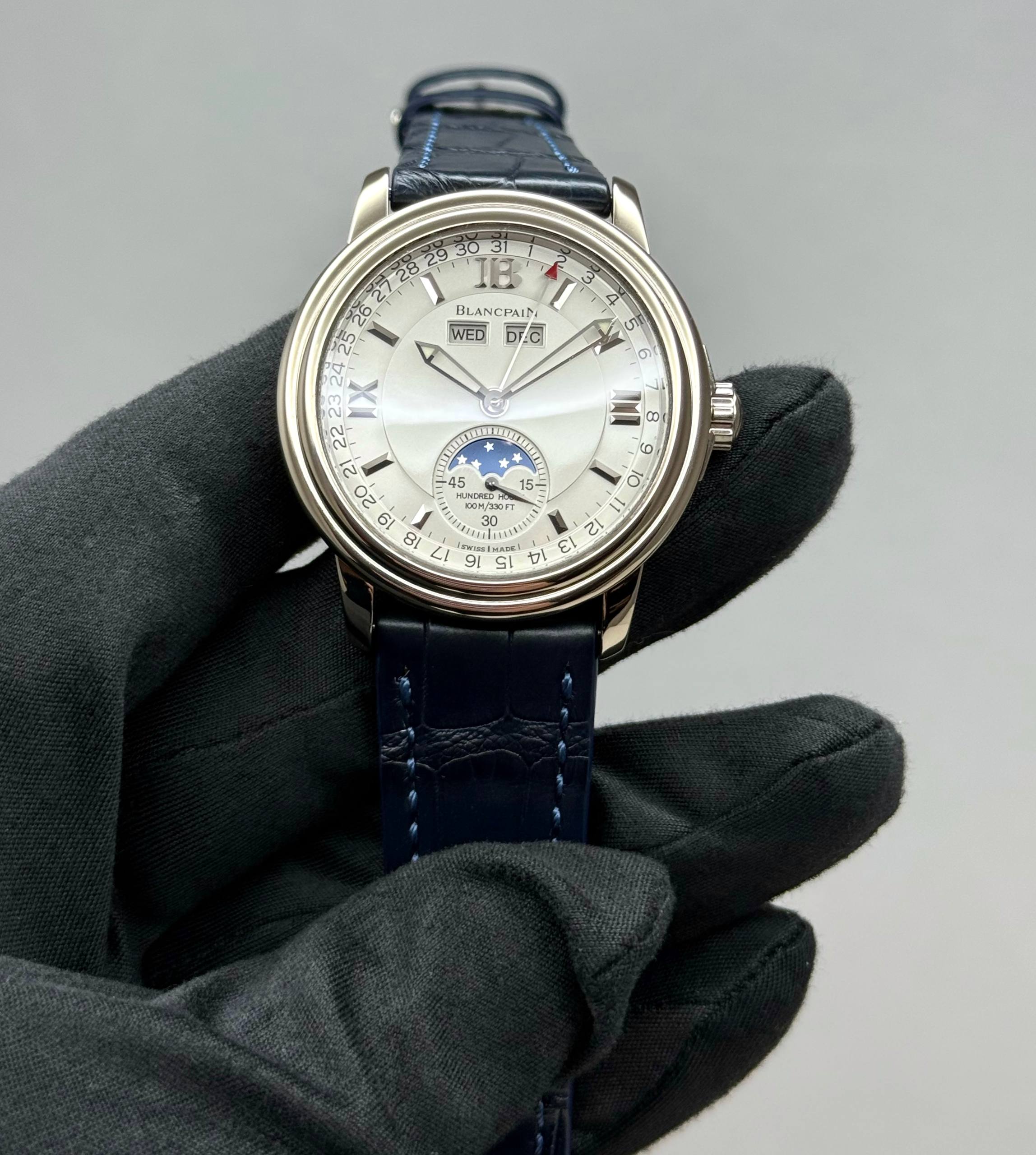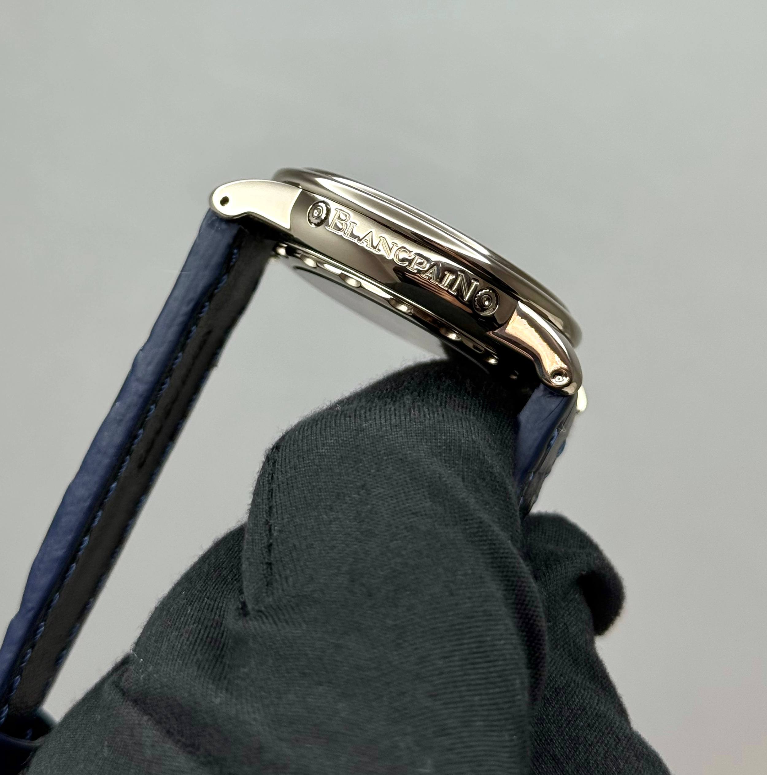 Бренд: Blancpain; Кому: Мужские; Состояние: Как новые; Механизм: Механика с автоподзаводом; Ремешок: Кожа; Материал: Золото; Стекло: Сапфировое; Форма: Круг; Застежка: Пряжка; Материал застежки: Золото; Комплектация: Переноска; Водонепроницаемость : 100 м; Запас хода: 100 ч; Калибр: 6763; Цвет ремешка: Темно-синий; Циферблат: Белый; Размер ремня: 21.5 см; Размер корпуса: 38 мм; Функции: Дата, часы, минуты, секунды, день недели, месяц, фаза луны;