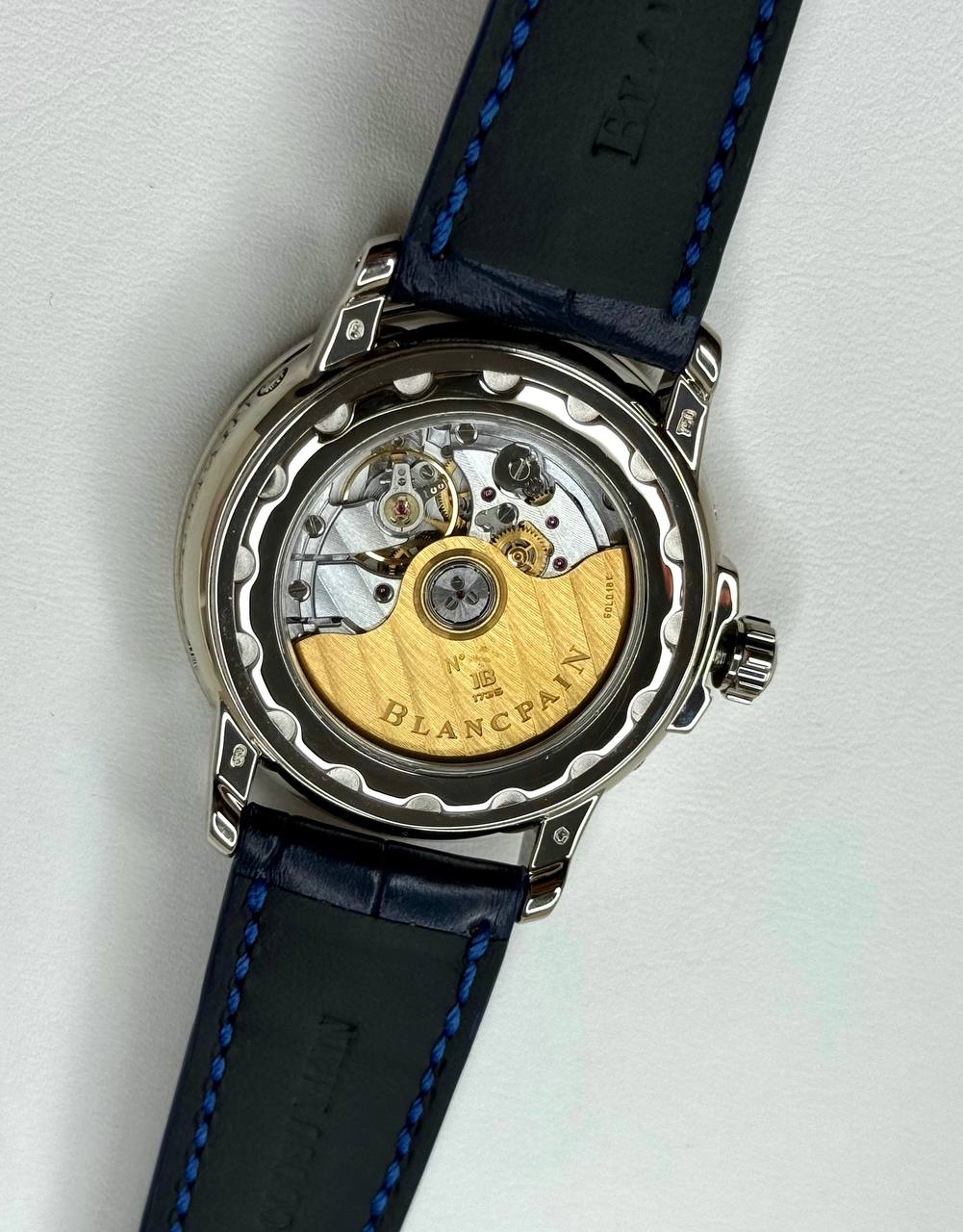 Бренд: Blancpain; Кому: Мужские; Состояние: Как новые; Механизм: Механика с автоподзаводом; Стекло: Сапфировое; Комплектация: одни часы; Материал: 18- к белое золото; Водонепроницаемость (м): 100; Запас хода: 100 часов; Калибр: 6763; Циферблат: юелый; Размер: 38 мм; Функции: Дата, часы, минуты, секунды, День недели, Месяц, Фаза луны;