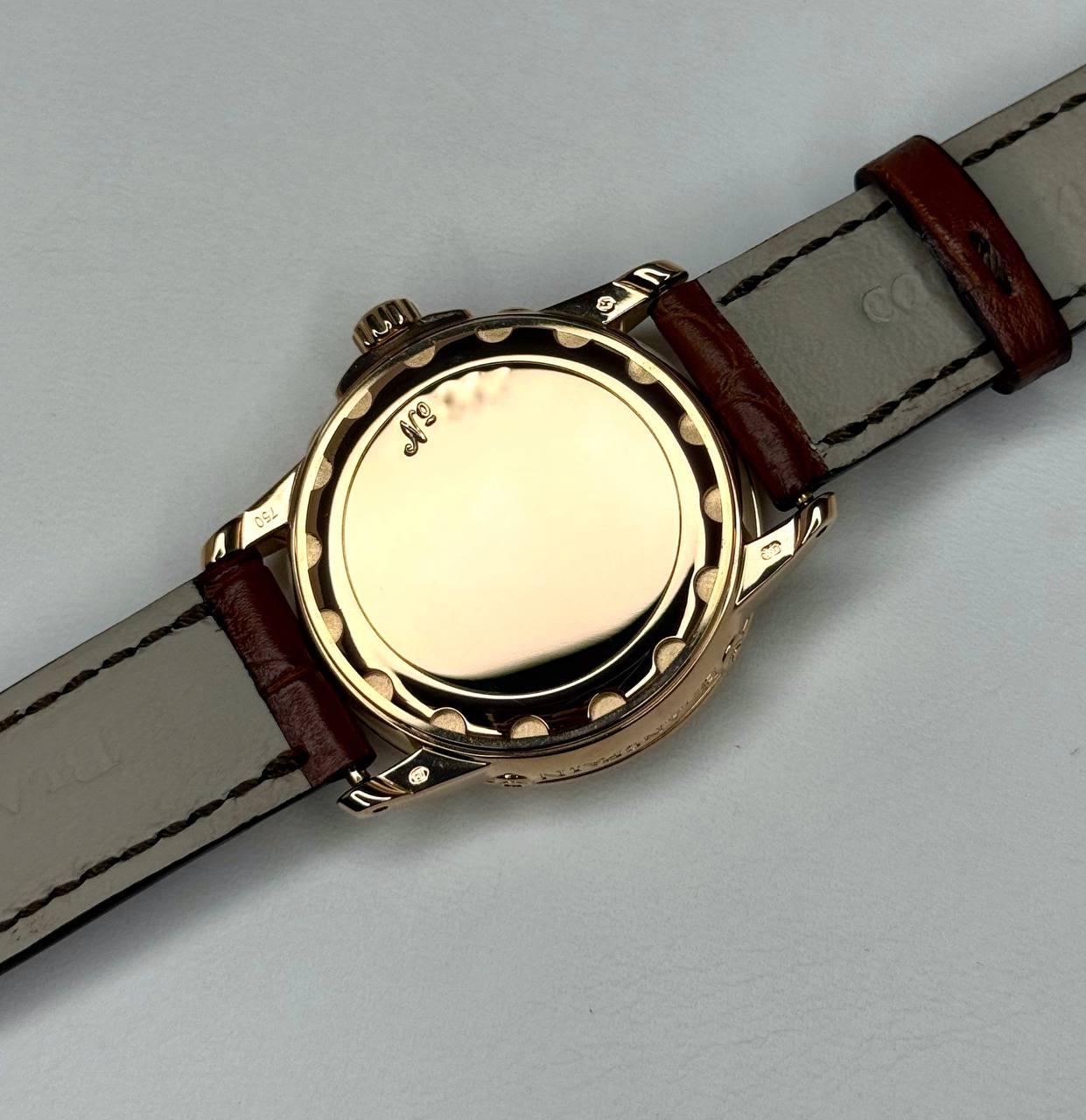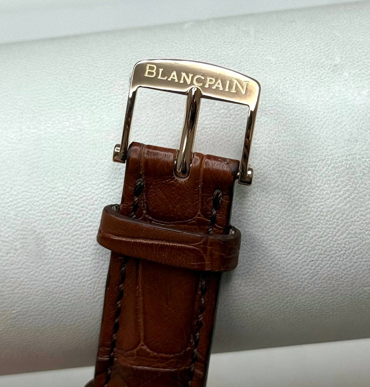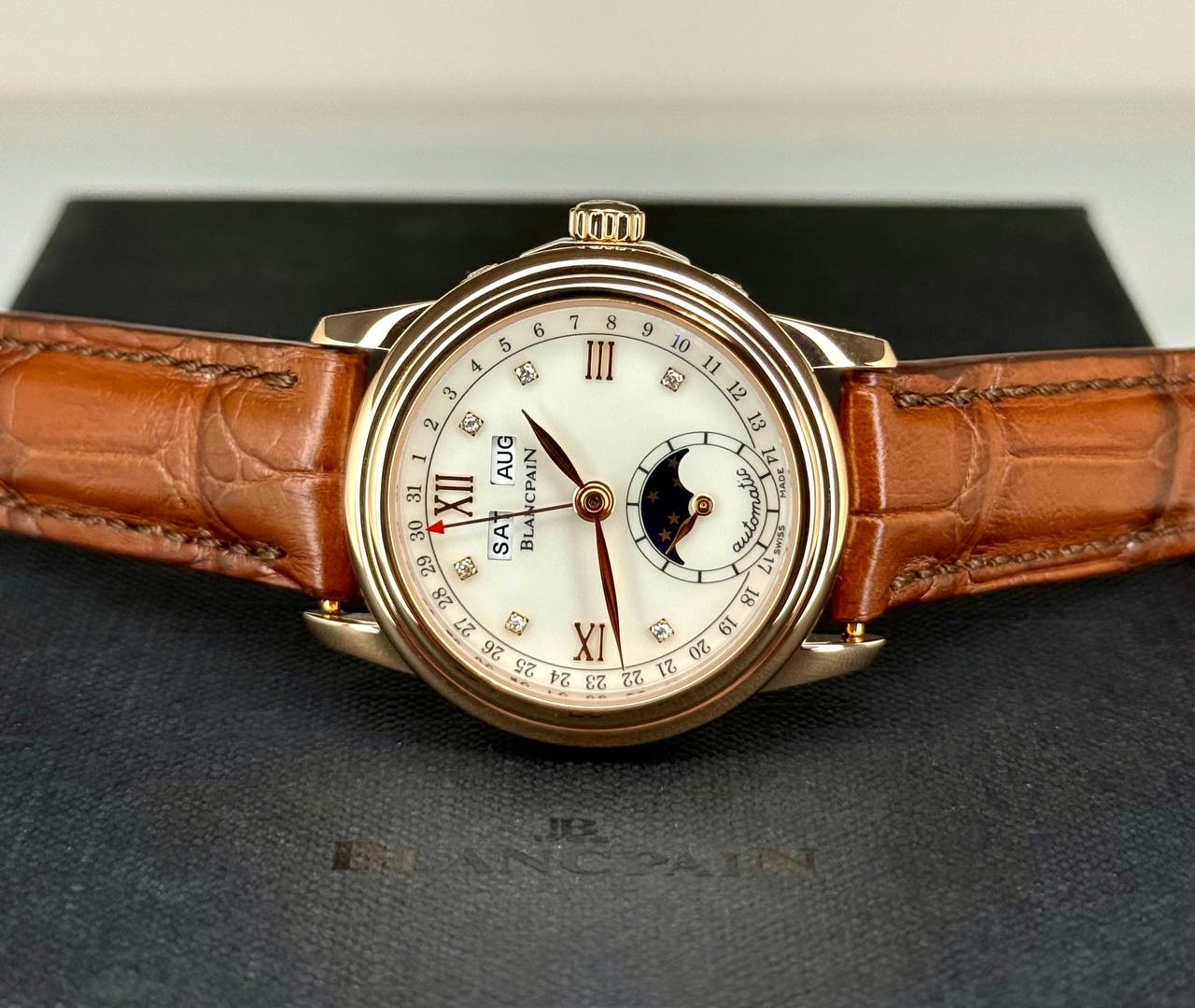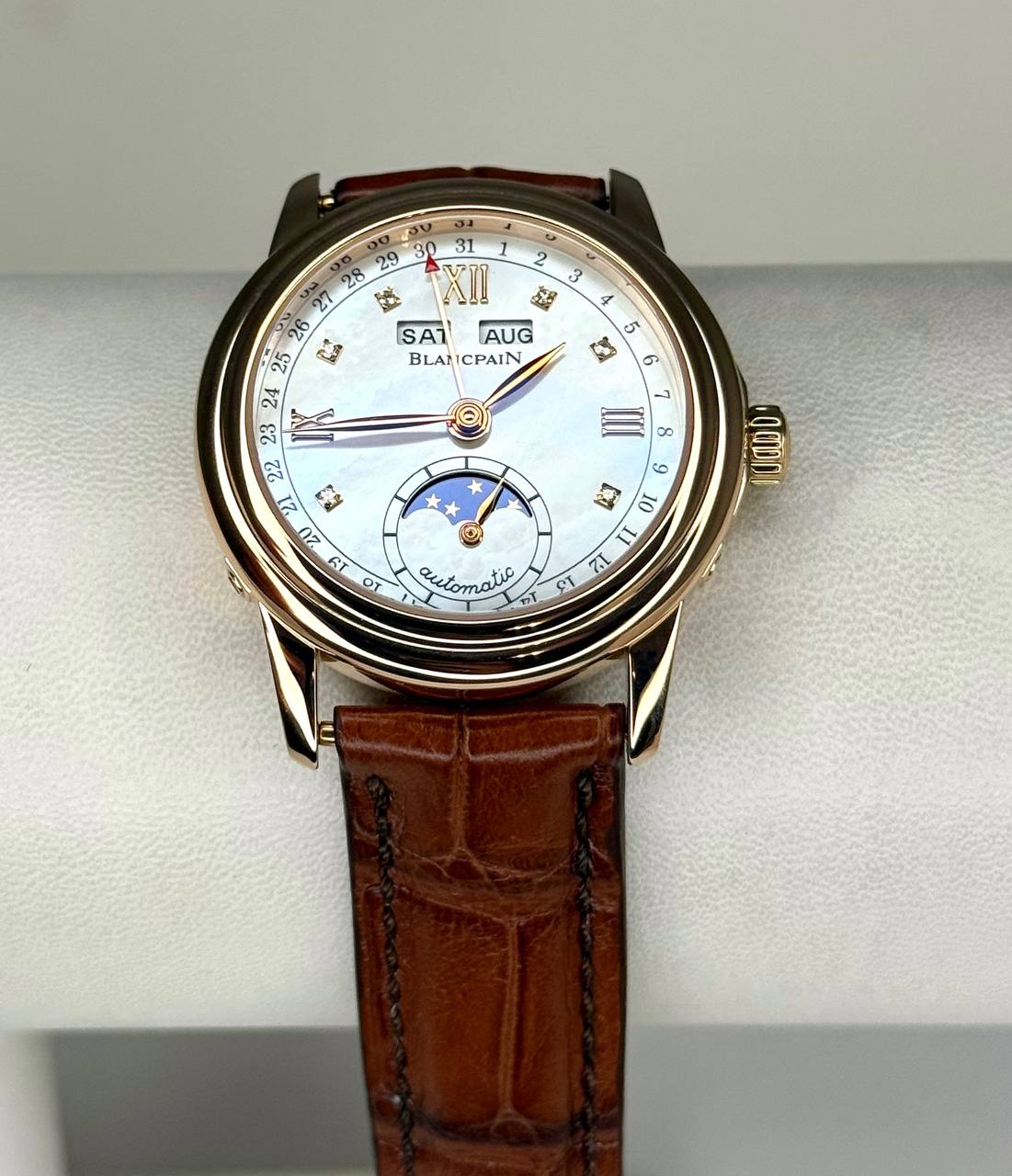 Бренд: Blancpain; Кому: Женские; Состояние: Как новые; Механизм: Механика с автоподзаводом; Ремешок: Кожа; Материал: Розовое Золото 18K; Стекло: Сапфировое; Форма: Круг; Застежка: Пряжка; Материал застежки: Розовое Золото 18K; Комплектация: Документы; Год: 2007; Водонепроницаемость : 30 м; Запас хода: 100 ч; Калибр: 6763; Страна: Швейцария; Цвет ремешка: Коричневый; Циферблат: Перламутровый, 6 бриллиантов 0.03 ct; Размер ремня: 15.5-19.5 см; Функции: Дата, часы, минуты, секунды, день недели, месяц, фаза луны;