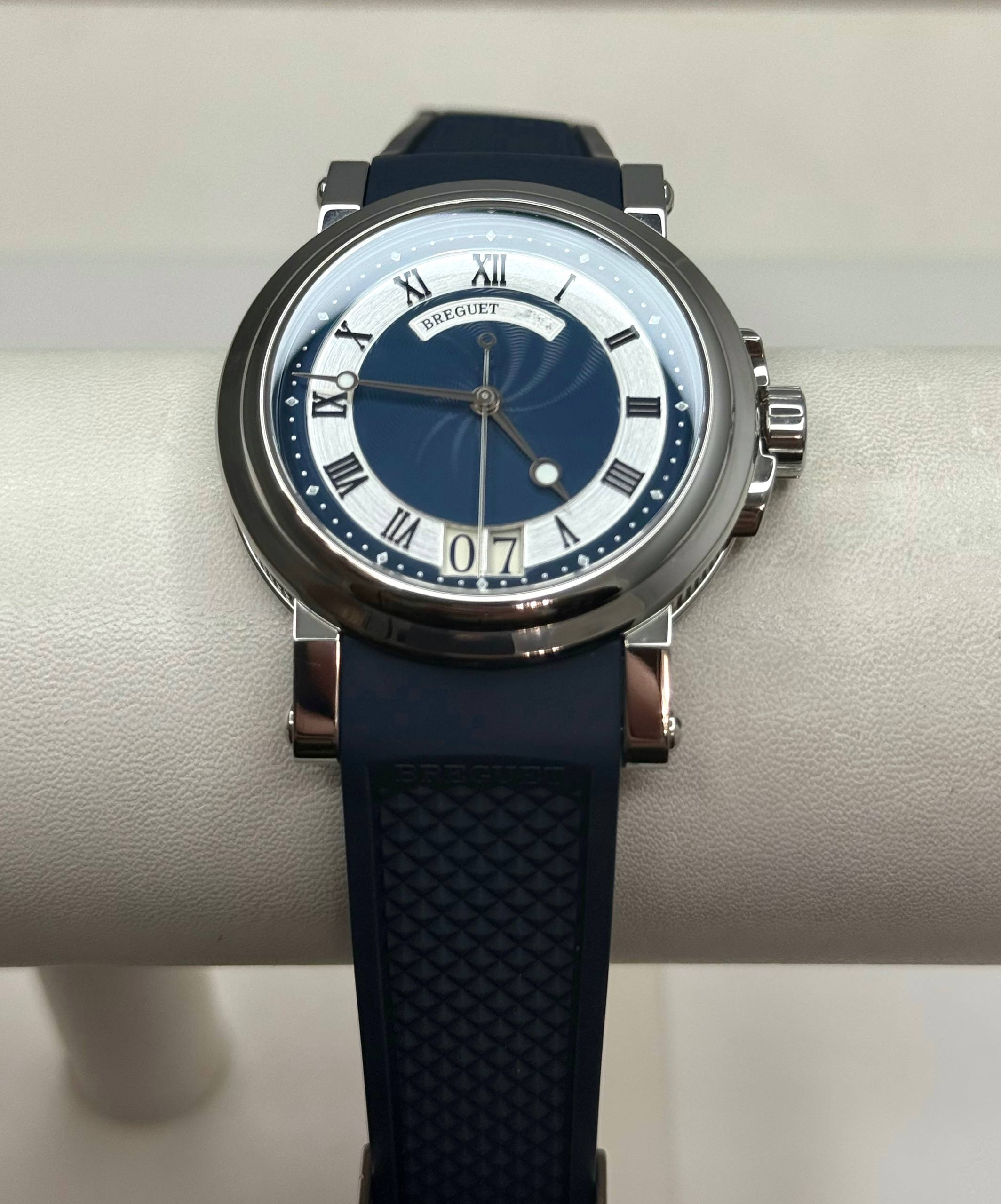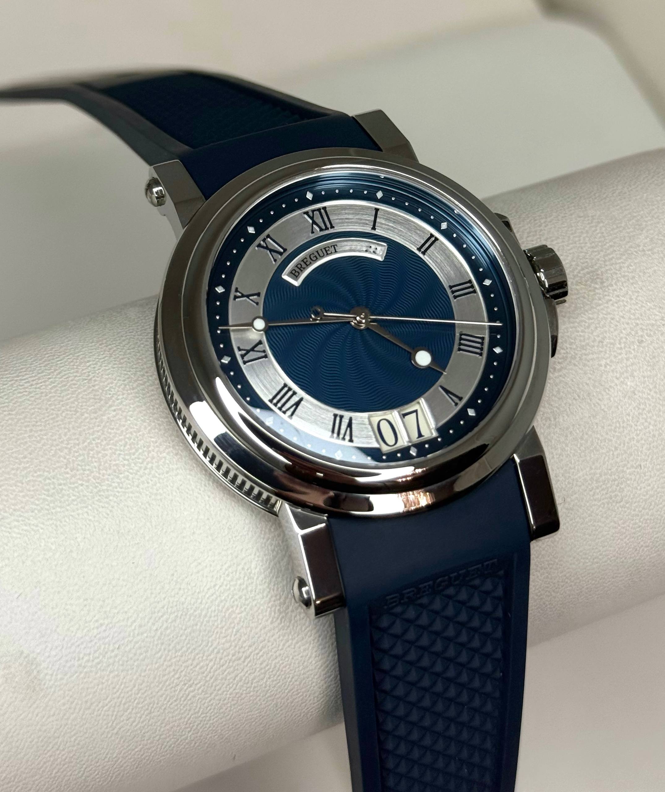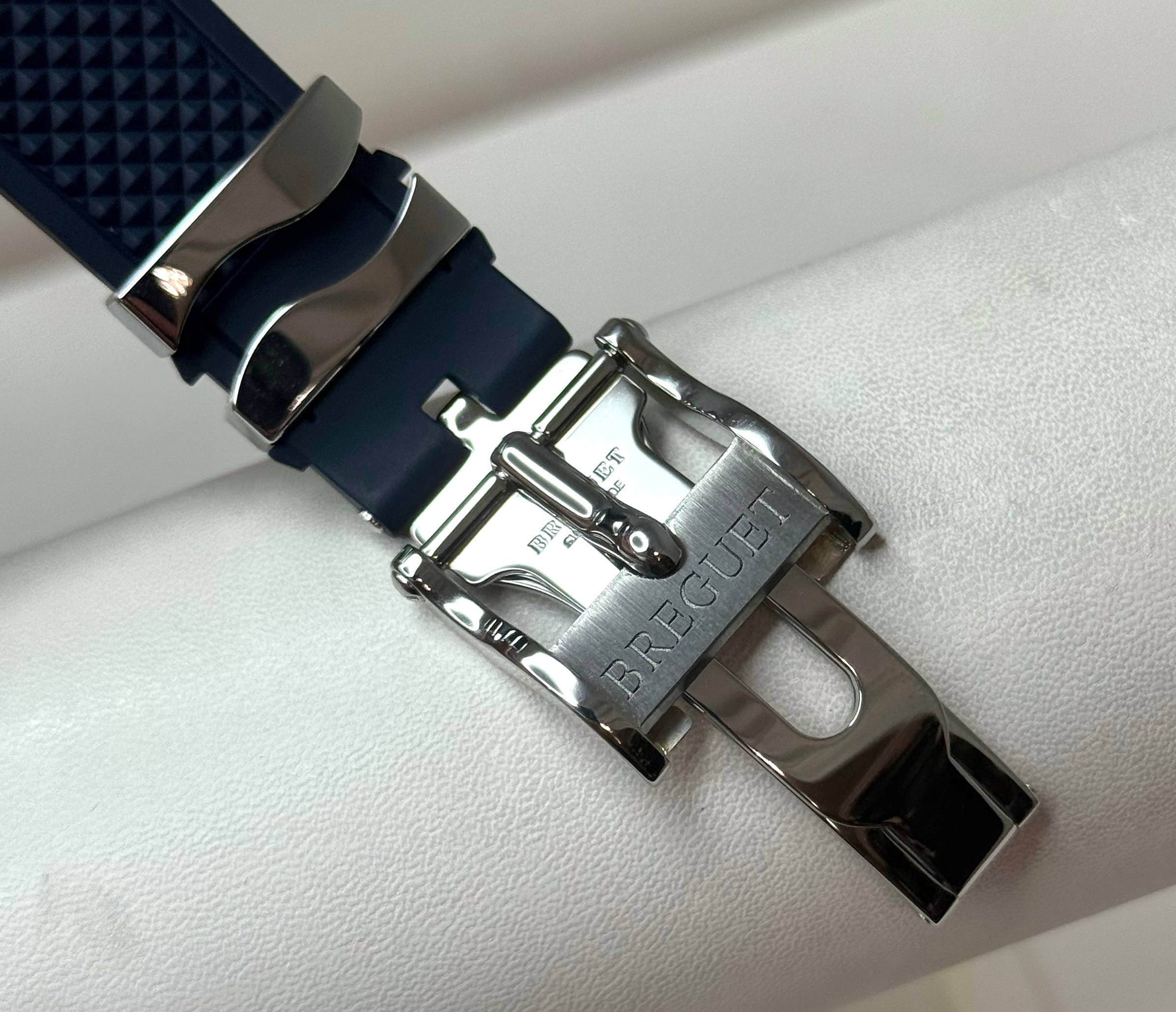Бренд: Breguet; Кому: Мужские; Состояние: Как новые; Механизм: Механика с автоподзаводом; Ремешок: Каучук; Материал: Сталь; Стекло: Сапфировое; Форма: Круг; Застежка: Раскладывающаяся; Материал застежки: Сталь; Комплектация: Документы; Водонепроницаемость : 100 м; Запас хода: 65 ч; Калибр: 517GG; Страна: Швейцария; Цвет ремешка: Синий; Циферблат: Синий гильошированный; Размер корпуса: 39 мм; Функции: Дата, часы, минуты, секунды;