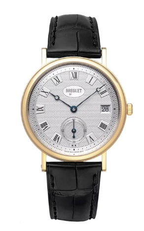 Бренд: Breguet; Кому: Мужские; Состояние: Как новые; Механизм: Механика с автоподзаводом; Ремешок: Кожа; Материал: Желтое золото; Стекло: Сапфировое; Форма: Круг; Застежка: Пряжка; Материал застежки: Желтое золото; Комплектация: Документы, переноска; Вес: 53.9 гр; Водонепроницаемость : 30 м; Страна: Швейцария; Циферблат: Серебристый гильошированный; Размер ремня: 20 см; Размер корпуса: 34.6 мм; Функции: Дата, часы, минуты, секунды;