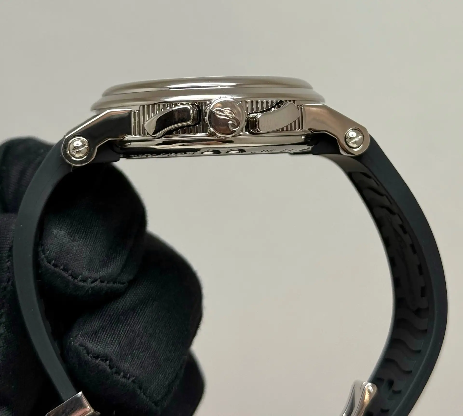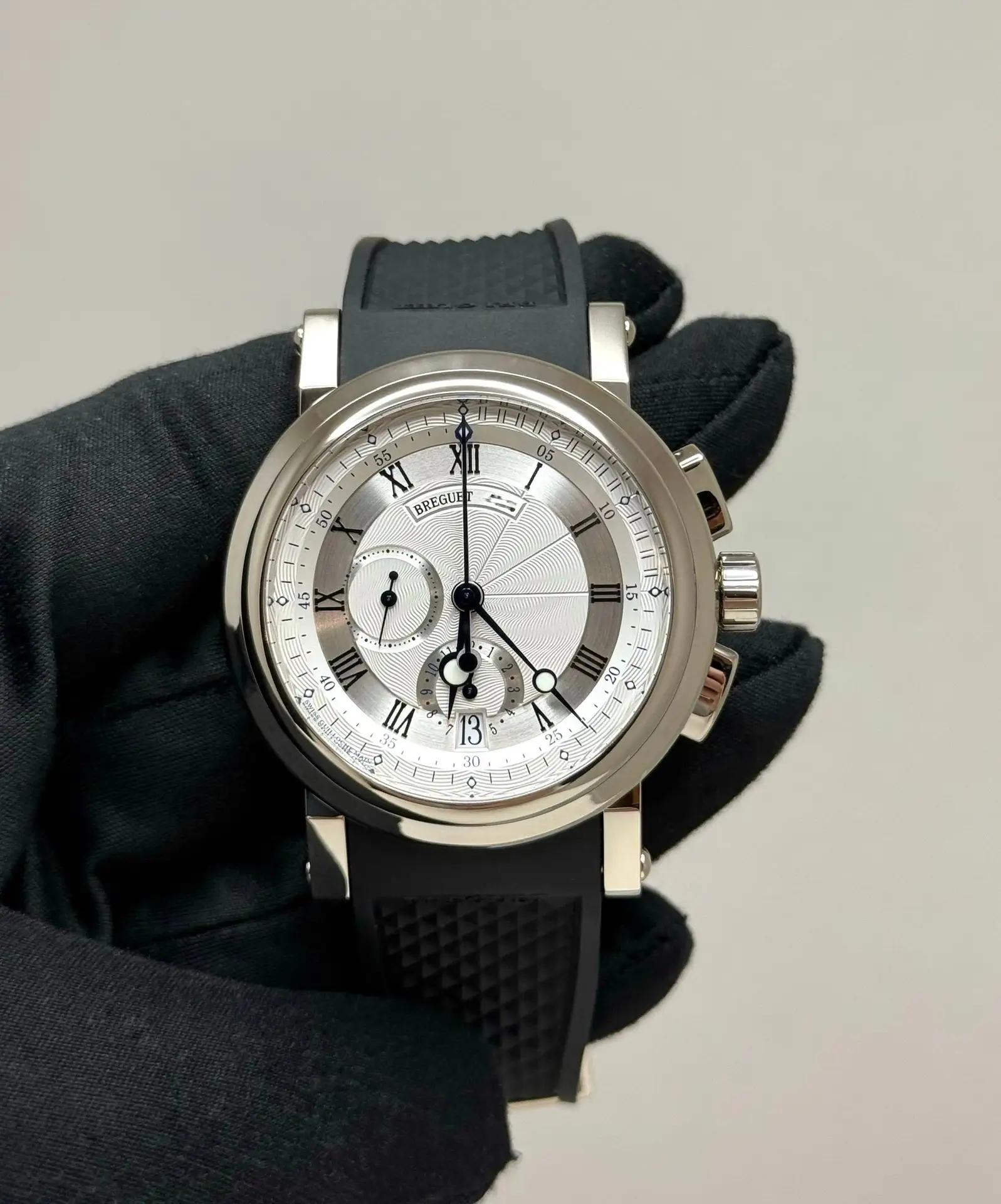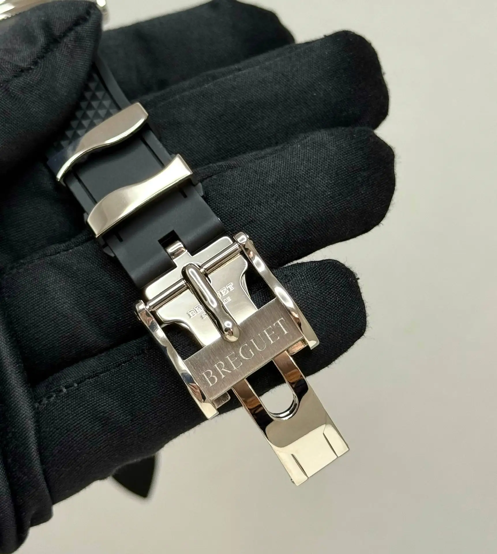 Бренд: Breguet; Кому: Мужские; Состояние: Как новые; Механизм: Механика с автоподзаводом; Ремешок: Каучук; Материал: Белое золото; Стекло: Сапфировое; Форма: Круг; Застежка: Раскладывающаяся; Материал застежки: Белое золото; Комплектация: Документы, переноска; Год: 2016; Водонепроницаемость : 100 м; Циферблат: Серебристый гильошированный; Размер корпуса: 42 мм; Функции: Дата, часы, минуты, секунды, хронограф;