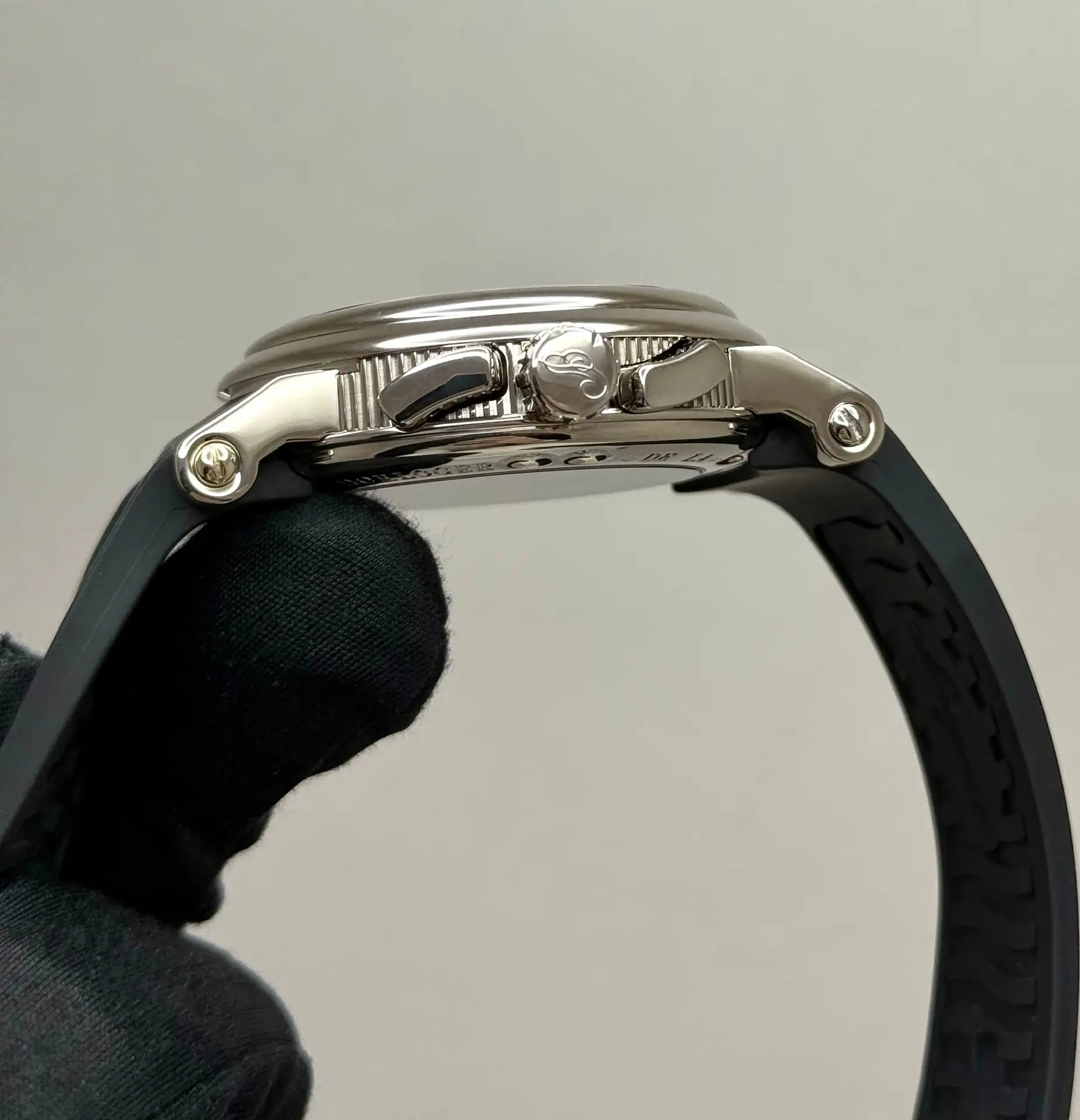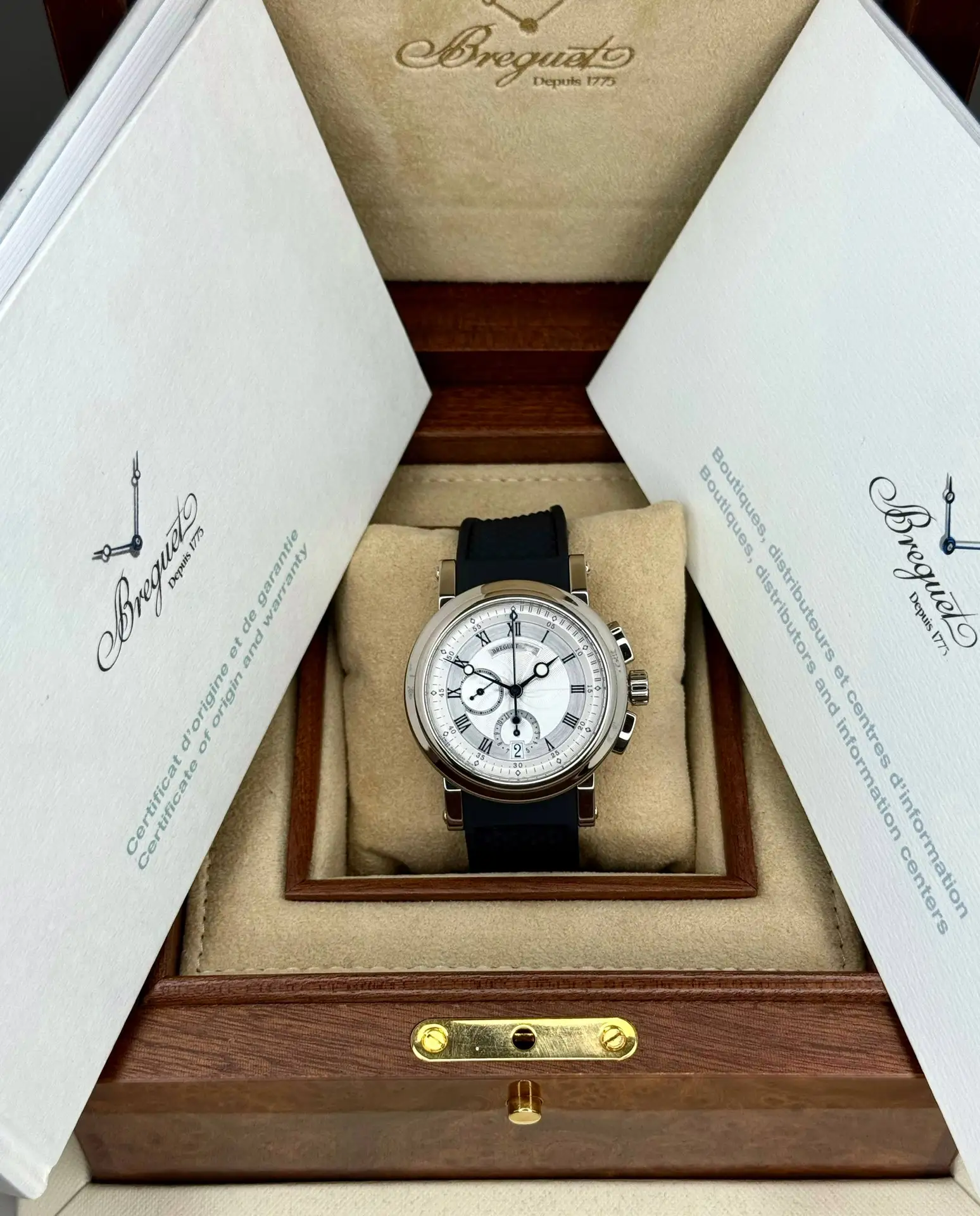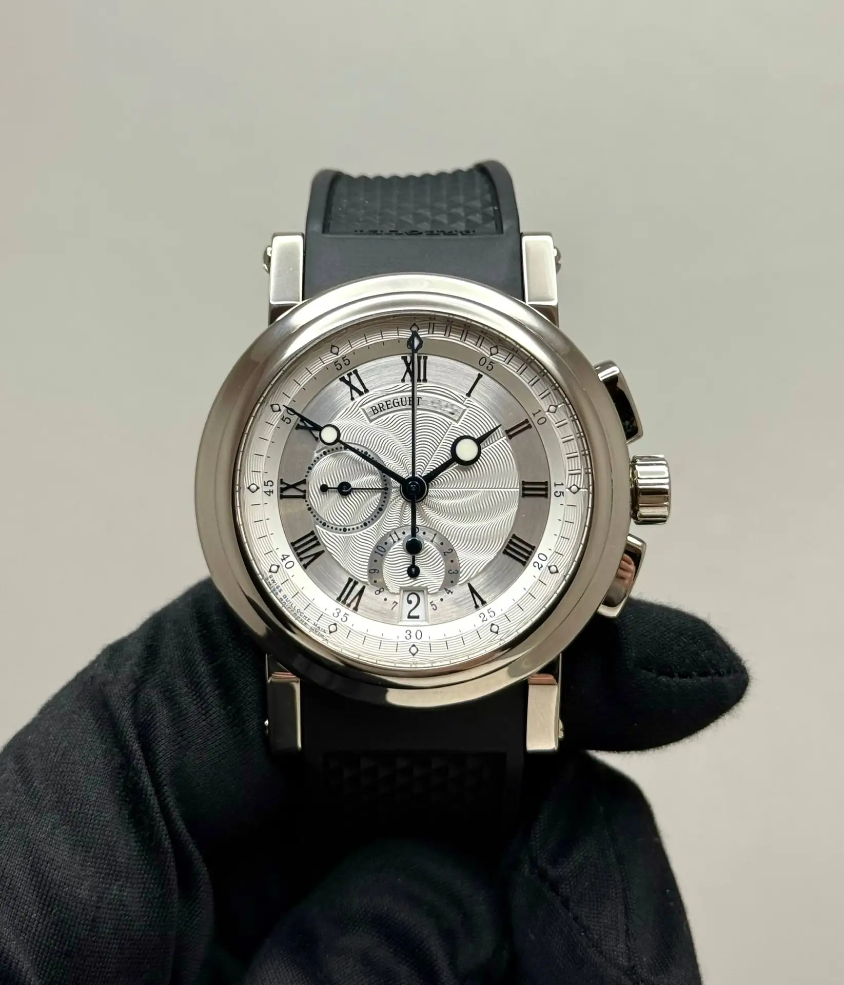 Бренд: Breguet; Кому: Мужские; Состояние: Как новые; Механизм: Механика с автоподзаводом; Ремешок: Каучук; Материал: Белое золото; Стекло: Сапфировое; Форма: Круг; Застежка: Раскладывающаяся; Материал застежки: Белое золото; Комплектация: Коробка, документы; Водонепроницаемость : 300 м; Страна: Швейцария; Цвет ремешка: Черный; Циферблат: Серебристый гильошированный; Размер корпуса: 42 мм; Функции: Дата, часы, минуты, секунды, хронограф;