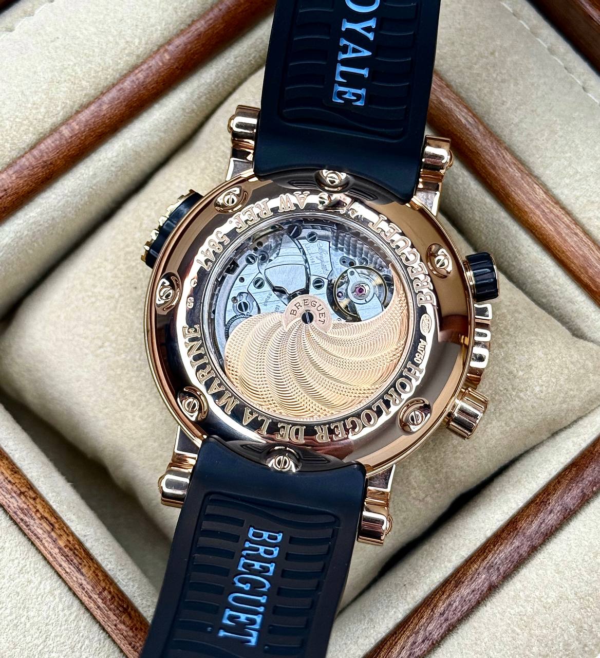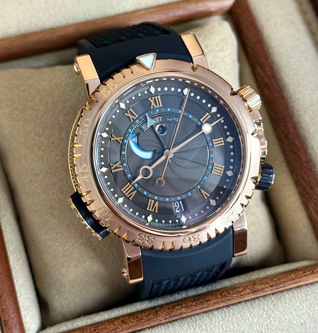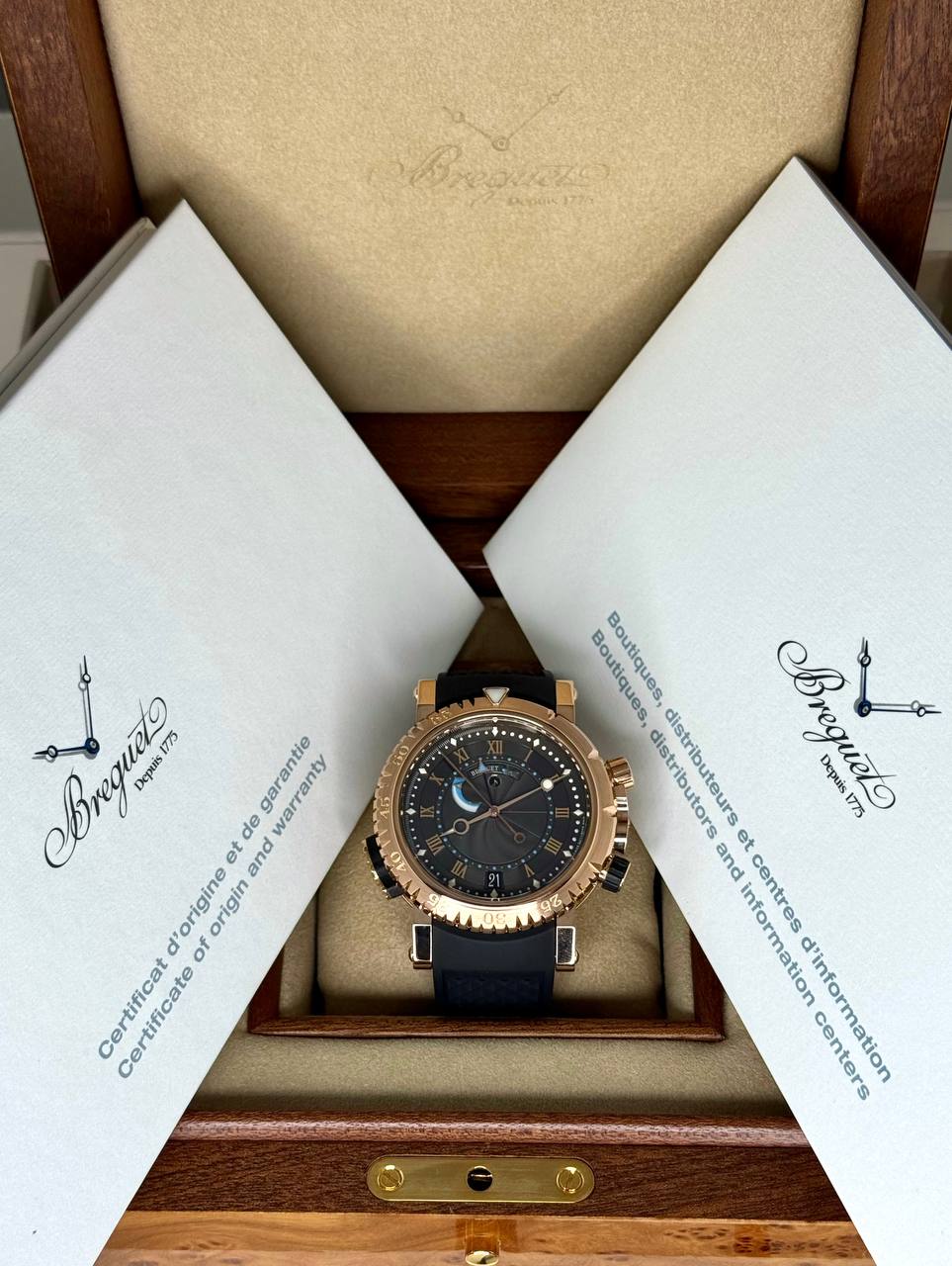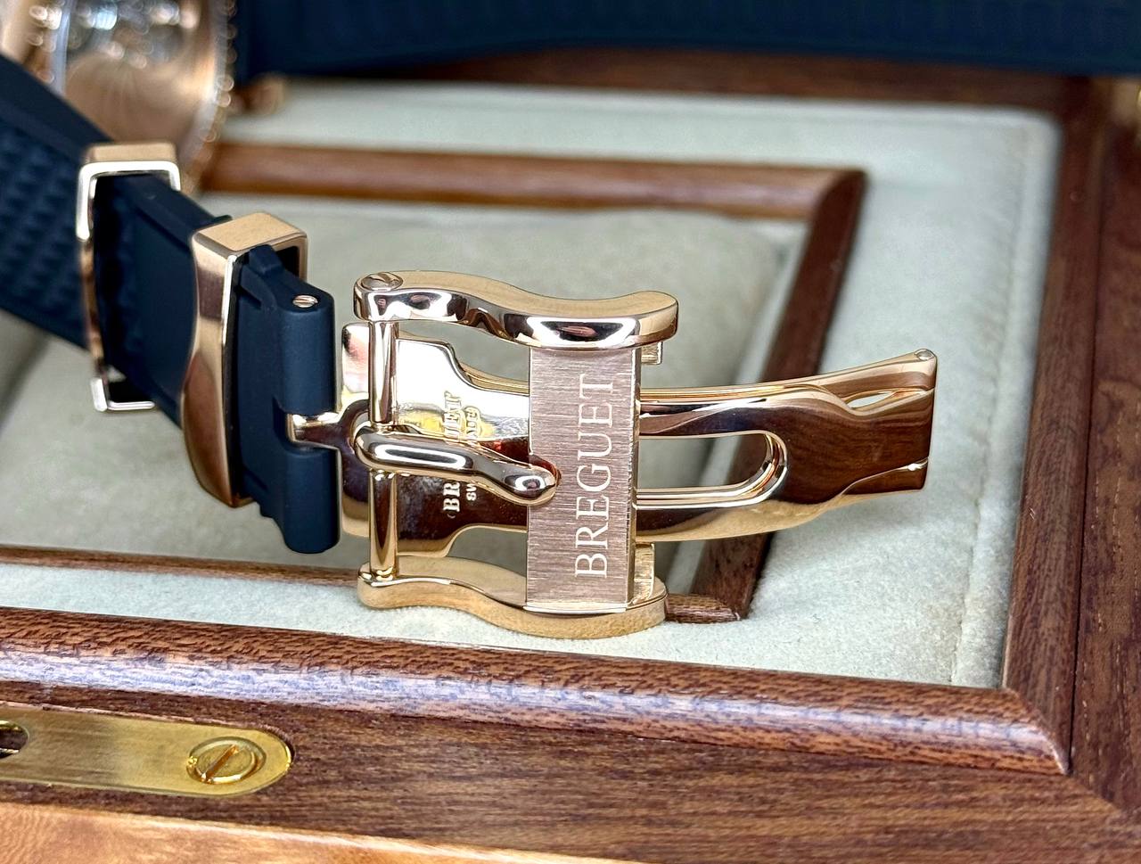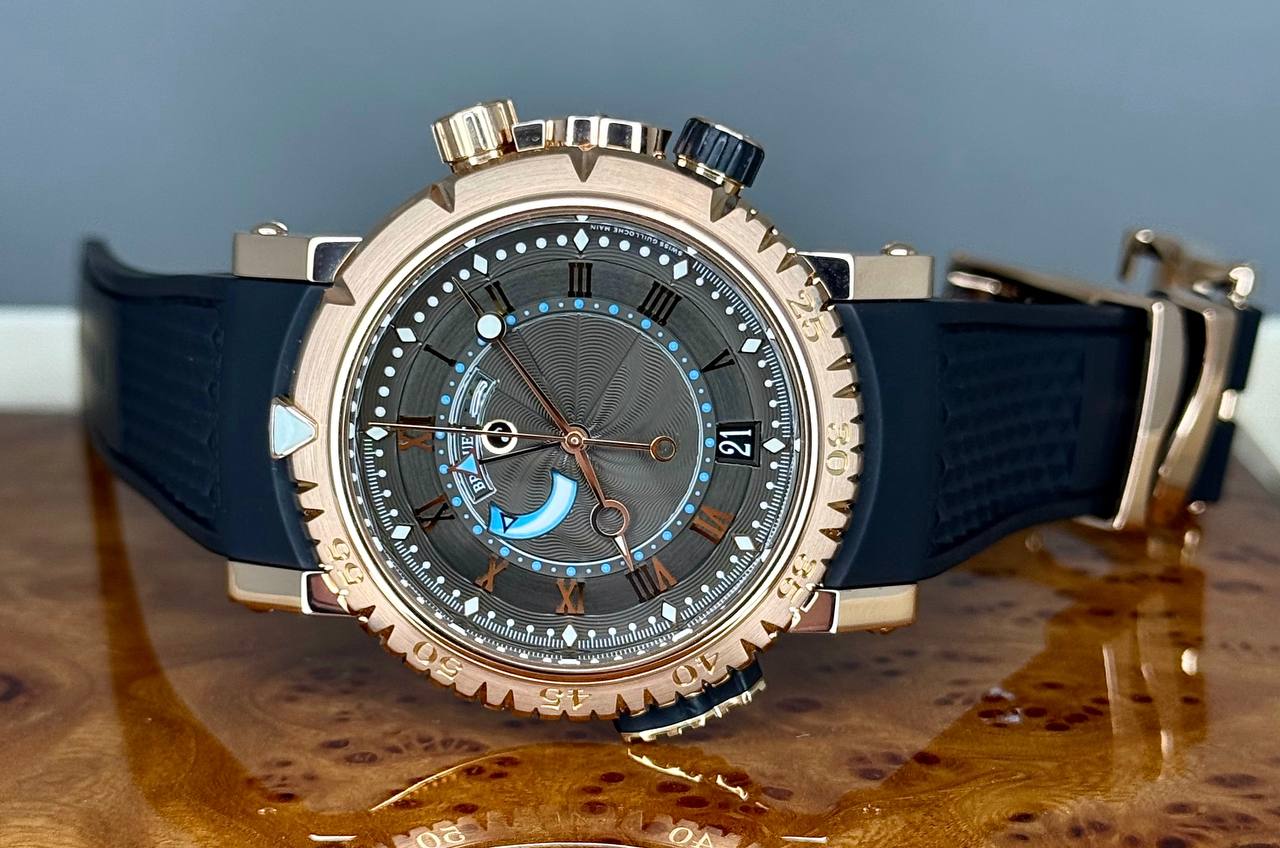 Бренд: Breguet; Кому: Мужские; Состояние: Как новые; Механизм: Механика с автоподзаводом; Ремешок: Каучук; Материал: Золото; Стекло: Сапфировое; Форма: Круг; Застежка: Раскладывающаяся; Материал застежки: Золото; Комплектация: Полный комплект; Год: 2013; Водонепроницаемость : 300 м; Запас хода: 45 ч; Калибр: 519R; Страна: Швейцария; Цвет ремешка: Черный; Циферблат: Черный гильошированный; Размер корпуса: 45 мм; Функции: Дата, часы, минуты, секунды, будильник, индикатор запаса будильника;