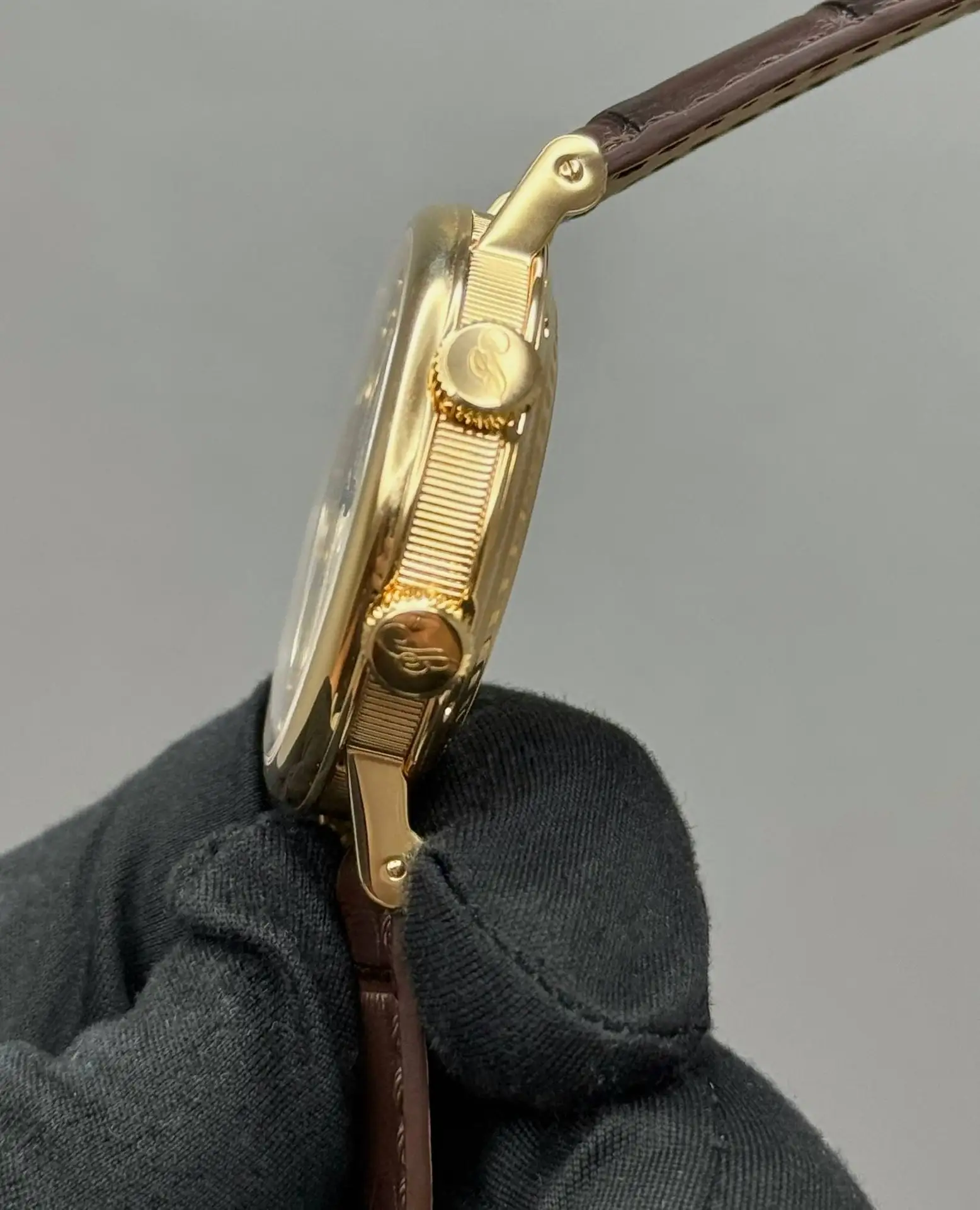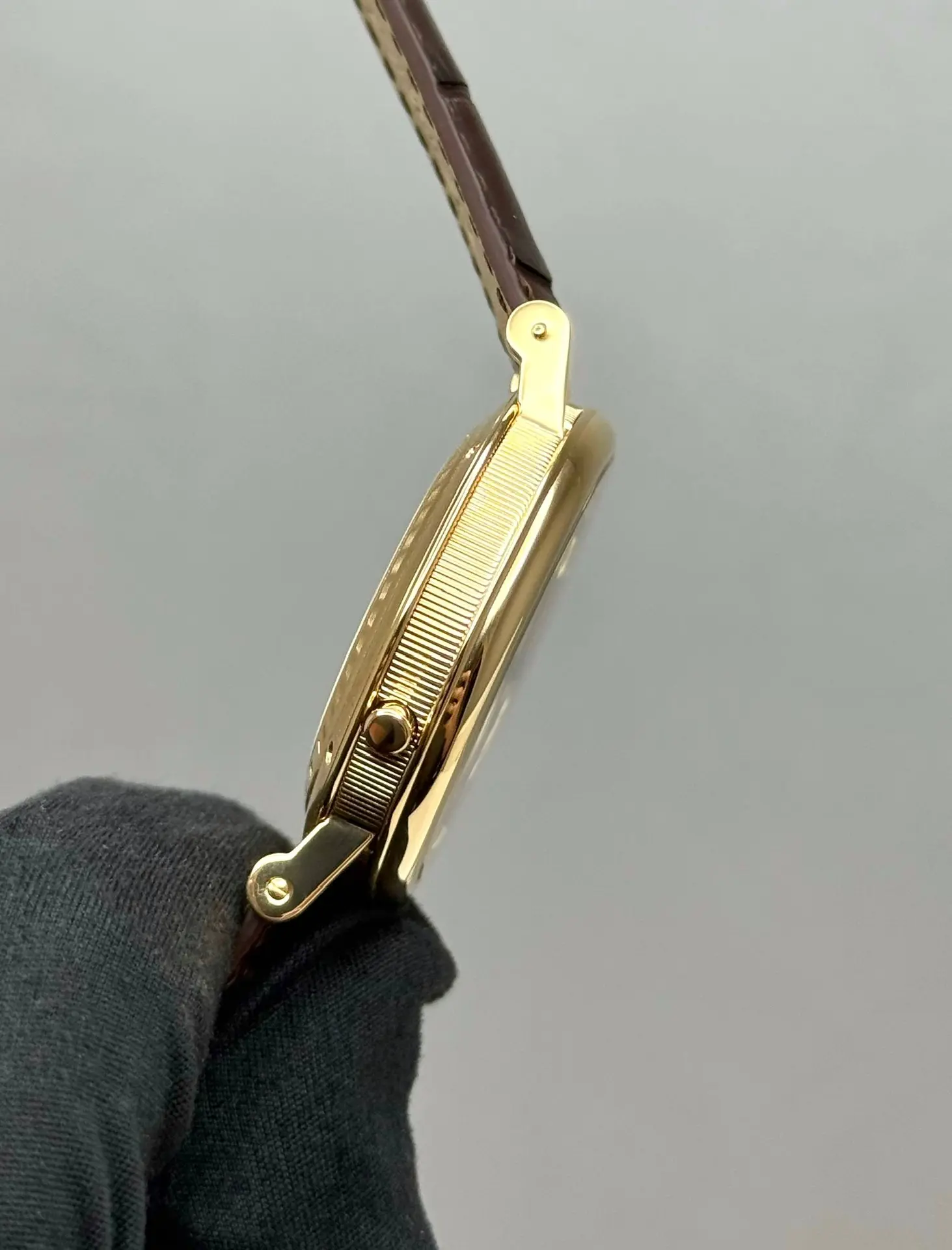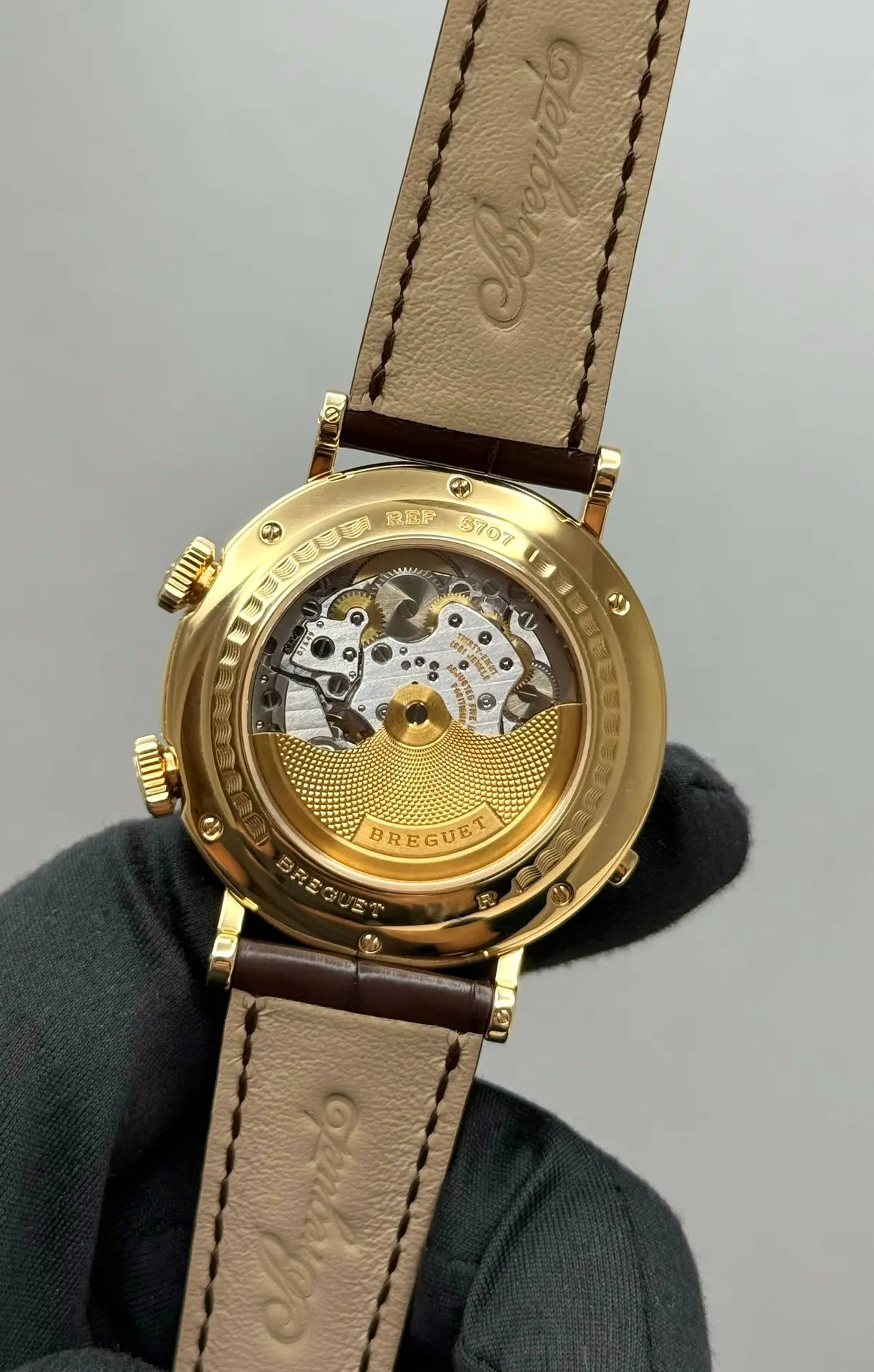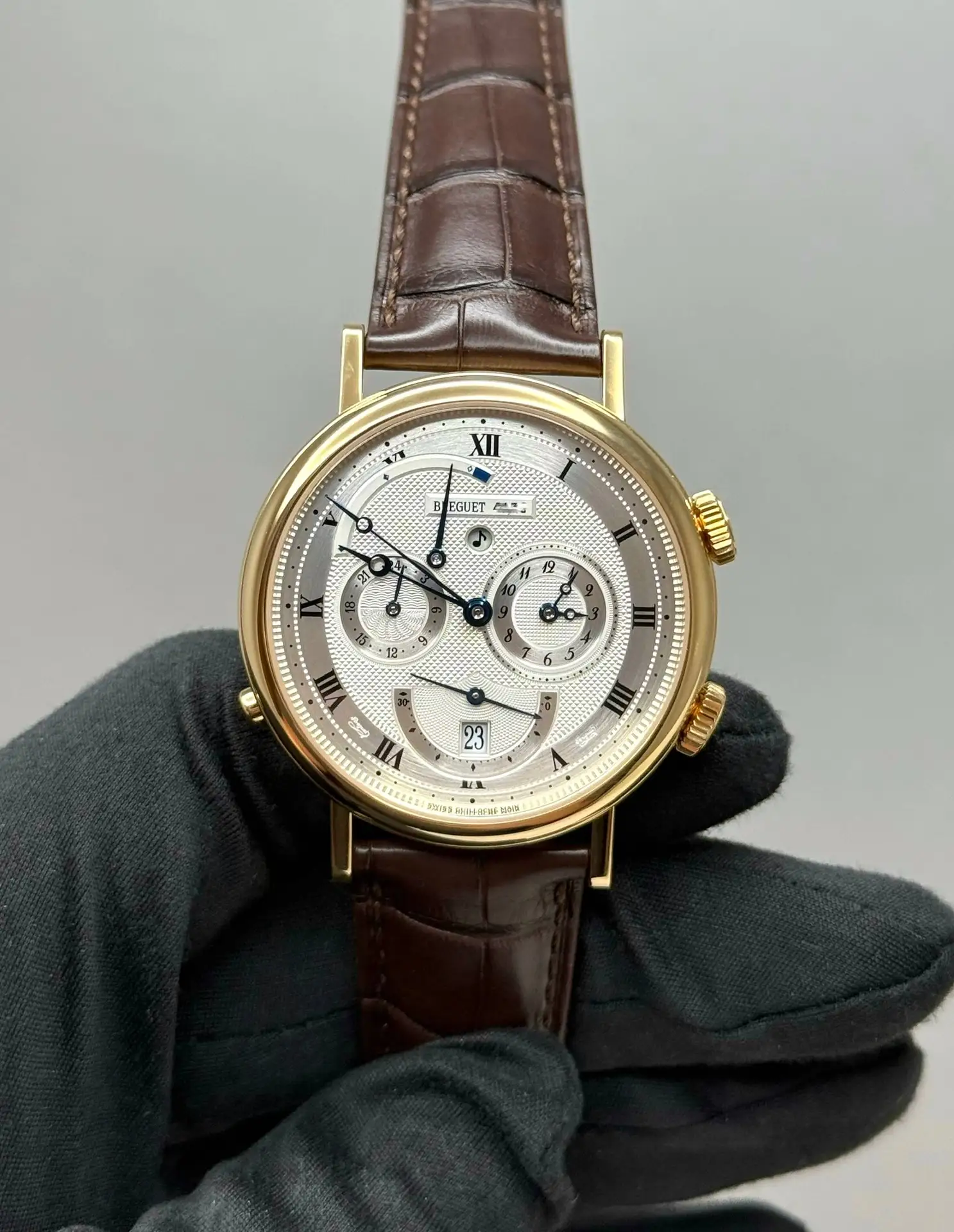 Бренд: Breguet; Кому: Мужские; Состояние: С пробегом; Механизм: Механика с автоподзаводом; Ремешок: Кожа; Материал: Золото; Стекло: Сапфировое; Форма: Круг; Застежка: Раскладывающаяся; Материал застежки: Золото; Комплектация: Документы; Год: 2006; Вес: 103.8 гр; Запас хода: 45 ч; Калибр: 519F; Водонепроницаемость : 50 м; Страна: Швейцария; Цвет ремешка: Коричневый; Циферблат: Серый гильошированный; Размер ремня: 24.5 см; Размер корпуса: 39 мм; Функции: Дата, часы, минуты, секунды, будильник, второй часовой пояс;