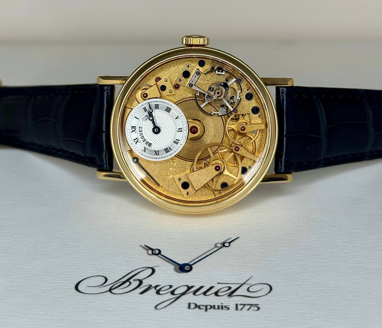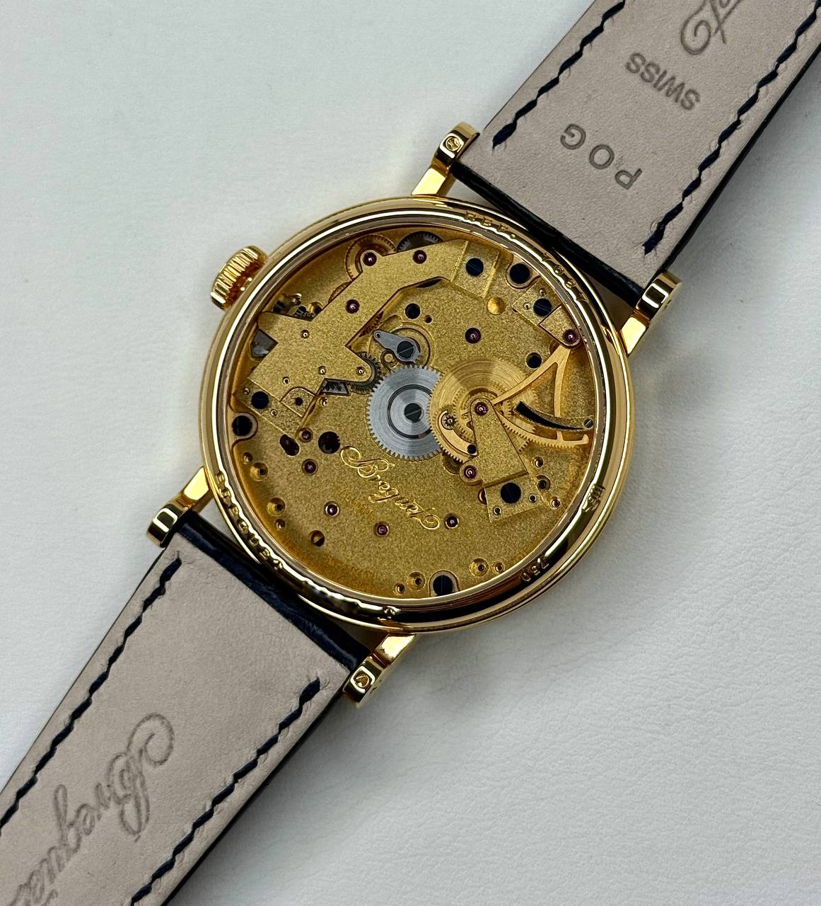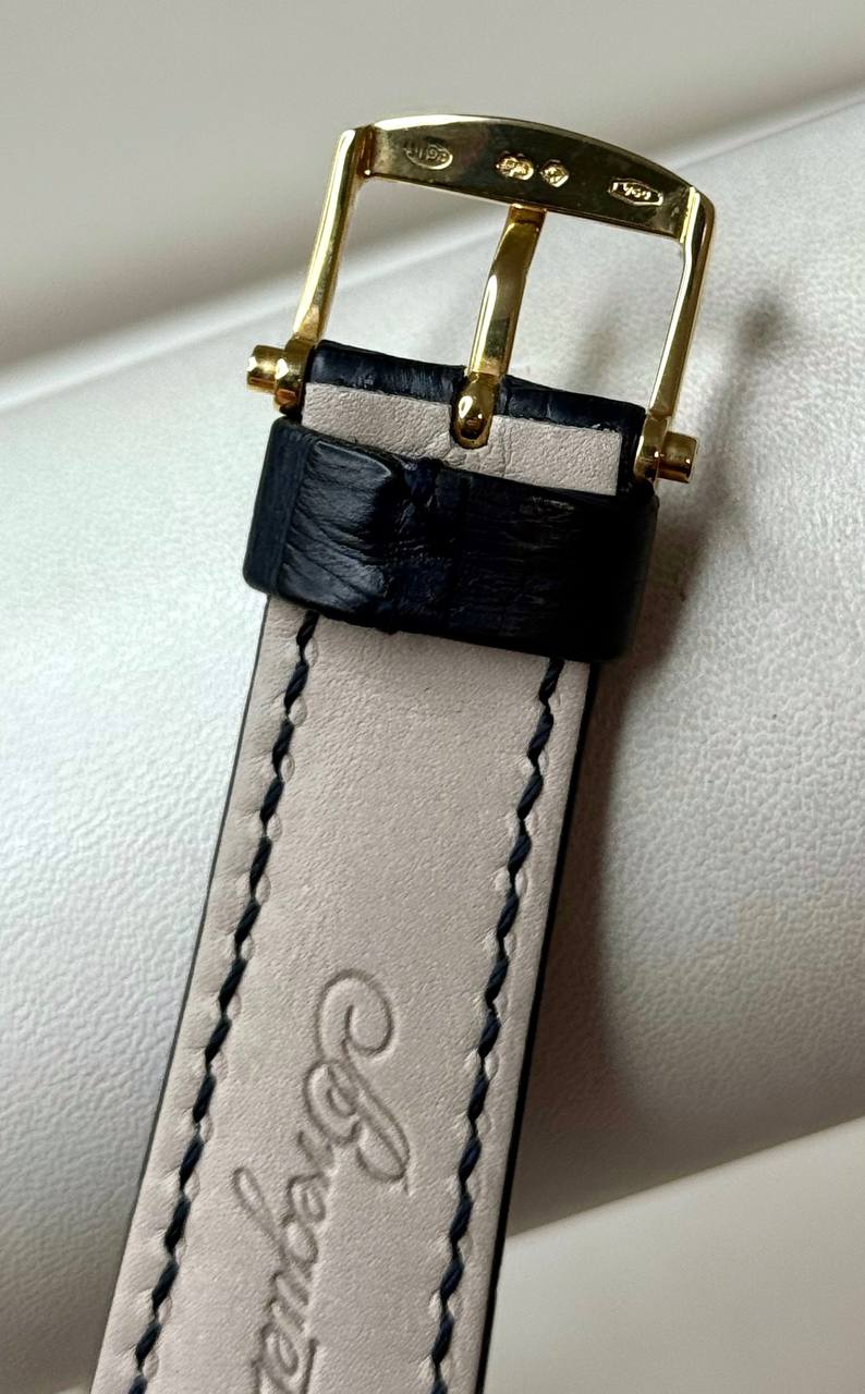 Бренд: Breguet; Кому: Мужские; Состояние: Как новые; Механизм: С ручным заводом; Ремешок: Кожа; Материал: Золото; Стекло: Сапфировое; Форма: Круг; Застежка: Пряжка; Материал застежки: Золото; Комплектация: Документы; Вес: 68.10 гр; Водонепроницаемость : 30 м; Запас хода: 50 ч; Калибр: 507DR; Страна: Швейцария; Цвет ремешка: Темно-синий; Циферблат: Золотистый; Размер ремня: 24 см; Размер корпуса: 37 мм; Функции: Часы, минуты, индикатор запаса хода;