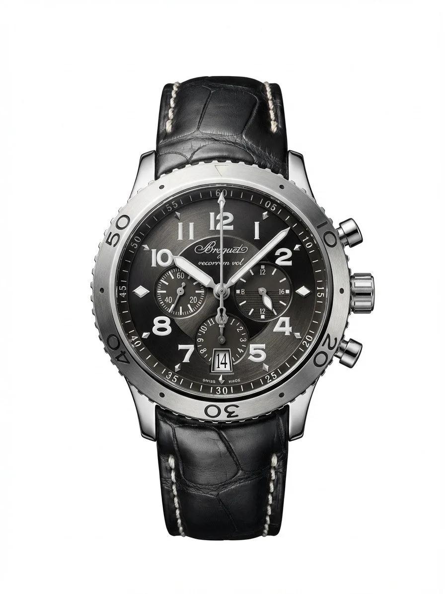 Бренд: Breguet; Кому: Мужские; Состояние: С пробегом; Механизм: Механика с автоподзаводом; Ремешок: Кожа; Материал: Сталь; Стекло: Сапфировое; Форма: Круг; Застежка: Раскладывающаяся; Материал застежки: Сталь; Комплектация: Документы, переноска; Водонепроницаемость : 100 м; Запас хода: 48 ч; Калибр: 584 Q; Страна: Швейцария; Циферблат: Черный; Размер корпуса: 44 мм; Функции: Дата, часы, минуты, секунды, хронограф Flyback, указатель день/ночь;