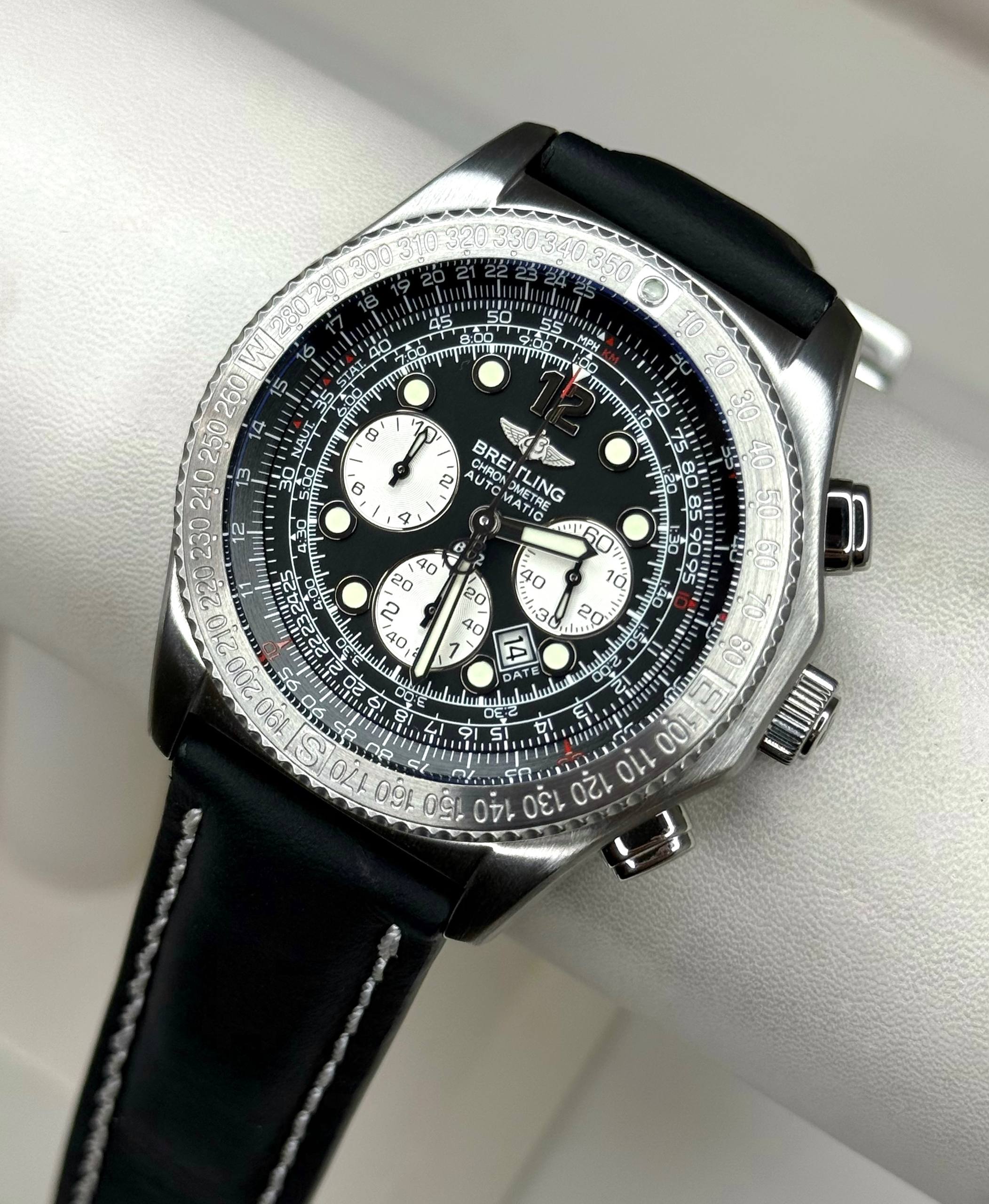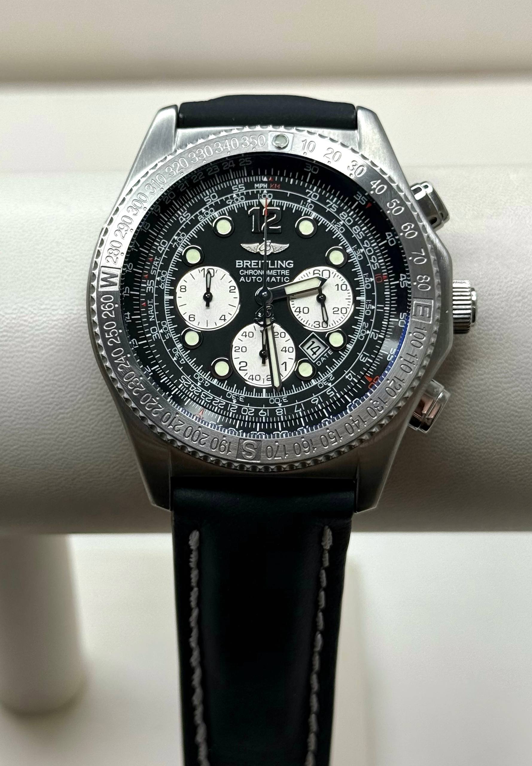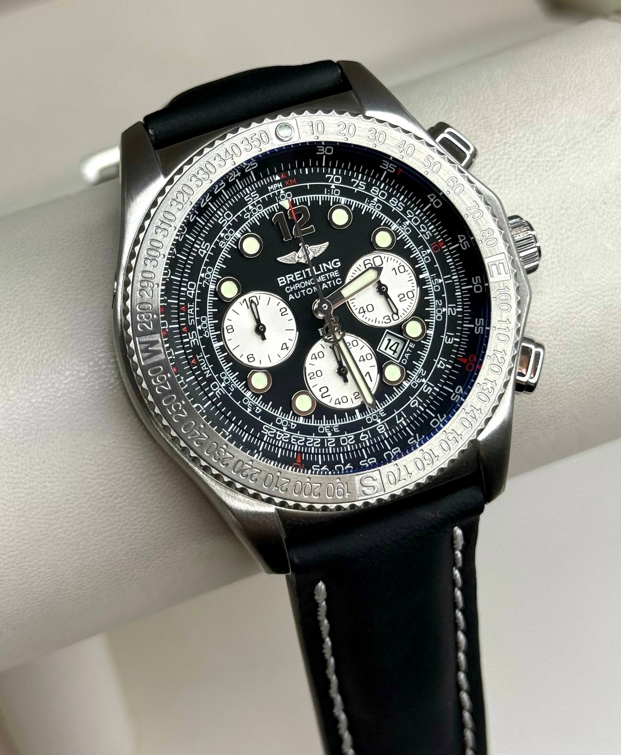 Бренд: Breitling; Кому: Мужские; Состояние: С пробегом; Механизм: Механика с автоподзаводом; Ремешок: Кожа; Материал: Сталь; Стекло: Сапфировое; Форма: Круг; Застежка: Раскладывающаяся; Материал застежки: Сталь; Страна: Швейцария; Циферблат: Черный; Размер ремня: 24.5 см; Размер корпуса: 43 мм; Функции: Дата, часы, минуты, секунды, хронограф, логарифмическая линейка;