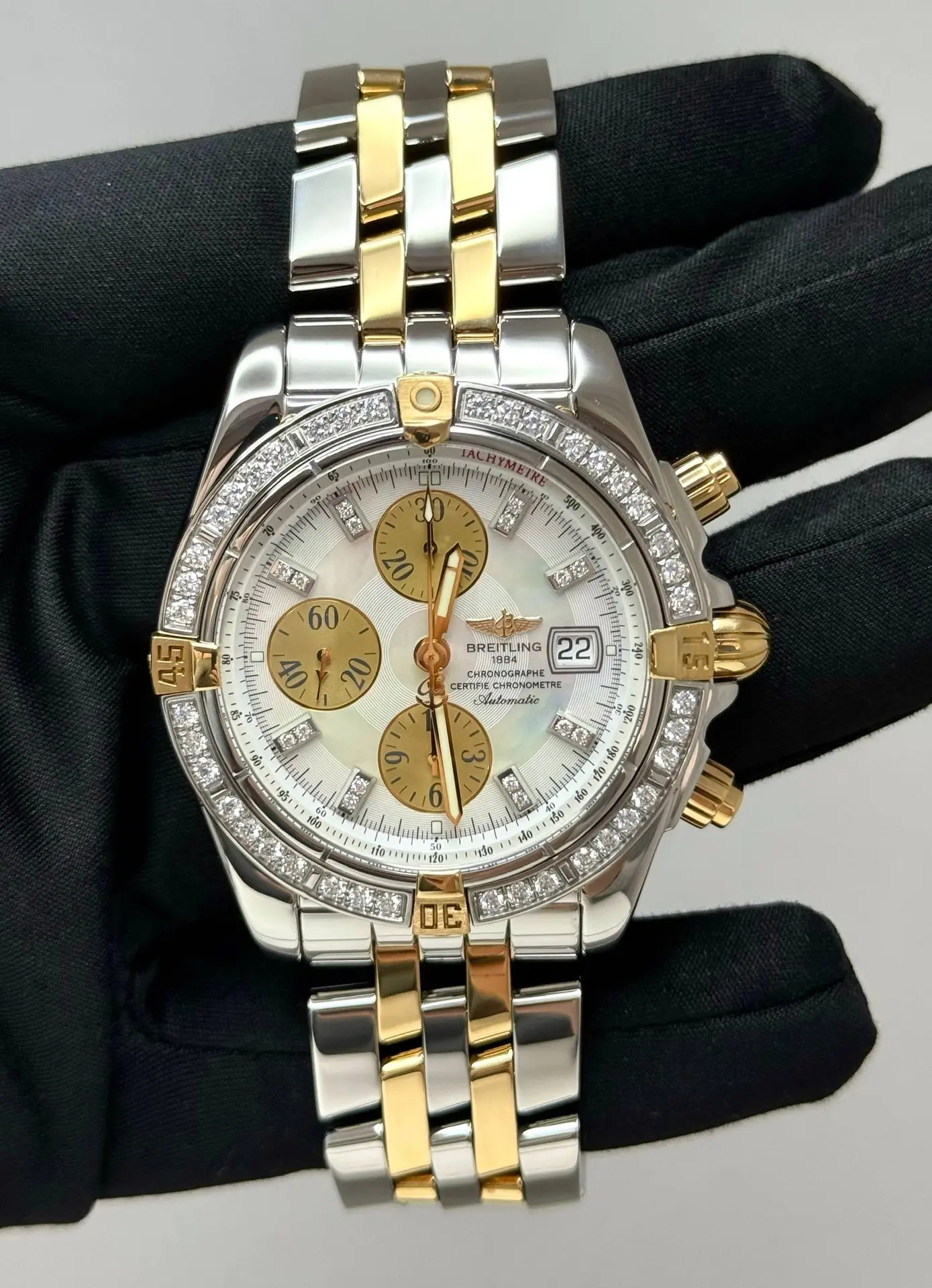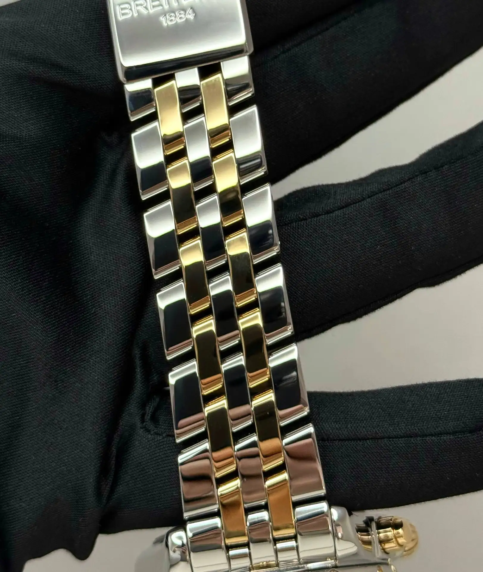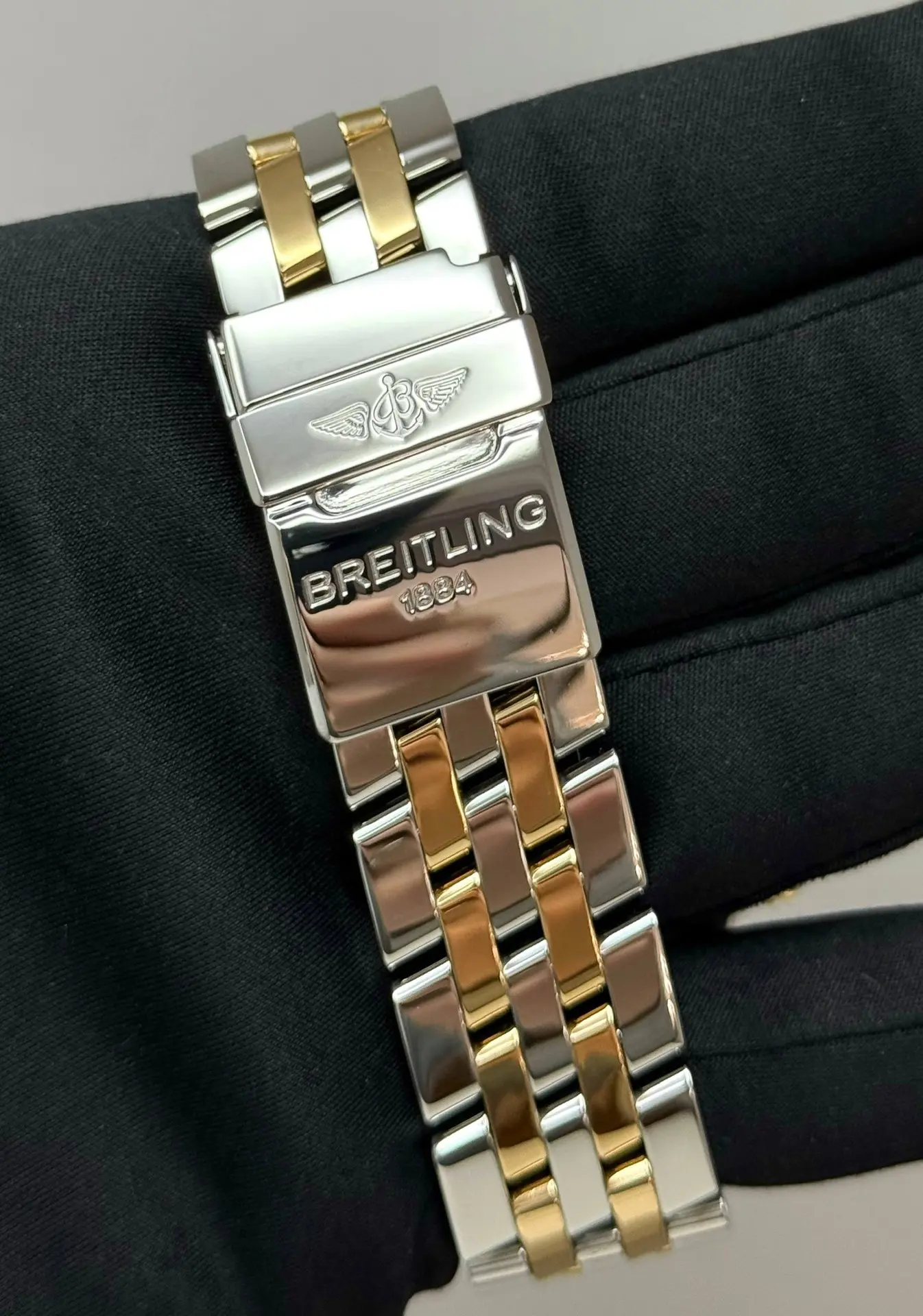 Бренд: Breitling; Кому: Мужские; Состояние: Как новые; Механизм: Механика с автоподзаводом; Ремешок: Золото/сталь; Материал: Золото/сталь; Стекло: Сапфировое; Форма: Круг; Застежка: Раскладывающаяся; Материал застежки: Сталь; Комплектация: Переноска; Водонепроницаемость : 300 м; Запас хода: 42 ч; Калибр: Breitling 13; Страна: Швейцария; Циферблат: Перламутровый; Размер браслета: 18 см; Функции: Дата, часы, минуты, секунды, хронограф, тахиметр;