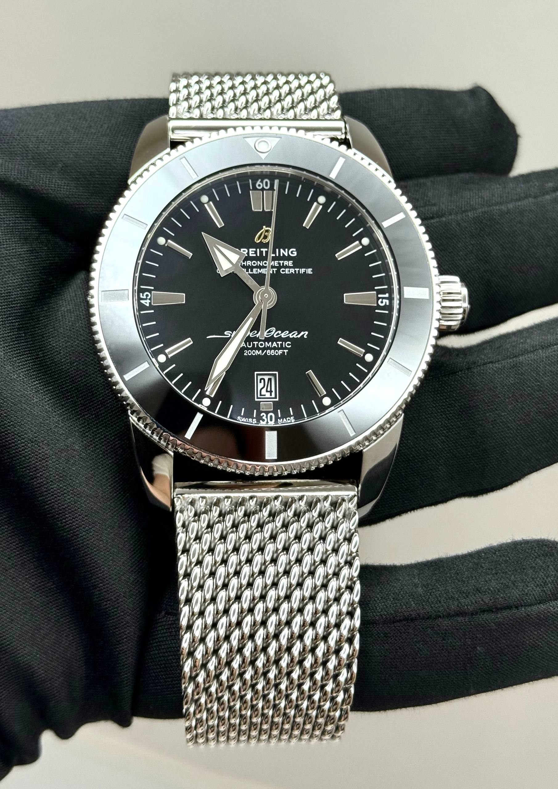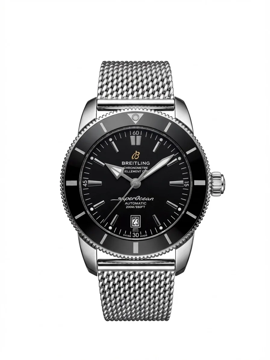 Бренд: Breitling; Кому: Мужские; Состояние: Новые; Механизм: Механика с автоподзаводом; Ремешок: Сталь; Материал: Сталь; Стекло: Сапфировое; Форма: Круг; Застежка: Раскладывающаяся; Материал застежки: Сталь; Комплектация: Коробка, документы; Год: 2025; Водонепроницаемость : 200 м; Запас хода: 70 ч; Страна: Швейцария; Безель: Керамика; Циферблат: Черный; Размер браслета: 19.5 см; Размер корпуса: 46 мм; Функции: Дата, часы, минуты, секунды;