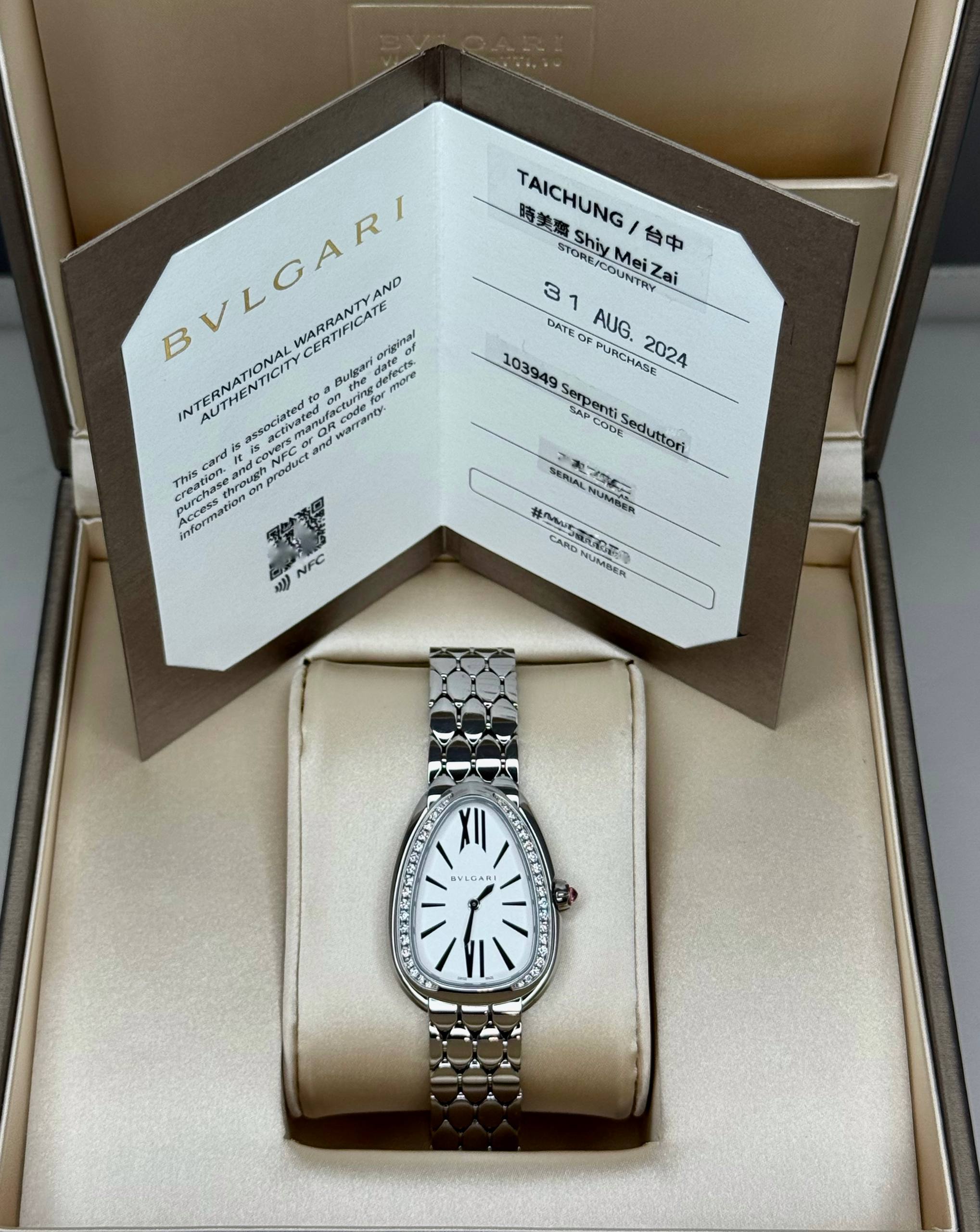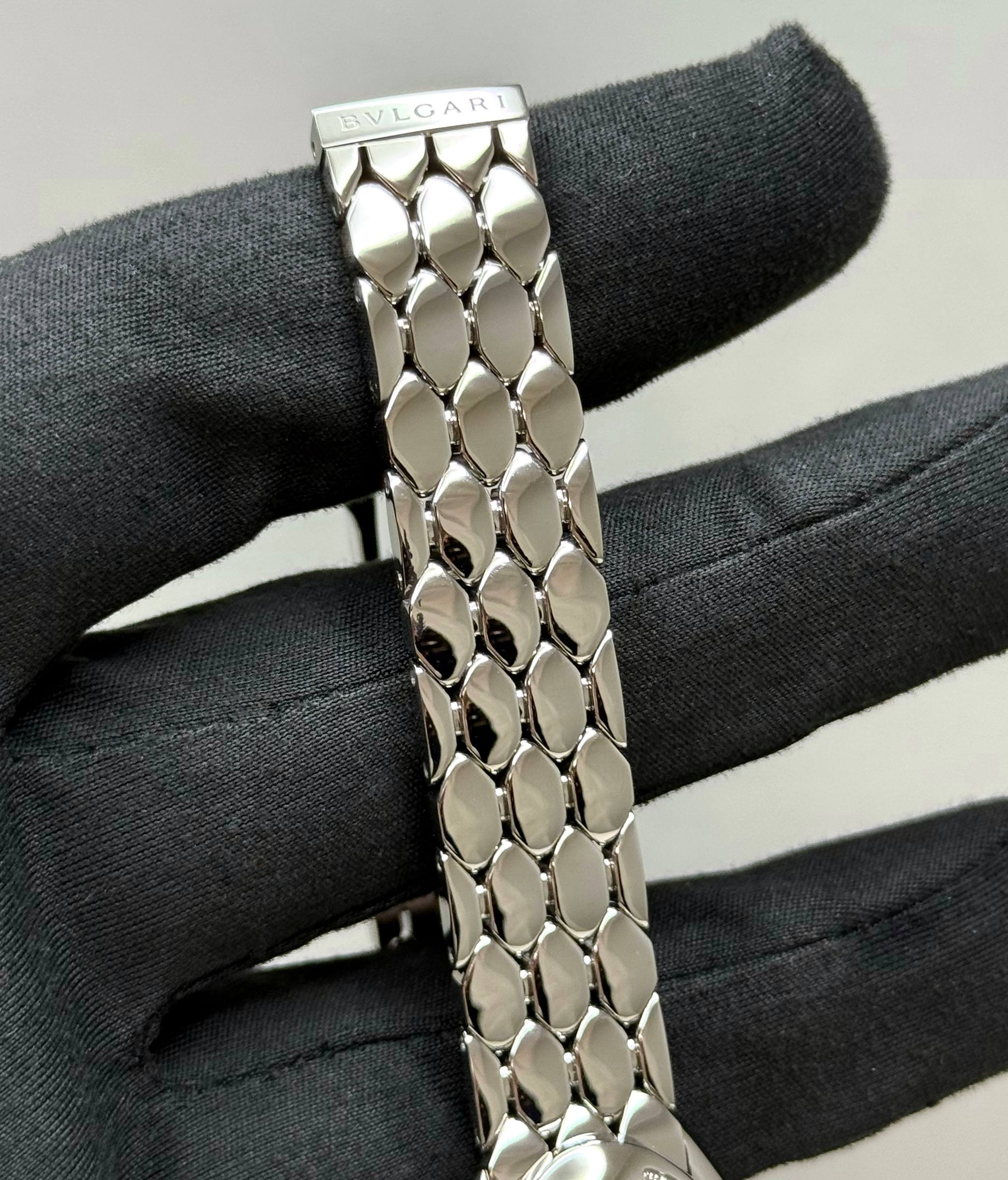 Бренд: Bvlgari; Кому: Женские; Состояние: Новые; Механизм: Кварц; Ремешок: Сталь; Материал: Сталь; Стекло: Сапфировое; Форма: Круг; Застежка: Раскладывающаяся; Материал застежки: Сталь; Комплектация: Полный комплект; Год: 2024; Водонепроницаемость : 30 м; Циферблат: Белый; Браслет: 15.5 см; Функции: Часы, минуты;