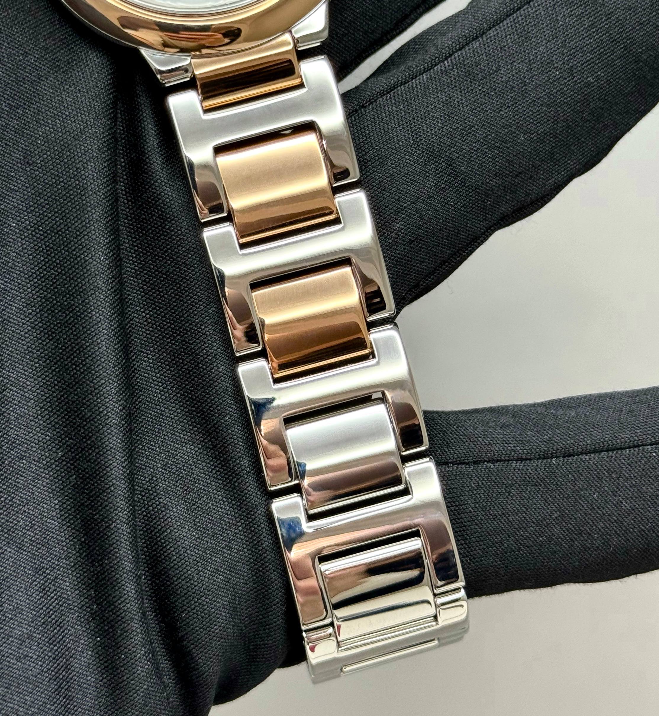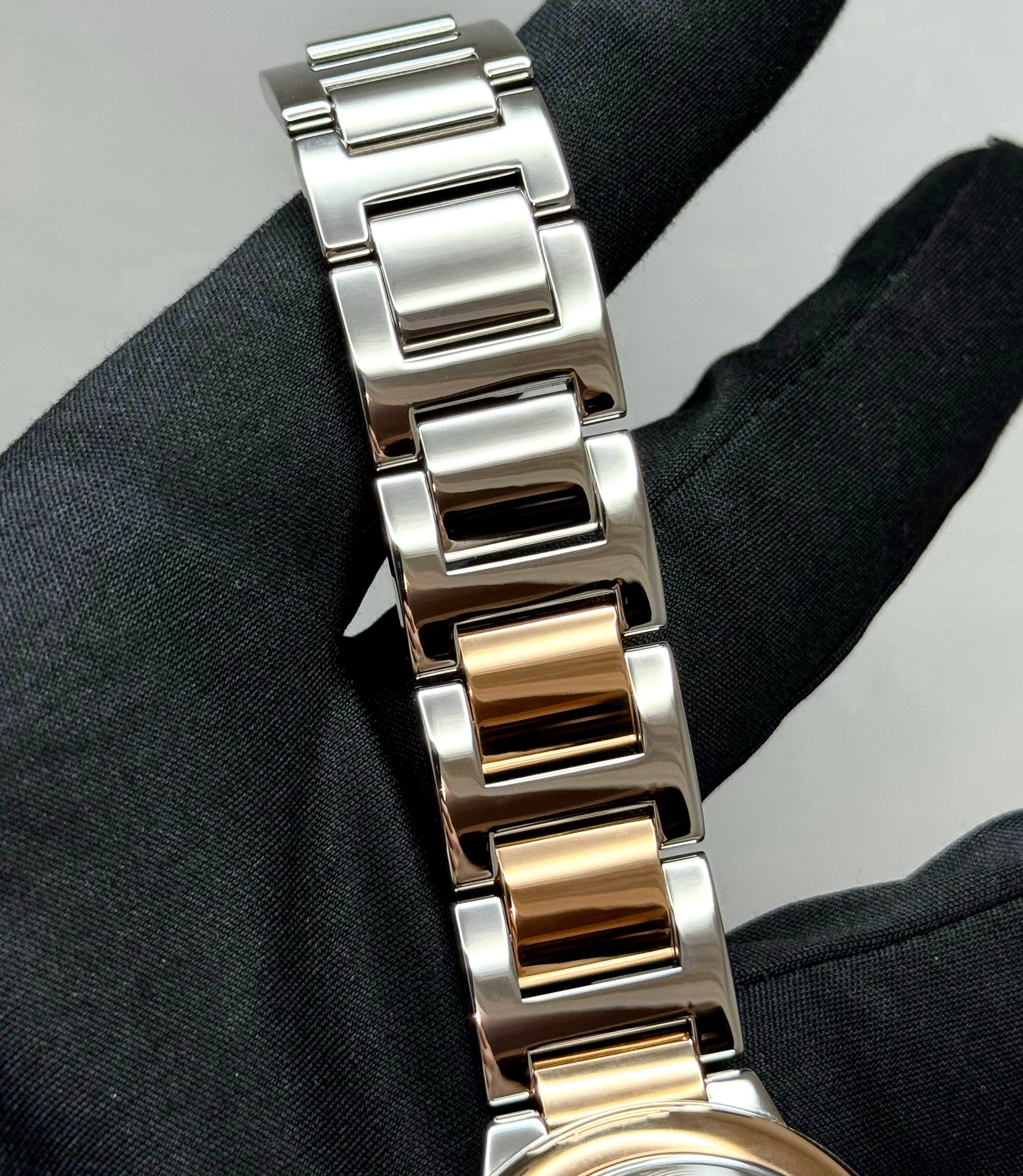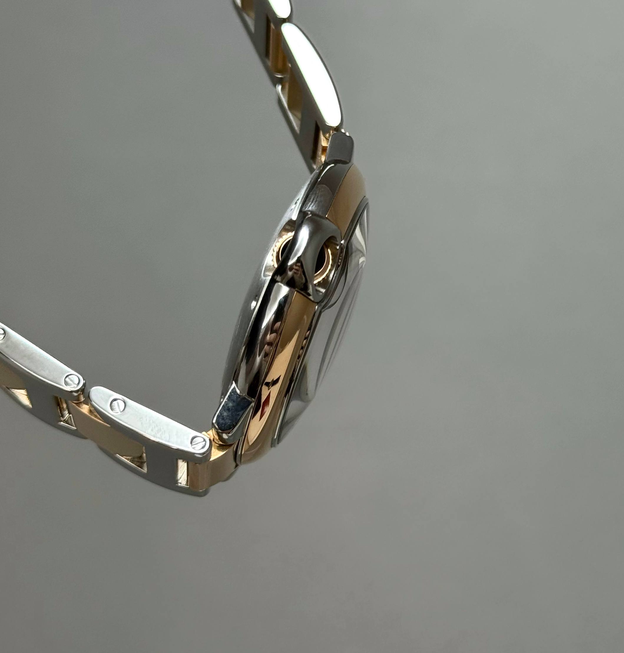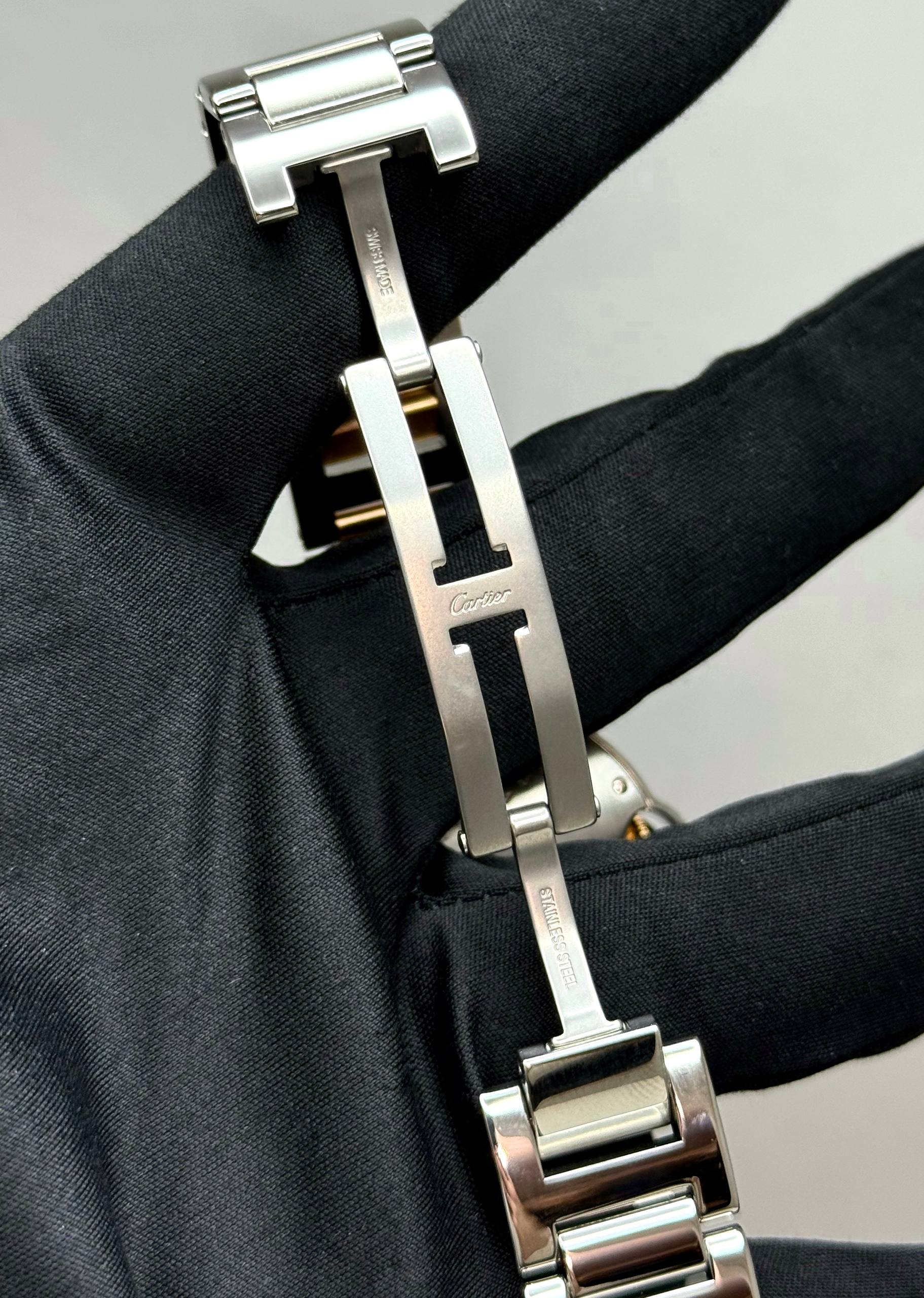 Бренд: Cartier; Кому: Женские; Состояние: Как новые; Механизм: Механика с автоподзаводом; Ремешок: Золото/сталь; Материал: Золото/сталь; Стекло: Сапфировое; Форма: Круг; Застежка: Раскладывающаяся; Материал застежки: Сталь; Комплектация: Коробка, документы; Год: 2019; Водонепроницаемость : 30 м; Запас хода: 48 ч; Циферблат: Серый, 11 белых бриллиантов; Браслет: 19 см; Размер корпуса: 36 мм; Функции: Часы, минуты;