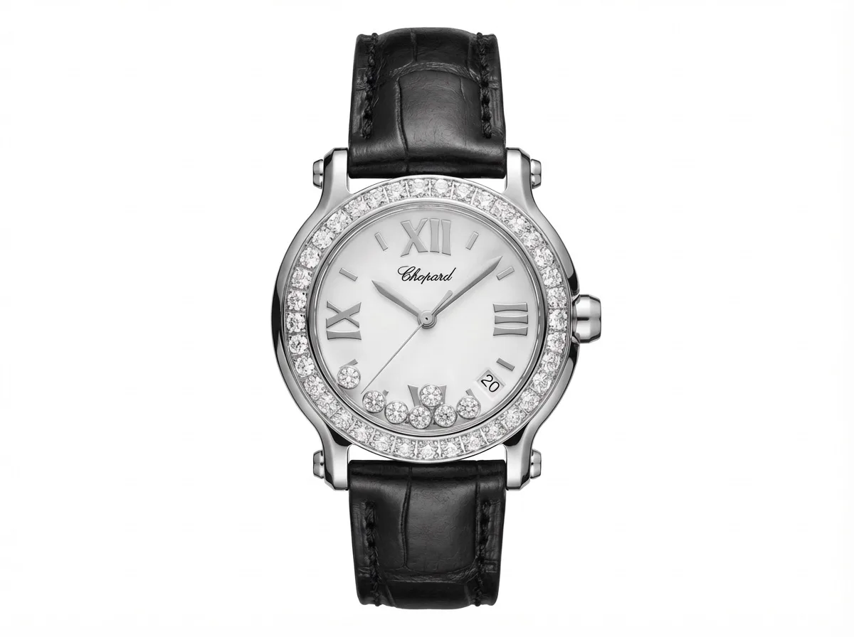 Бренд: Chopard; Кому: Женские; Состояние: Как новые; Механизм: Кварц; Ремешок: Кожа; Материал: Сталь; Стекло: Сапфировое; Форма: Круг; Застежка: Пряжка; Материал застежки: Сталь; Комплектация: Коробка; Материал безеля: Сталь, дополнительно инкрустирован белыми бриллиантами; Водонепроницаемость : 30 м; Цвет ремешка: Черный; Циферблат: Белый, 7 плавающих бриллиантов; Размер ремня: 18.5 см; Размер корпуса: 36 мм; Функции: Дата, часы, минуты, секунды;