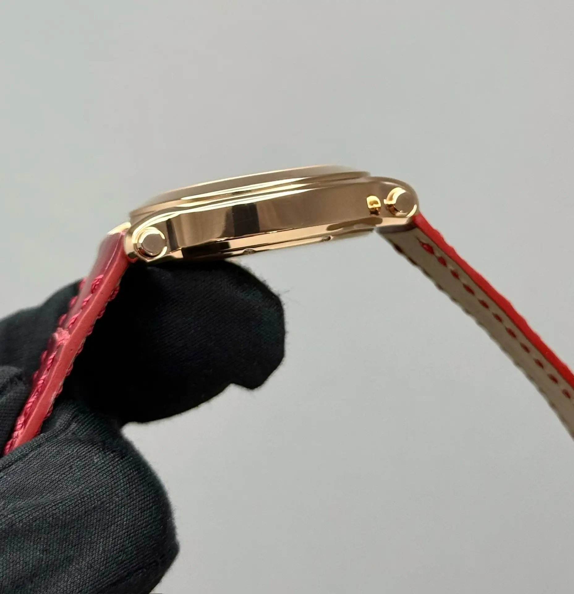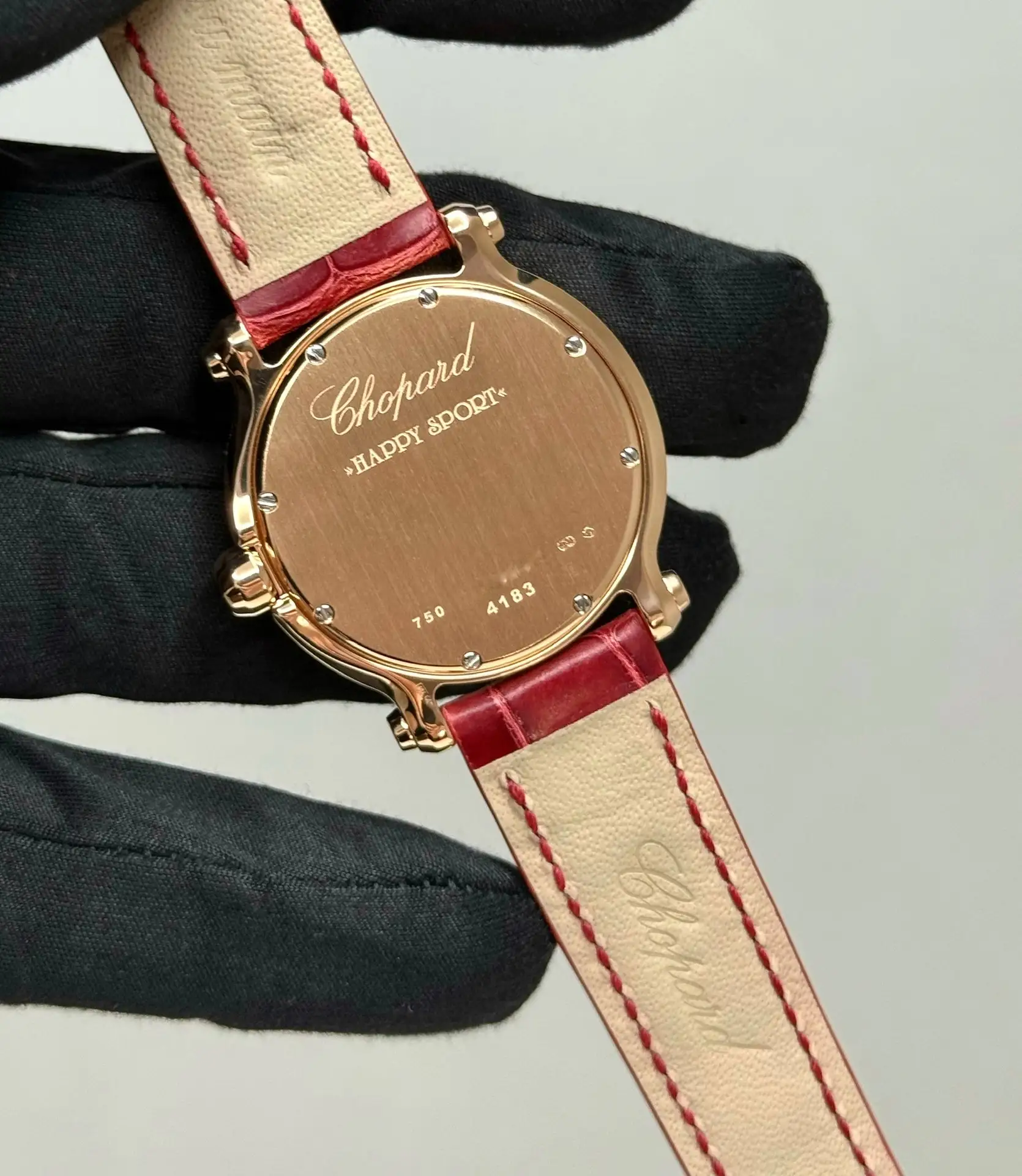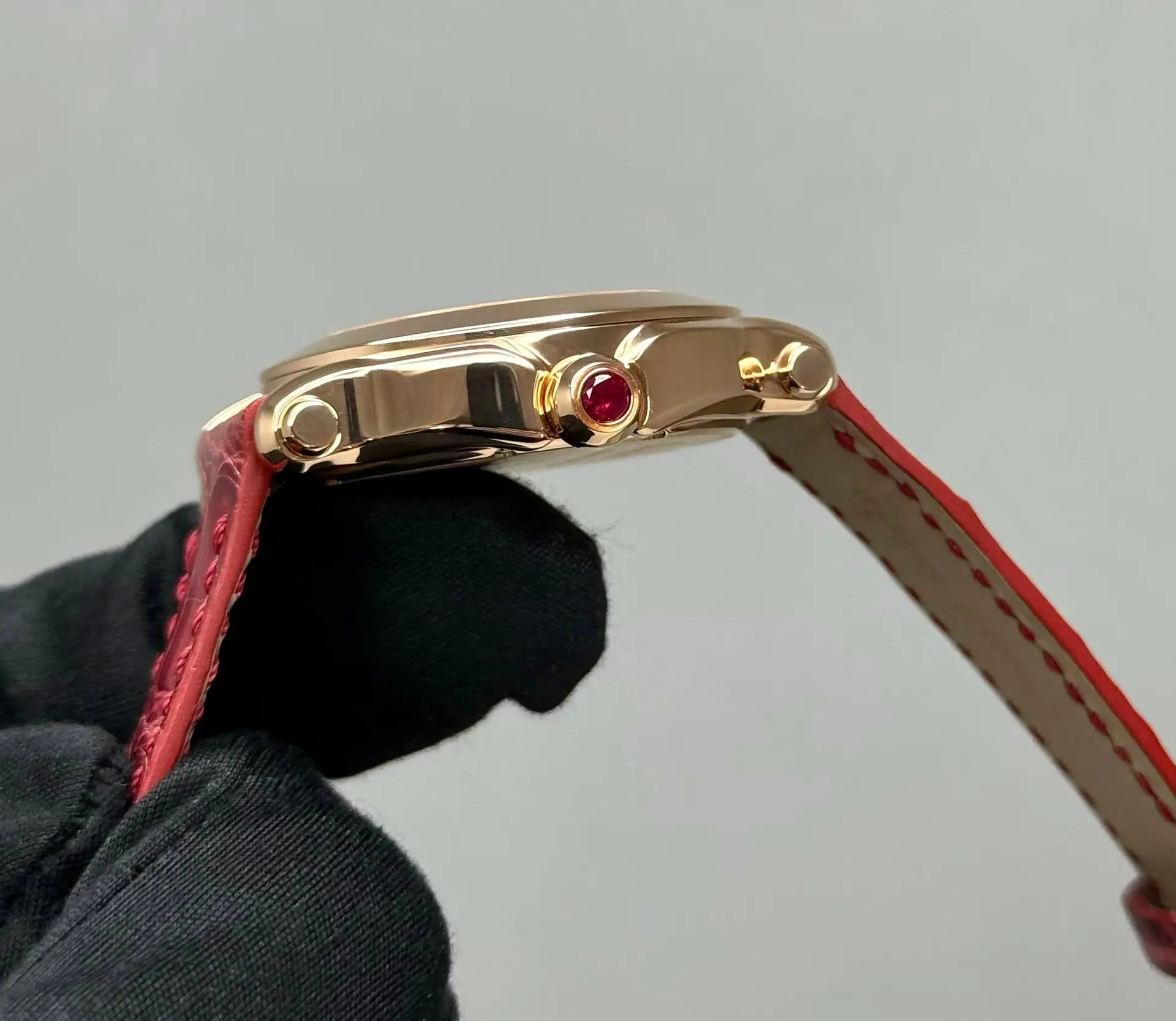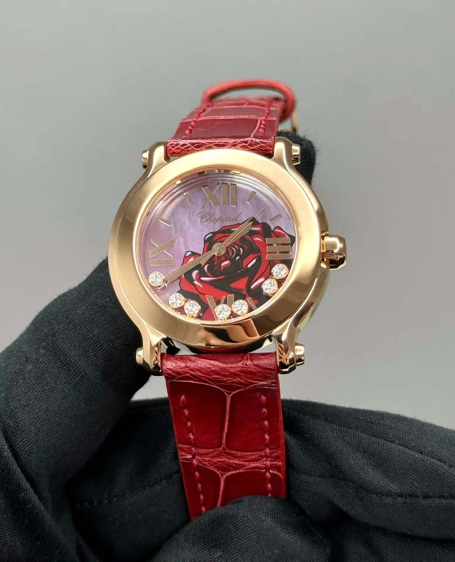 Бренд: Chopard; Кому: Женские; Состояние: Как новые; Механизм: Кварц; Ремешок: Кожа; Материал: Розовое золото; Стекло: Сапфировое; Форма: Круг; Застежка: Пряжка; Материал застежки: Розовое Золото 18K; Комплектация: Переноска; Вес: 87.25 гр; Водонепроницаемость : 30 м; Циферблат: Красный с розовым. 7 плавающих бриллиантов; Размер ремня: 18.5 см; Размер корпуса: 36 мм; Функции: Часы, минуты, секунды;