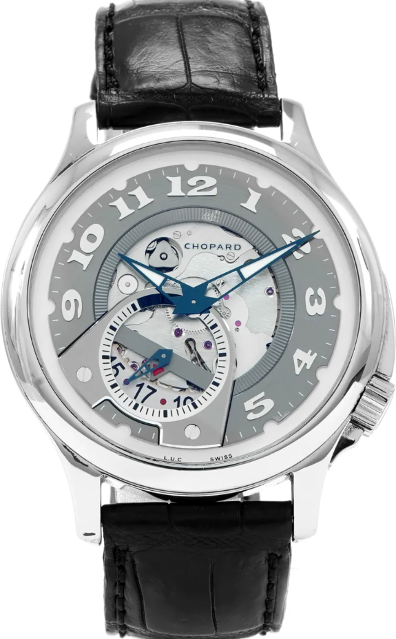 Бренд: Chopard; Кому: Мужские; Состояние: Как новые; Механизм: Механика с автоподзаводом; Ремешок: Кожа; Материал: Сталь; Стекло: Сапфировое; Форма: Круг; Застежка: Раскладывающаяся; Материал застежки: Сталь; Комплектация: Инструкция, переноска; Водонепроницаемость : 30 м; Калибр: 96T; Страна: Швейцария; Циферблат: Серый скелетонизированный; Размер ремня: 23 см; Размер корпуса: 41 мм; Функции: Дата, часы, минуты, секунды;