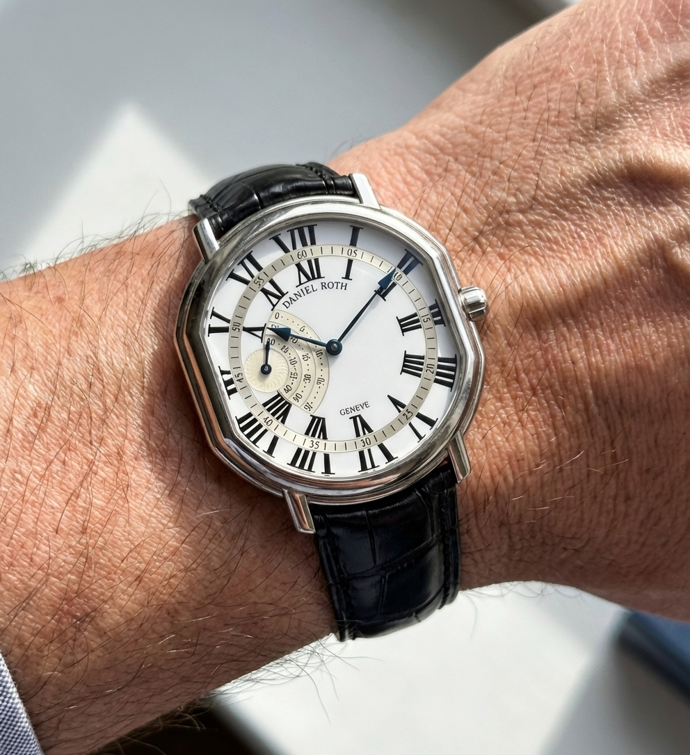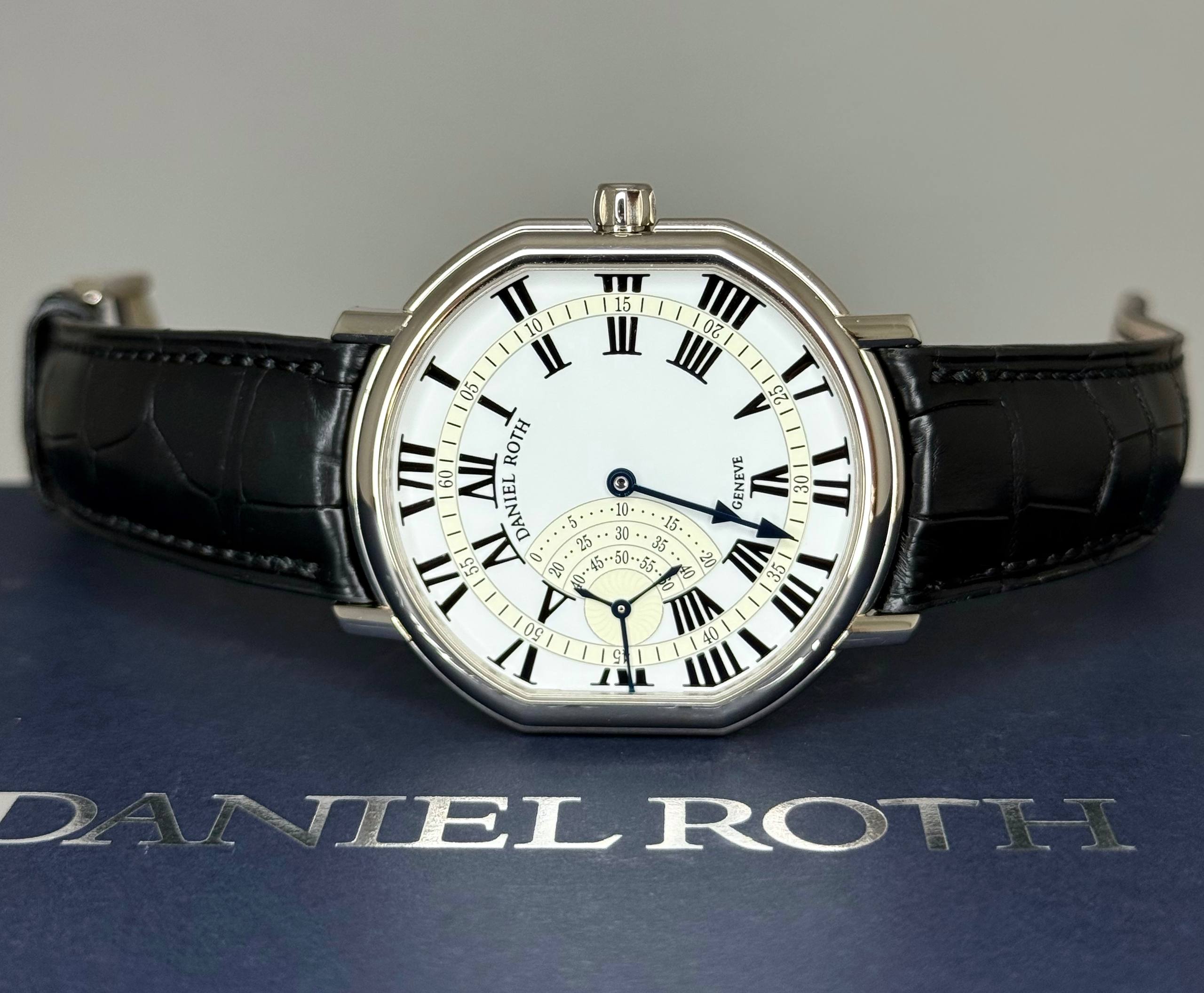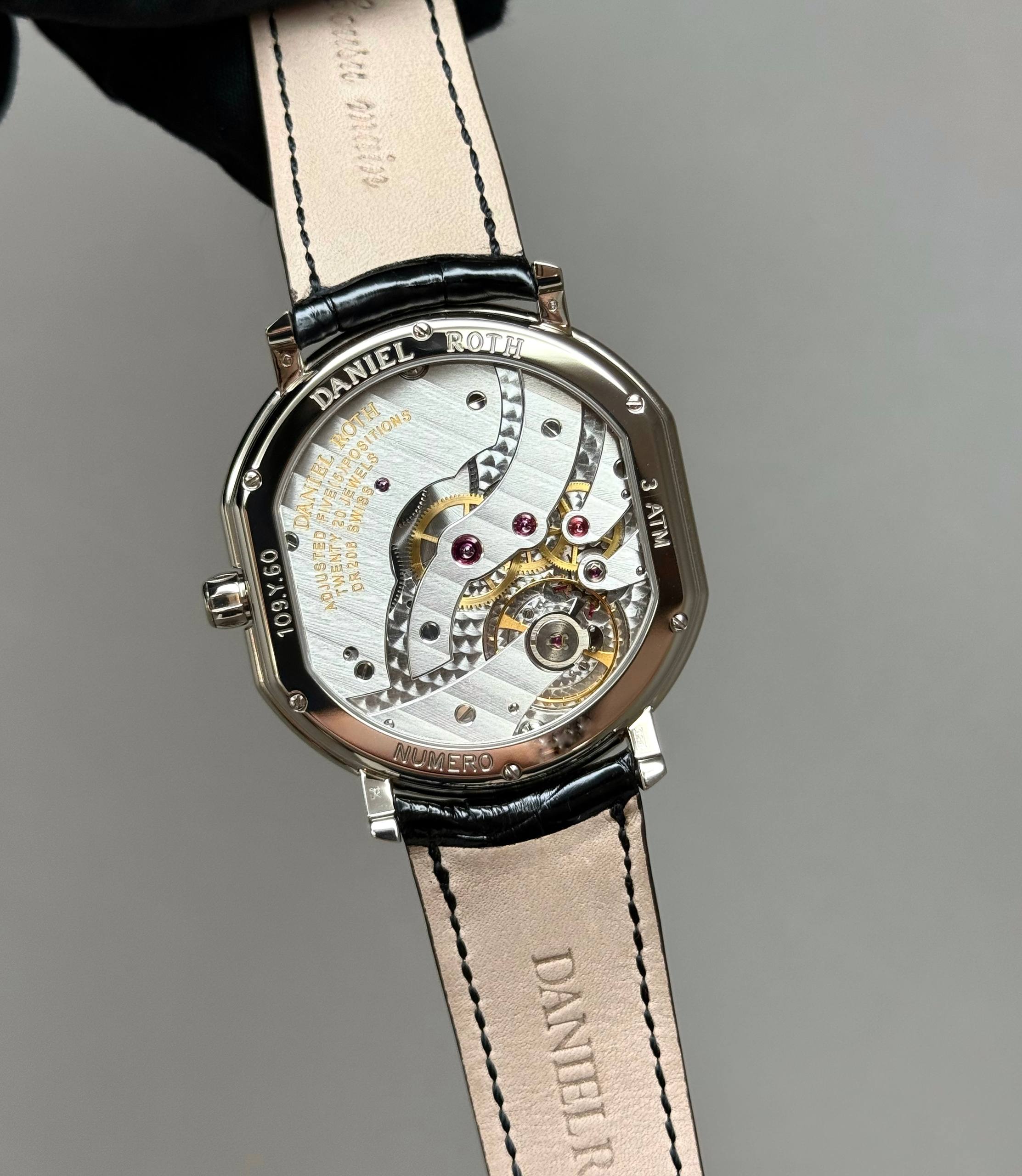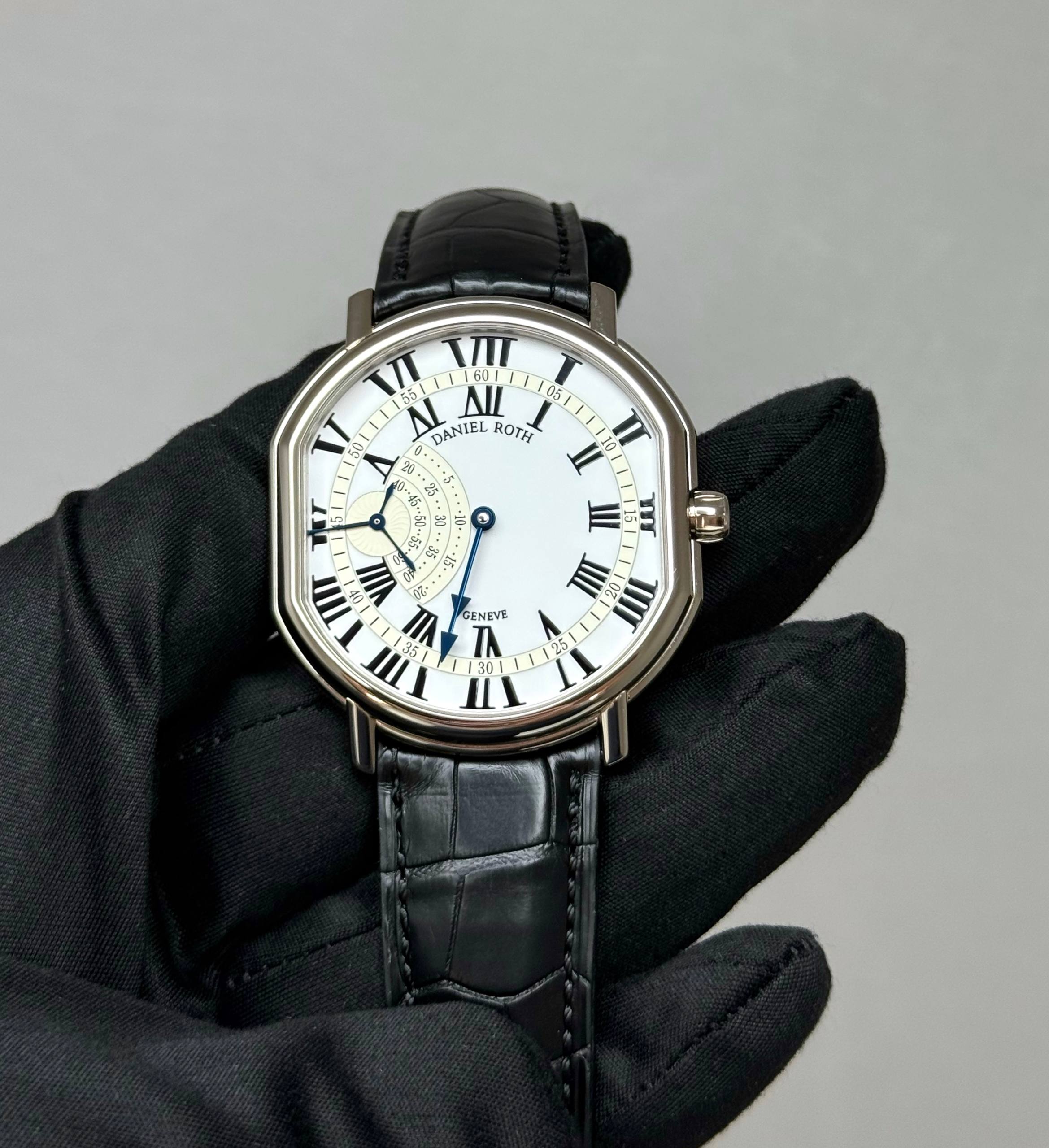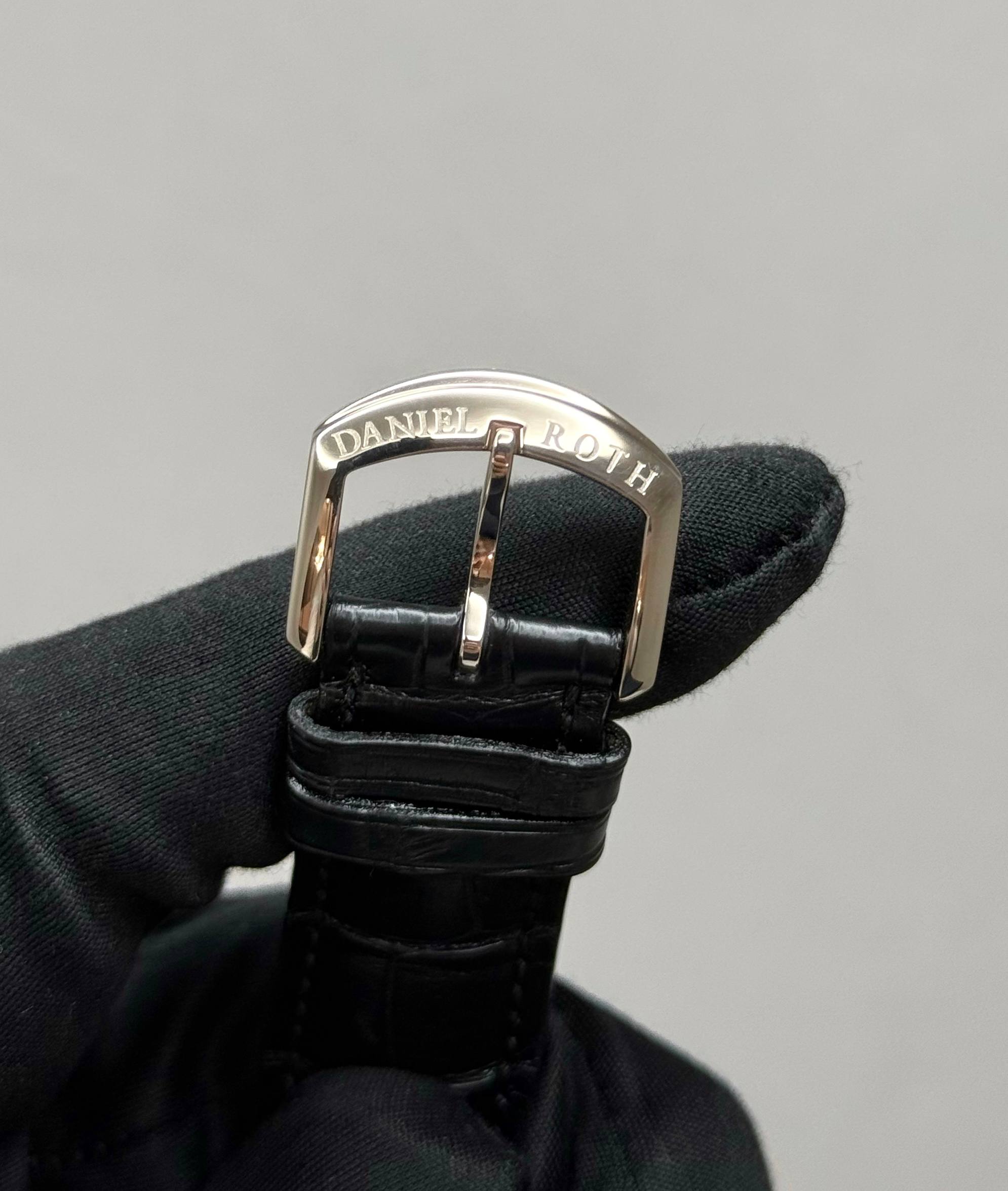 Бренд: Daniel Roth; Кому: Мужские; Состояние: Новые; Механизм: С ручным заводом; Ремешок: Кожа; Материал: Белое золото; Стекло: Сапфировое; Форма: Бочка; Застежка: Пряжка; Материал застежки: Белое золото; Комплектация: Коробка; Вес: 70.75 гр; Водонепроницаемость : 30 м; Страна: Швейцария; Циферблат: Белый; Размер ремня: 22 см; Размер корпуса: 41 х 44 мм; Функции: Дата, часы, минуты, секунды;
