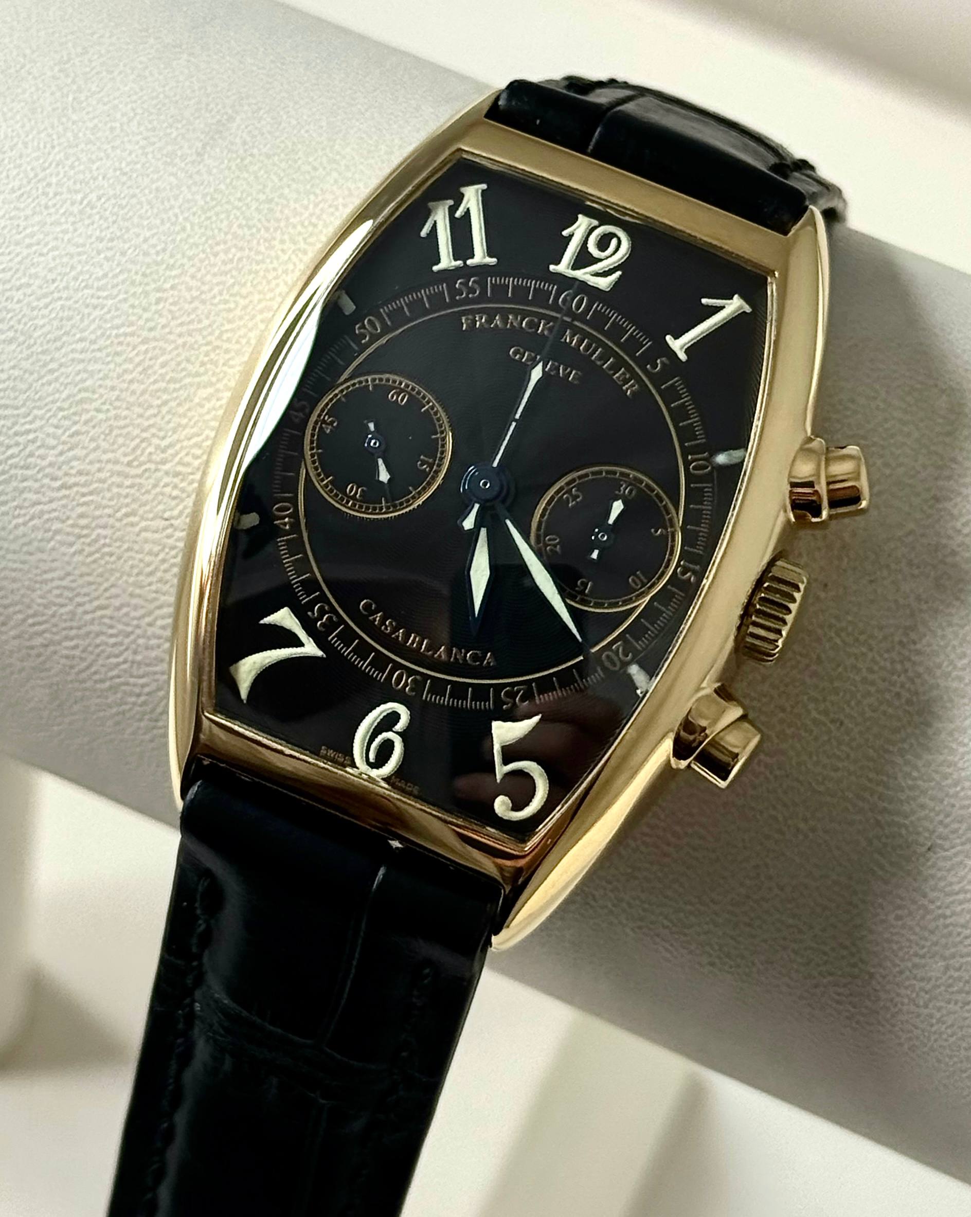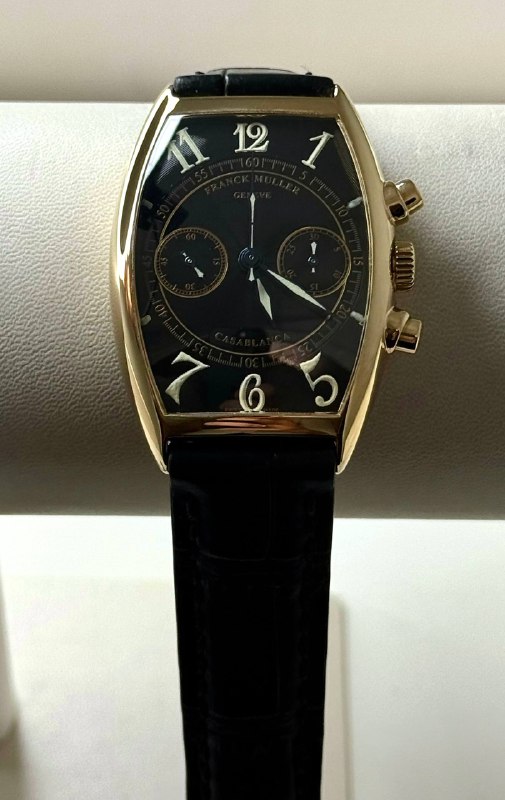 Бренд: Franck Muller; Кому: Мужские; Состояние: Как новые; Механизм: С ручным заводом; Ремешок: Кожа; Материал: Золото; Стекло: Сапфировое; Форма: Бочка; Застежка: Пряжка; Материал застежки: Золото; Комплектация: Переноска; Вес: 80.9 гр; Водонепроницаемость : 30 м; Страна: Швейцария; Цвет ремешка: Черный; Циферблат: Черный; Размер ремня: 22 см; Размер корпуса: 32 х 45 мм; Функции: Часы, минуты, секунды, хронограф;