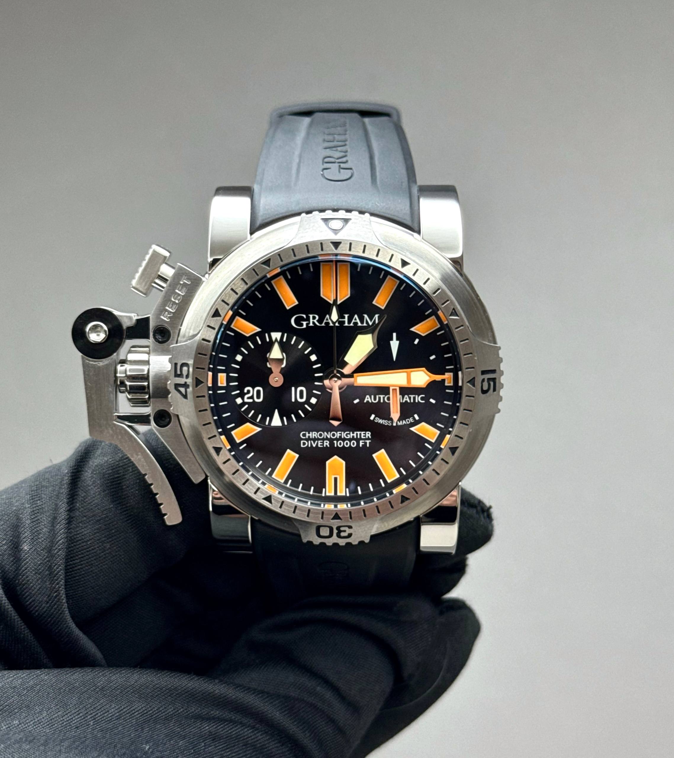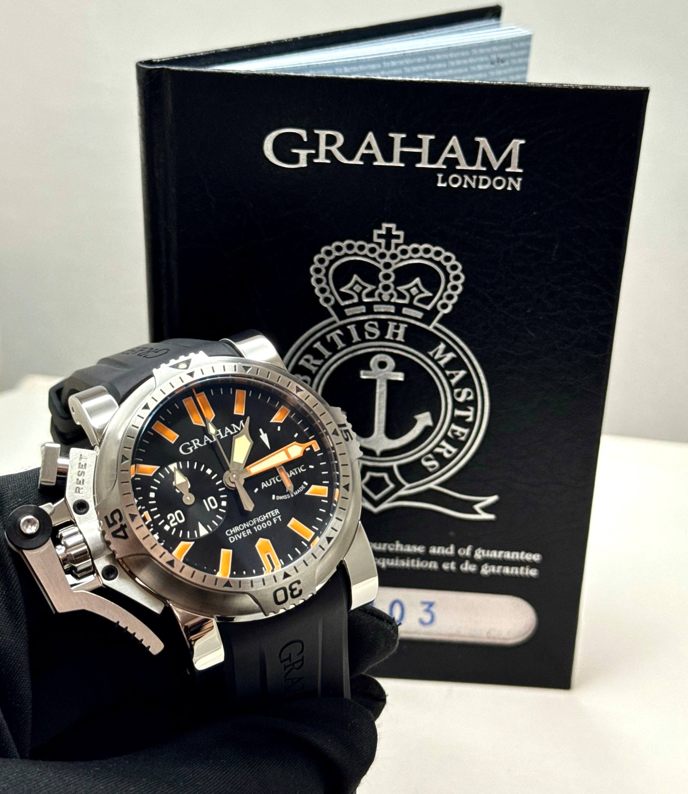 Бренд: Graham; Кому: Мужские; Состояние: С пробегом; Механизм: Механика с автоподзаводом; Ремешок: Каучук; Материал: Сталь; Стекло: Сапфировое; Форма: Круг; Застежка: Пряжка; Материал застежки: Сталь; Комплектация: Документы, переноска; Год: 2008; Водонепроницаемость : 300 м; Циферблат: Черный; Размер корпуса: 47 мм; Функции: Часы, минуты, секунды, хронограф;