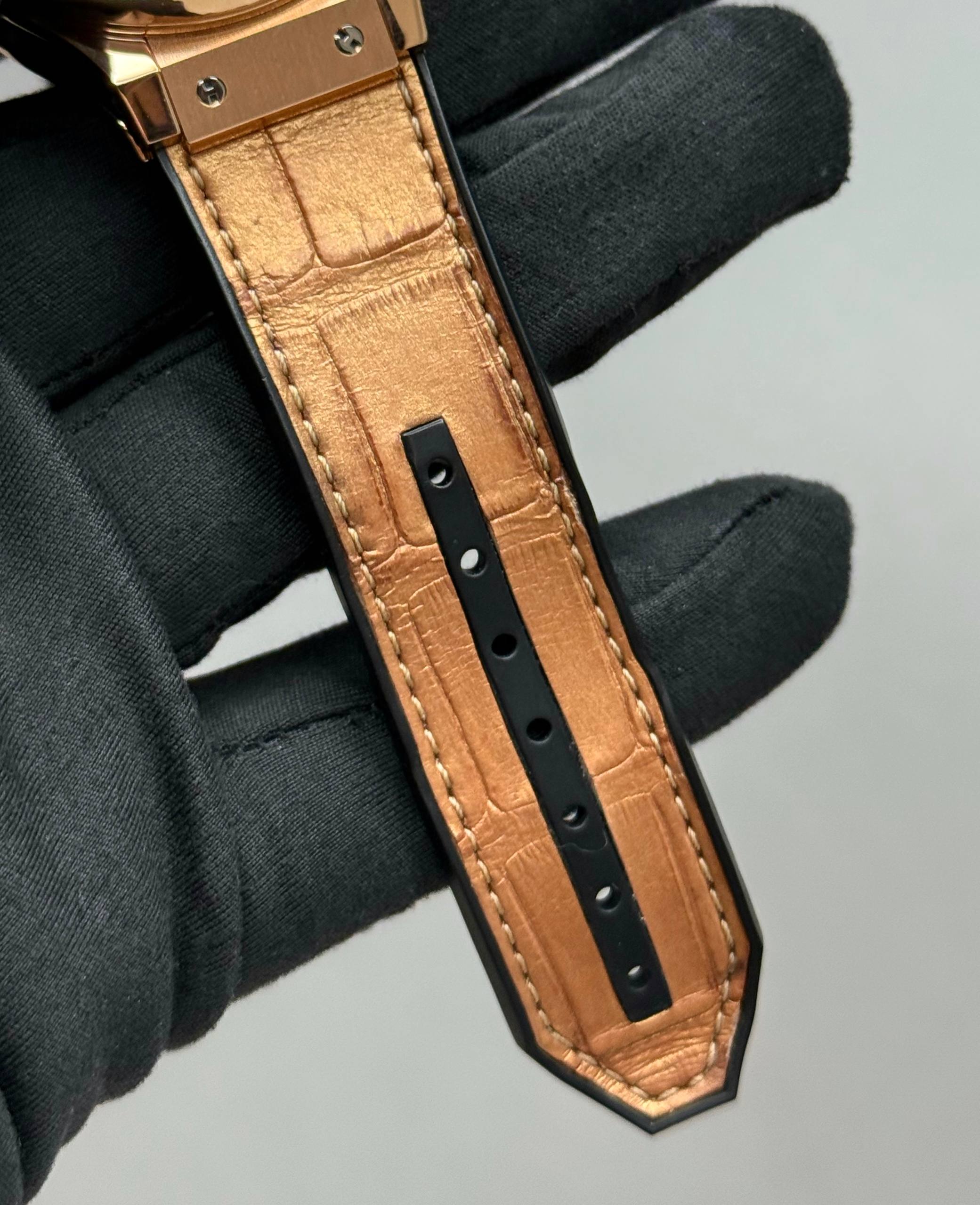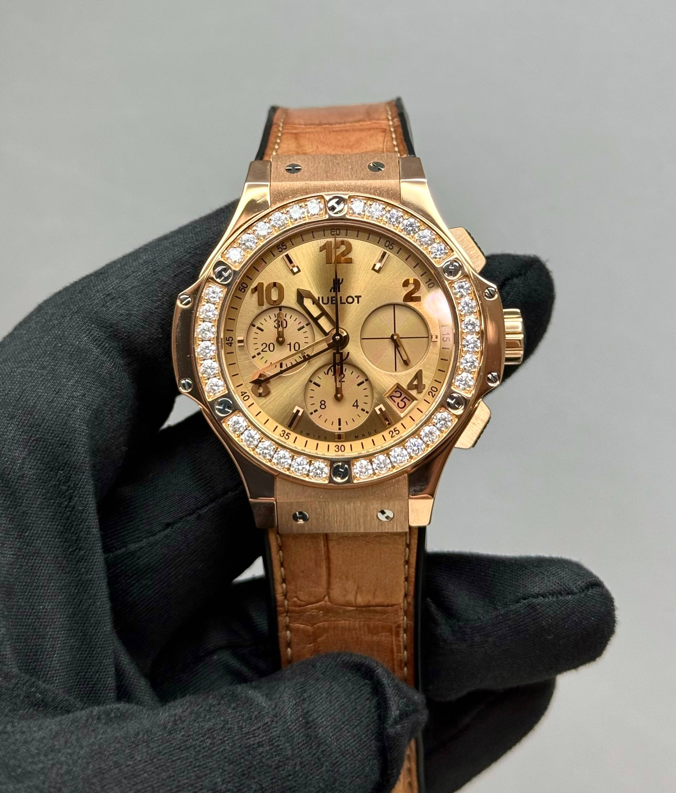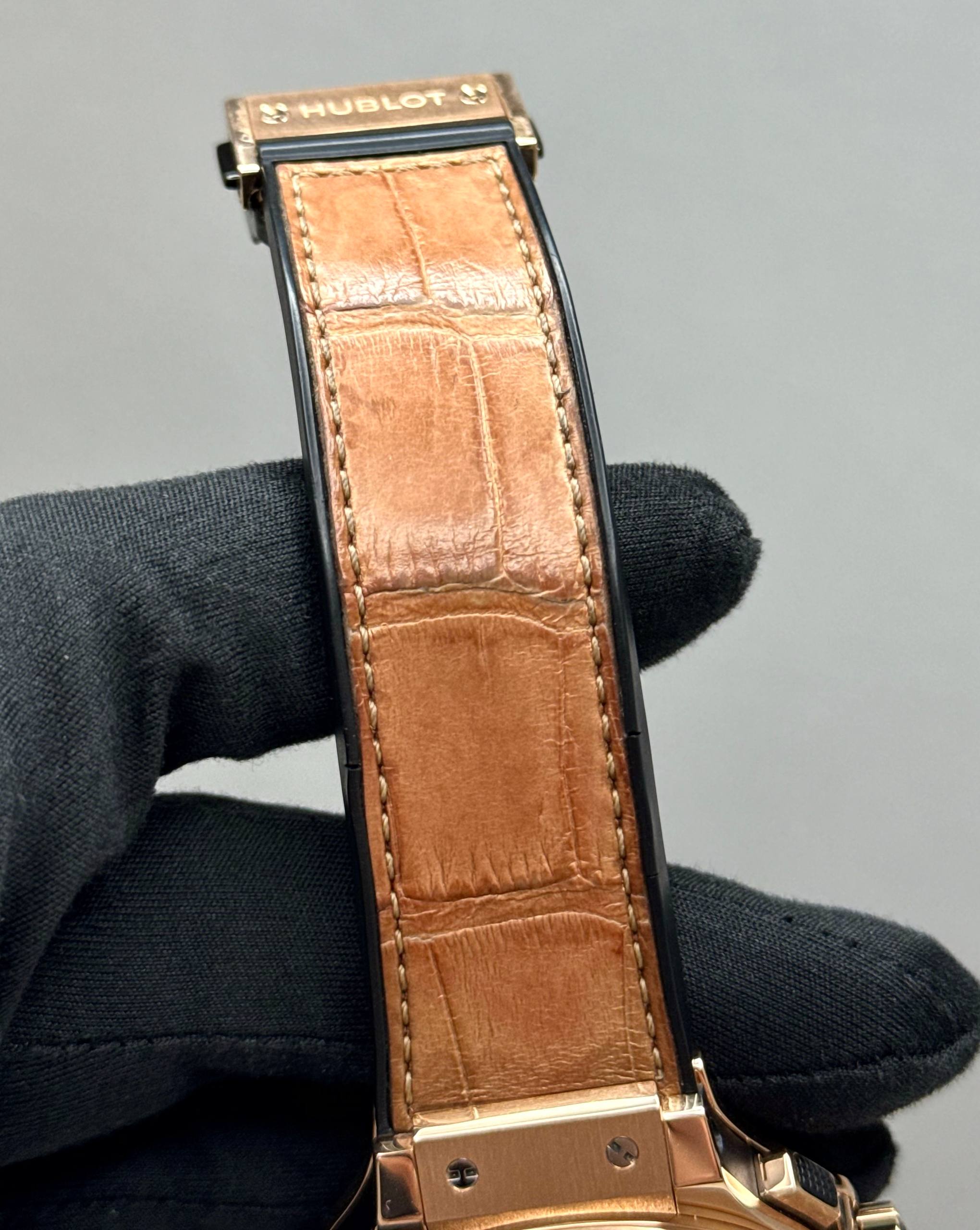 Бренд: Hublot; Кому: Унисекс; Состояние: Как новые; Механизм: Механика с автоподзаводом; Ремешок: Комбинированный; Материал: Золото; Стекло: Сапфировое; Форма: Круг; Застежка: Раскладывающаяся; Материал застежки: Золото/сталь; Комплектация: Полный комплект; Вес: 153 гр; Страна: Швейцария; Циферблат: Золотистый; Размер корпуса: 44 мм; Функции: Дата, часы, минуты, секунды, хронограф;