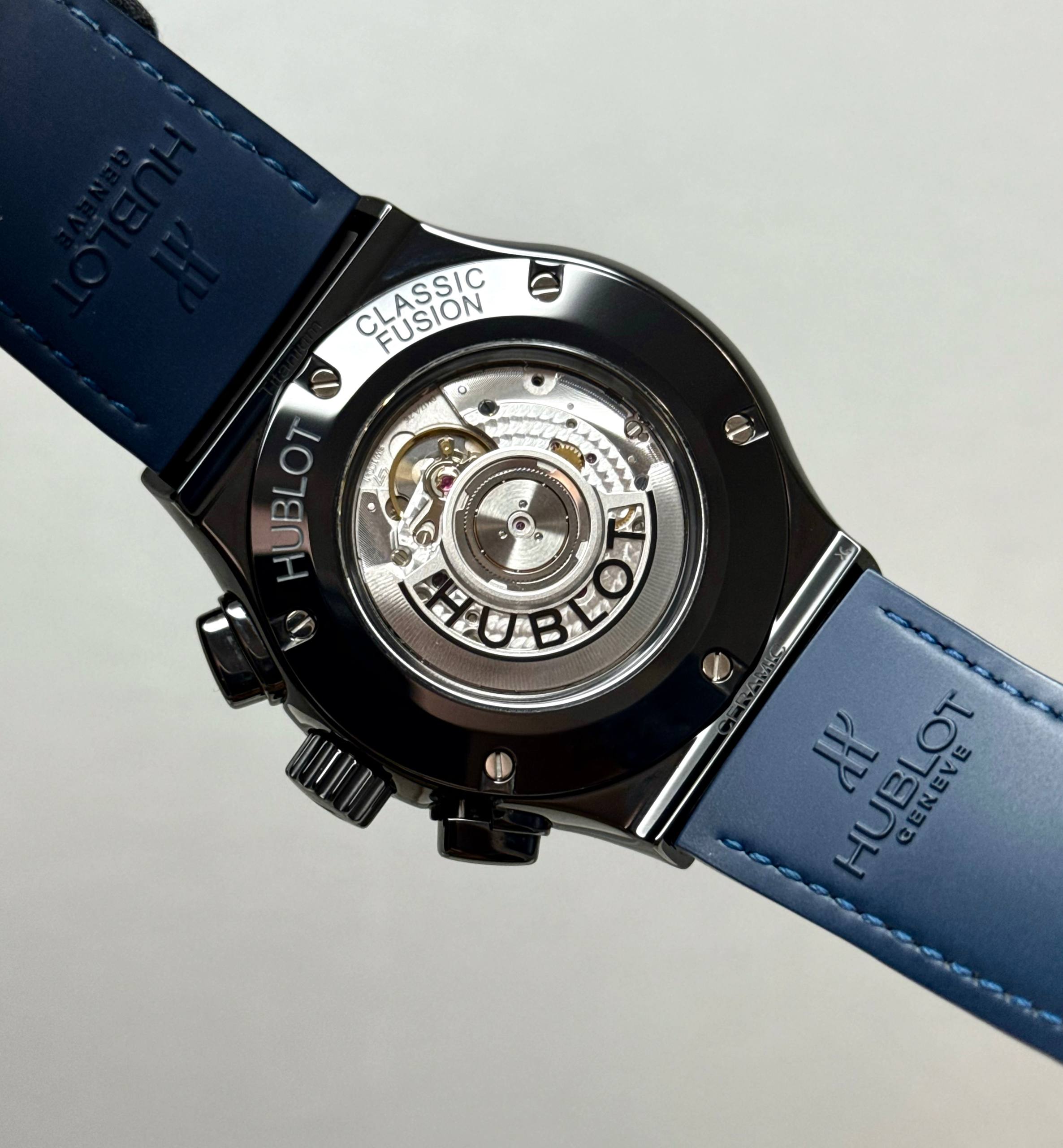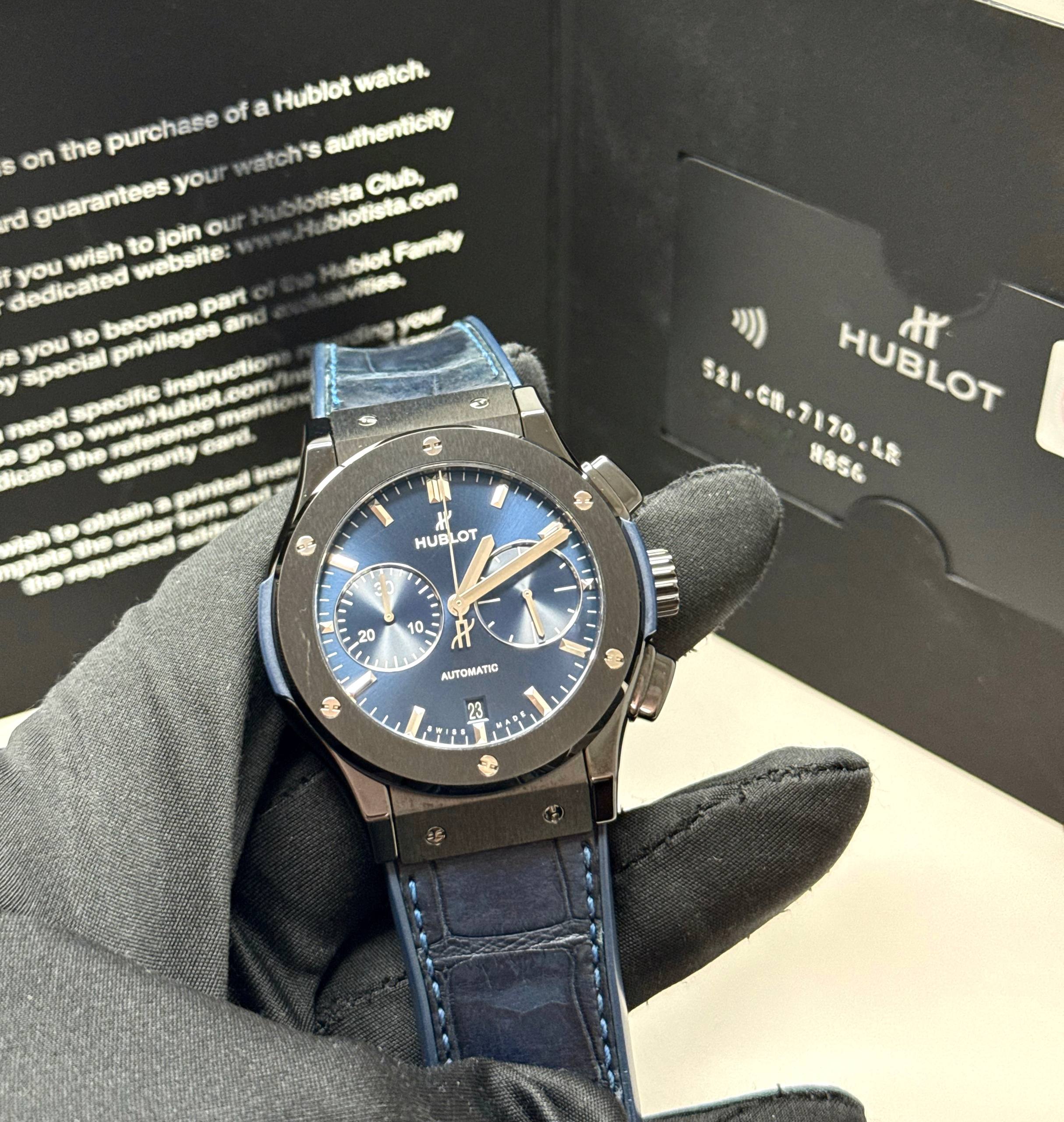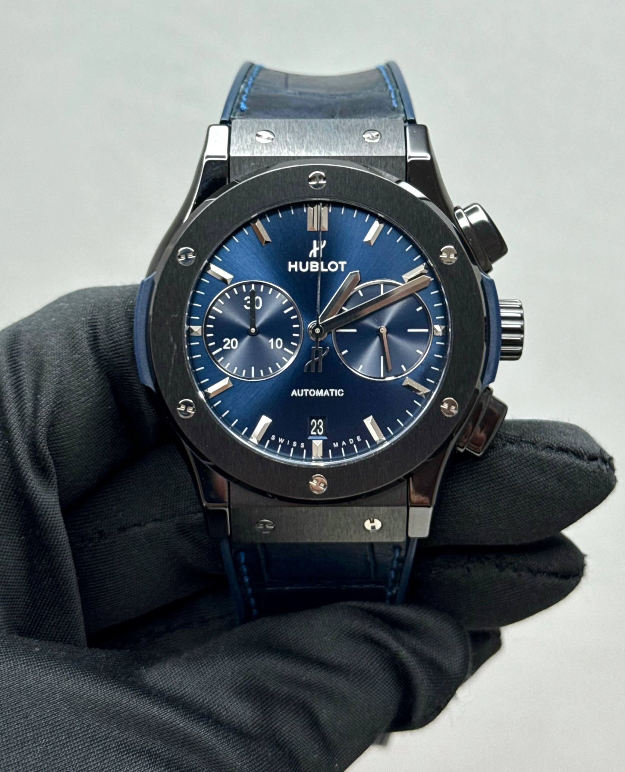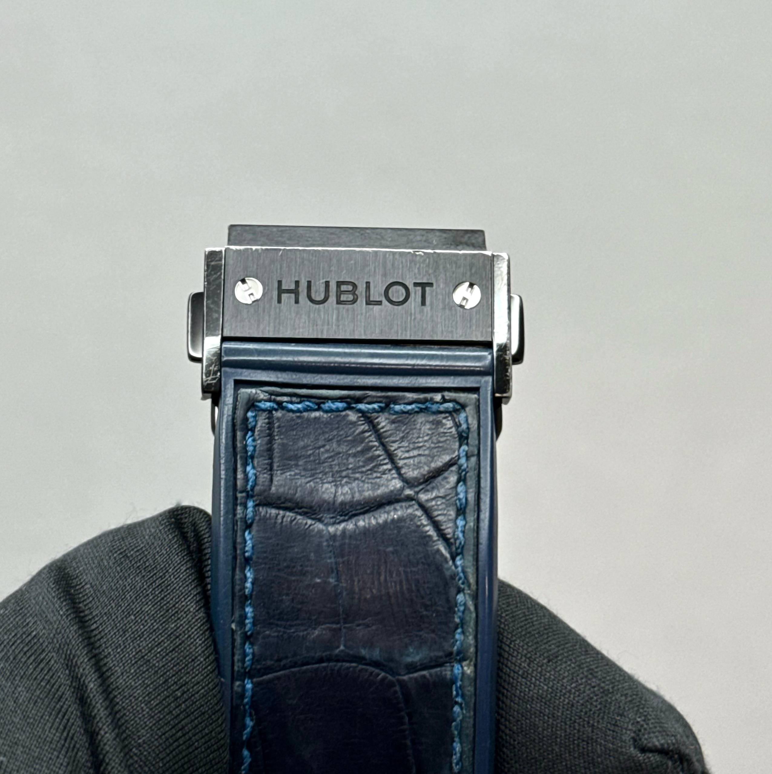 Бренд: Hublot; Кому: Мужские; Состояние: С пробегом; Механизм: Механика с автоподзаводом; Ремешок: Комбинированный; Материал: Керамика; Стекло: Сапфировое; Форма: Круг; Застежка: Раскладывающаяся; Материал застежки: Сталь; Комплектация: Документы; Год: 2017; Водонепроницаемость : 50 м; Запас хода: 42 ч; Калибр: HUB1143; Страна: Швейцария; Цвет ремешка: Синий; Циферблат: Синий; Размер корпуса: 45 мм; Функции: Дата, часы, минуты, секунды, хронограф;