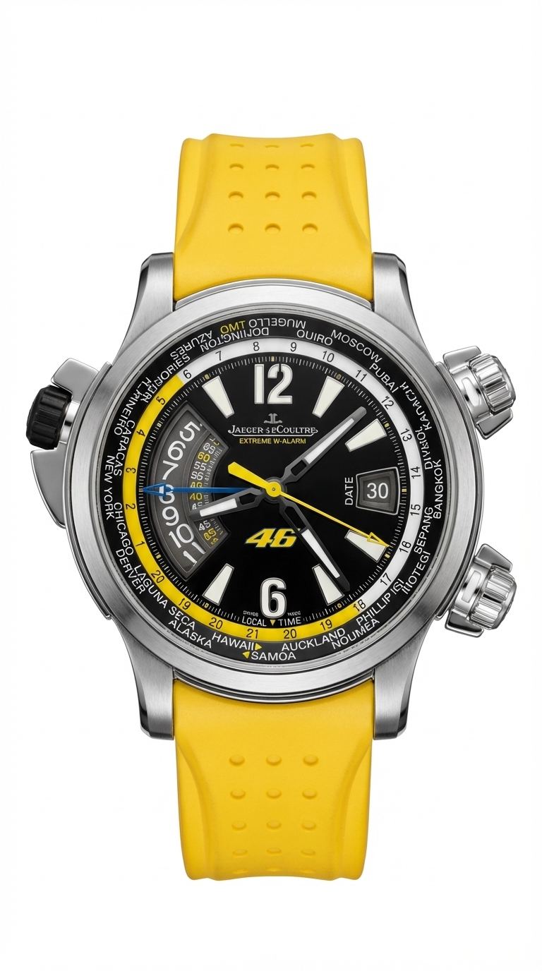 Бренд: Jaeger-LeCoultre; Кому: Мужские; Состояние: С пробегом; Механизм: Механика с автоподзаводом; Ремешок: Каучук; Материал: Сталь; Стекло: Сапфировое; Форма: Круг; Застежка: Пряжка; Материал застежки: Сталь; Комплектация: Коробка, документы; Год: 2009; Размер браслета: 15-20.5 см; Водонепроницаемость : 100 м; Страна: Швейцария; Цвет ремешка: Желтый; Размер корпуса: 46 мм; Функции: Дата, часы, минуты, секунды, будильник, второй часовой пояс;