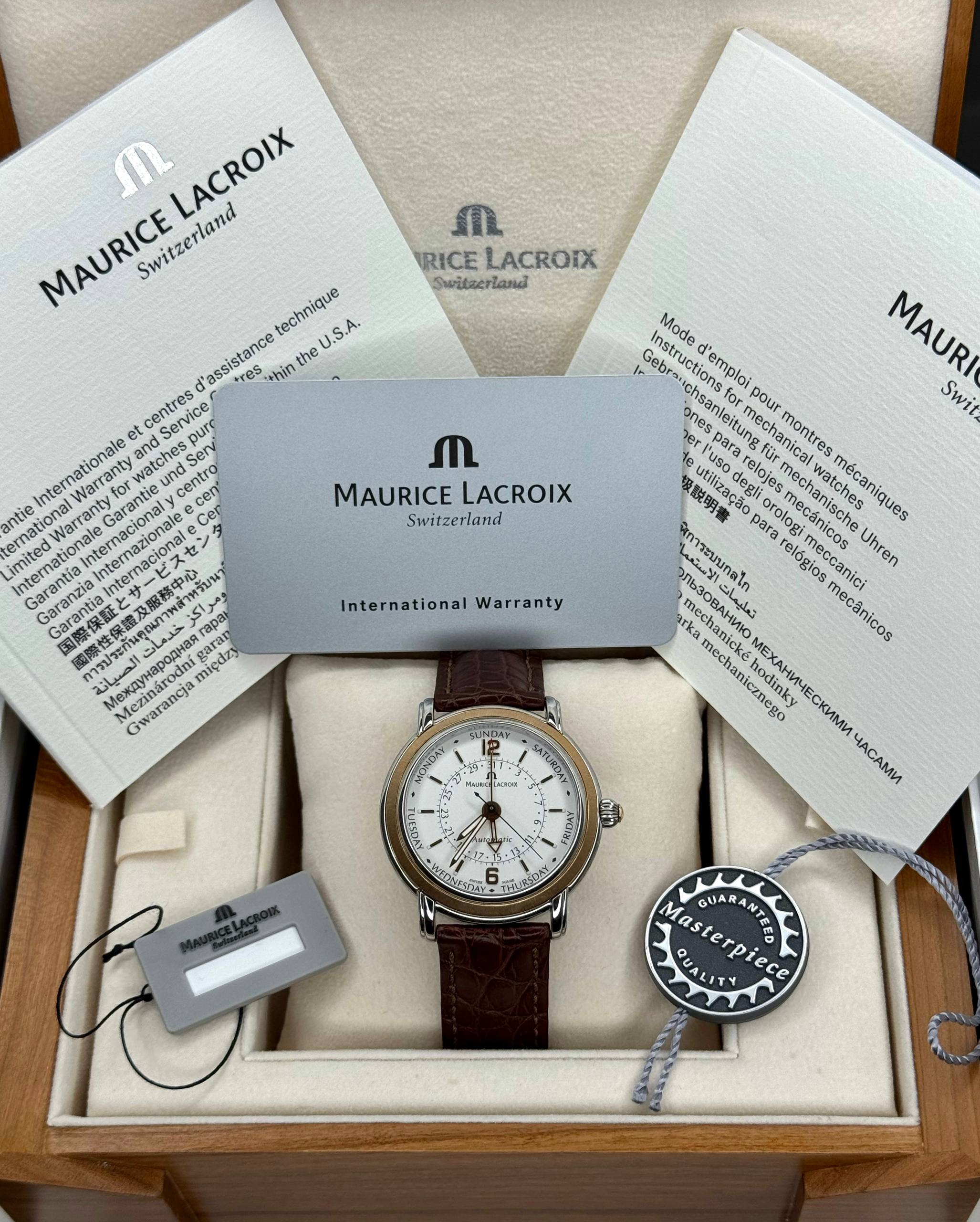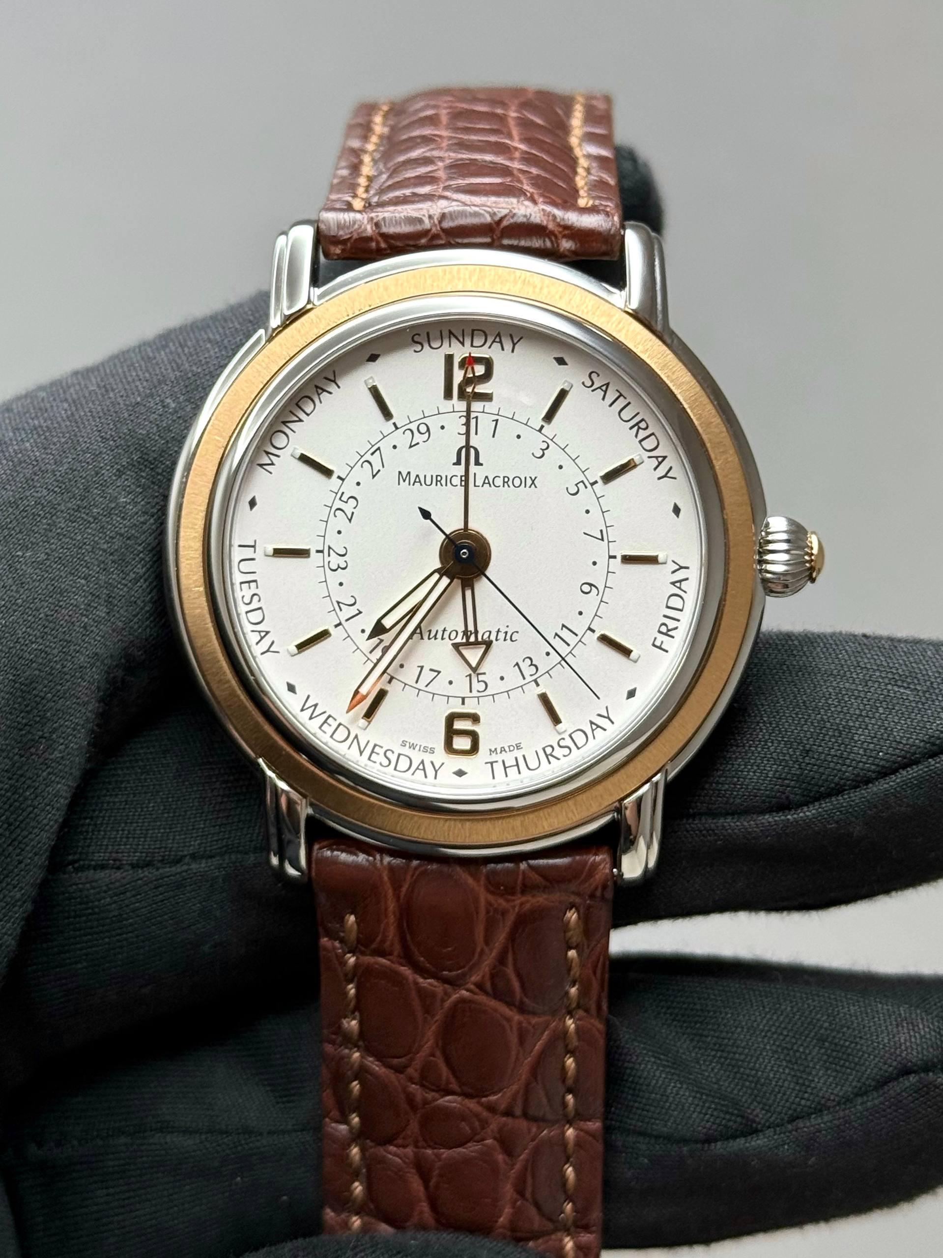 Бренд: Maurice Lacroix; Кому: Мужские; Состояние: Как новые; Механизм: Механика с автоподзаводом; Ремешок: Кожа; Материал: Сталь; Стекло: Сапфировое; Форма: Круг; Застежка: Раскладывающаяся; Материал застежки: Сталь; Комплектация: Коробка, документы; Год: 2004; Водонепроницаемость : 50 м; Запас хода: 40 ч; Калибр: ML27; Материал безеля: Золото; Страна: Швейцария; Цвет ремешка: Коричневый; Циферблат: Белый; Размер ремня: 24 см; Размер корпуса: 40 мм; Функции: Дата, часы, минуты, секунды, день недели;