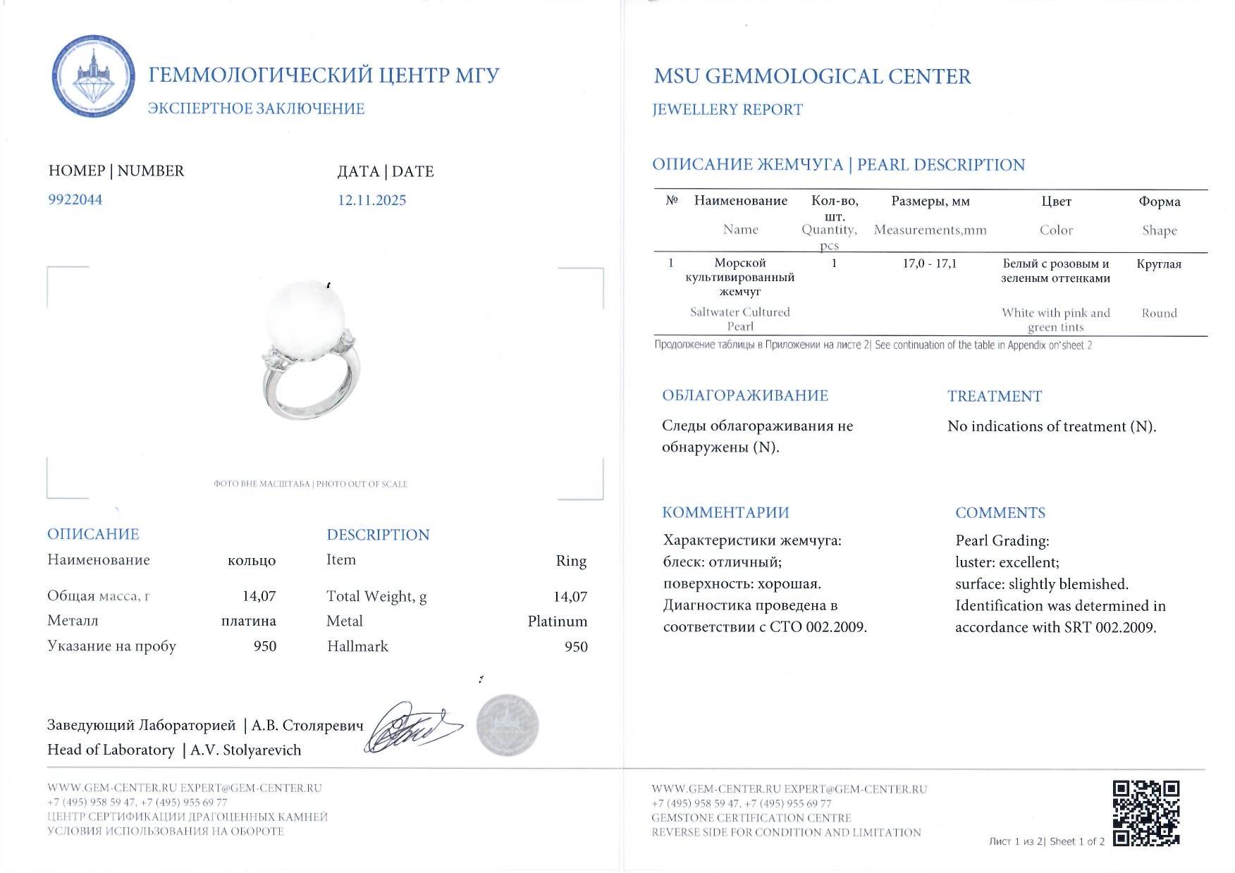 Бренд: No Name; Тип: Кольцо; Кому: Женские; Состояние: Как новые; Размер: 54 / 17.1; Материал: Платина, жемчуг, бриллианты; Проба для драгметала: 950; Комплектация: Коробка, сертификат МГУ; Вес: 14.07 гр;
