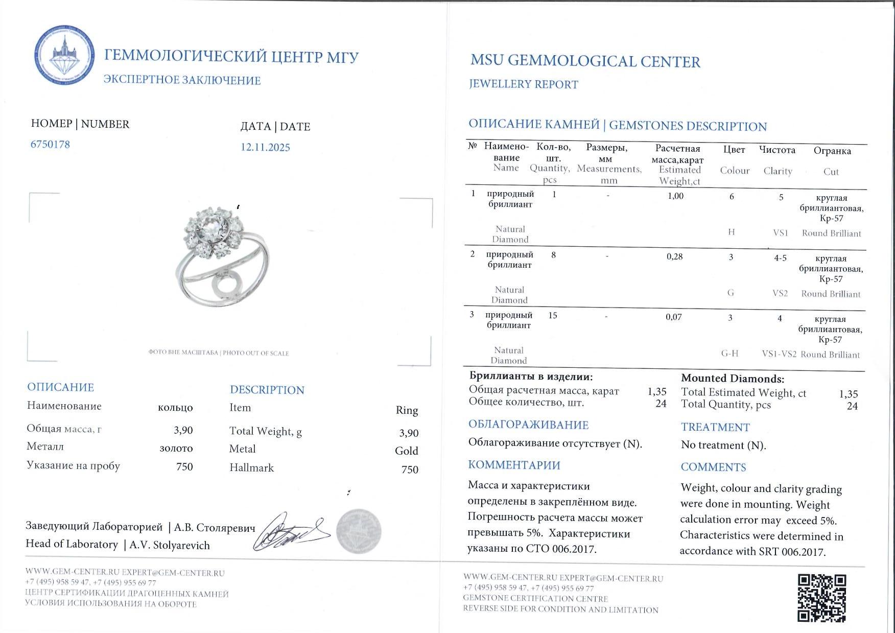 Бренд: No Name; Тип: Кольцо; Кому: Женские; Состояние: Как новые; Размер: 16.8/53; Материал: Белое золото, белые бриллианты; Проба для драгметала: 750; Комплектация: Коробка, сертификат МГУ; Вес: 3,90;