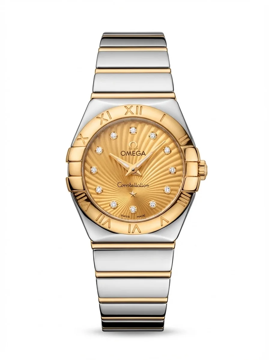 Бренд: Omega; Кому: Женские; Состояние: С пробегом; Механизм: Кварц; Ремешок: Золото/сталь; Материал: Золото/сталь; Застежка: Раскладывающаяся; Материал застежки: Золото/сталь; Комплектация: Переноска; Водонепроницаемость : 100 м; Запас хода: 48 месяцев; Страна: Швейцария; Циферблат: Шампань с узором Supernova и бриллиантовыми часовыми метками; Размер браслета: 15 см; Размер корпуса: 24 мм; Функции: Часы, минуты;
