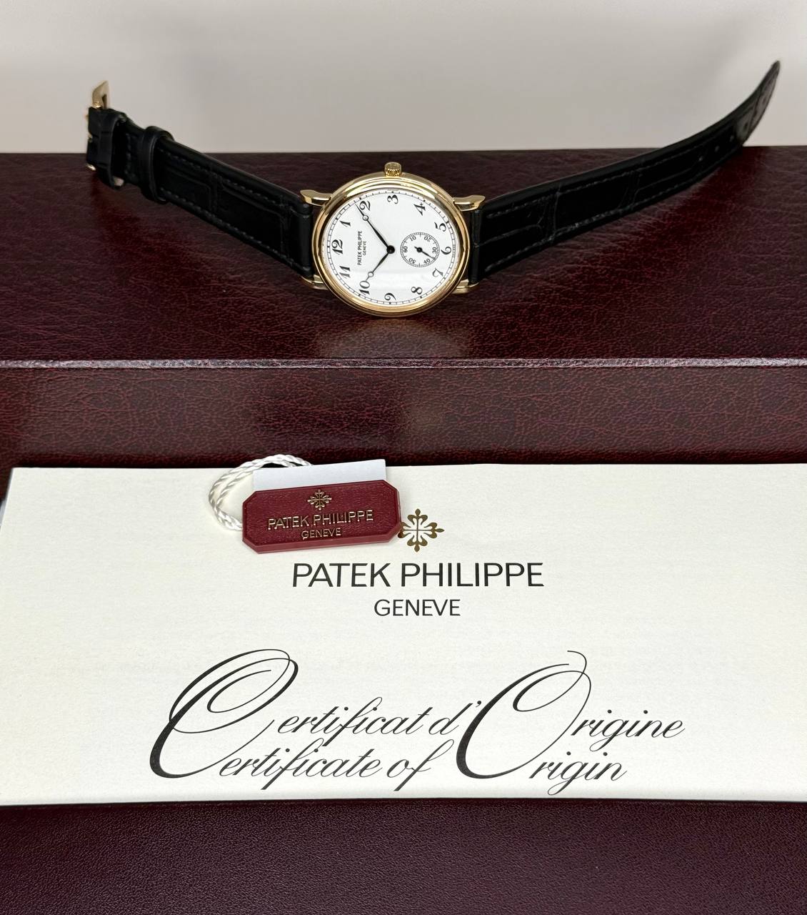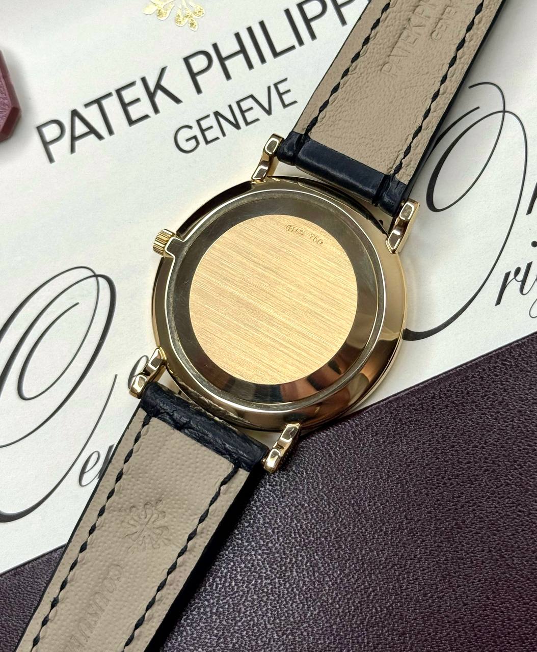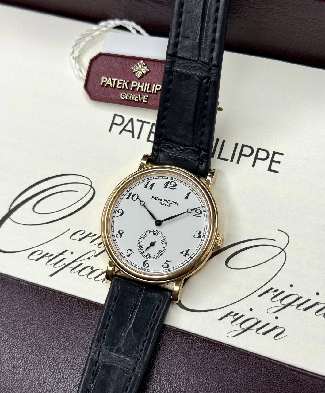 Бренд: Patek Philippe; Кому: Унисекс; Состояние: Как новые; Коллекция: Calatrava; Механизм: С ручным заводом; Ремешок: Кожа; Материал: Желтое золото; Стекло: Сапфировое; Форма: Круг; Застежка: Пряжка; Материал застежки: Желтое золото; Комплектация: Коробка, документы; Год: 2002; Водонепроницаемость : 30 м; Калибр: 215; Страна: Швейцария; Цвет ремешка: Черный; Циферблат: Белый; Размер ремешка: 23.5 см; Размер корпуса: 33 мм; Функции: Часы, минуты, секунды;
