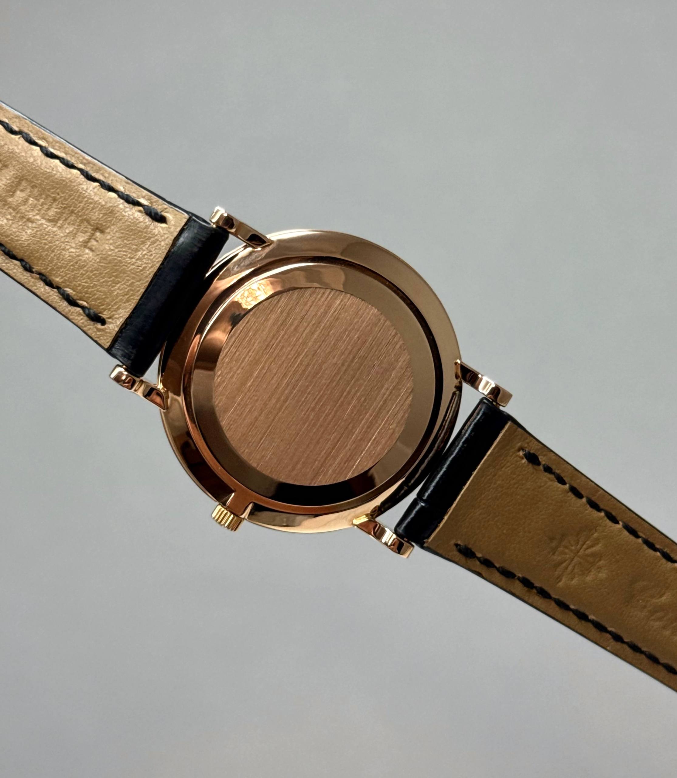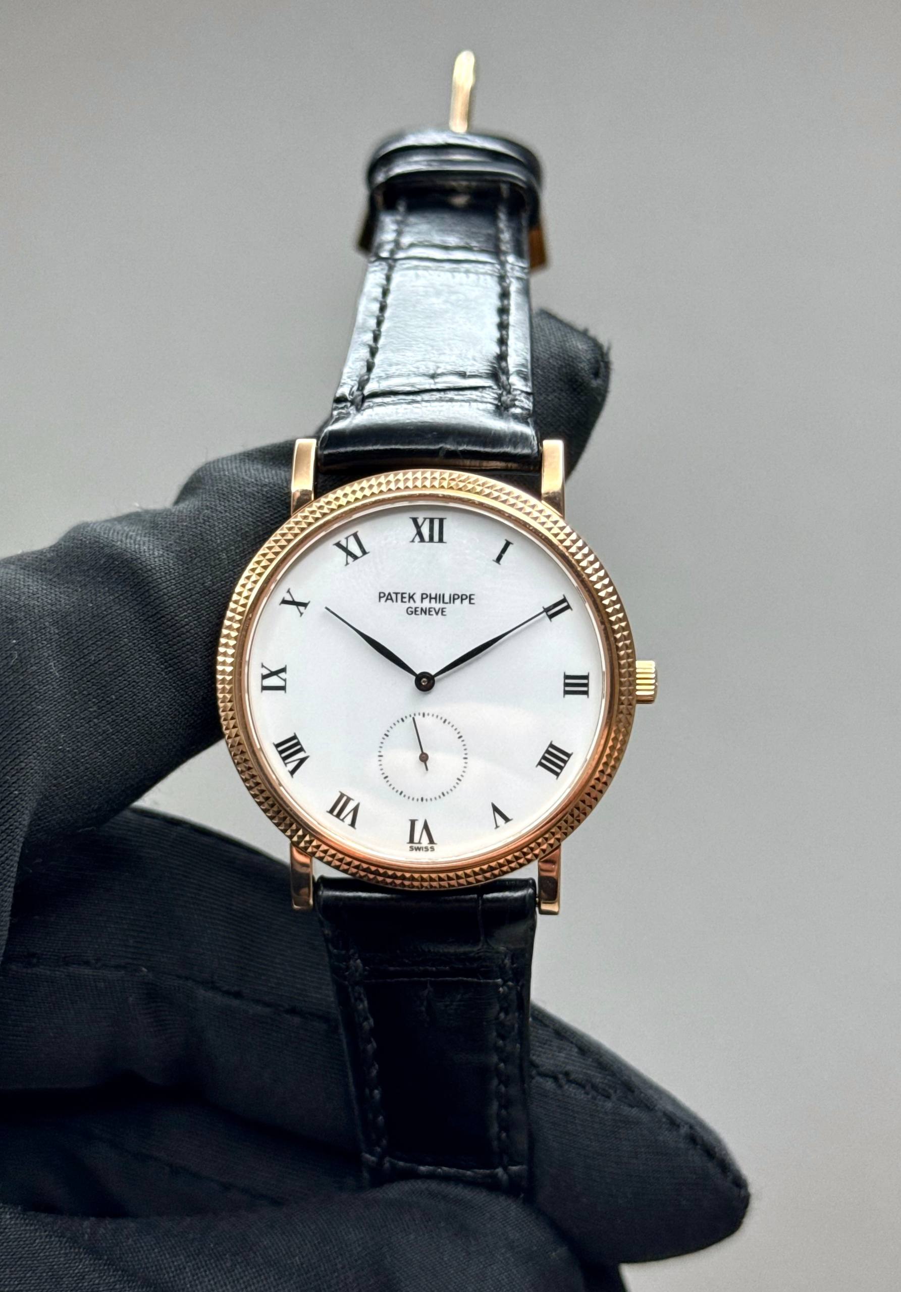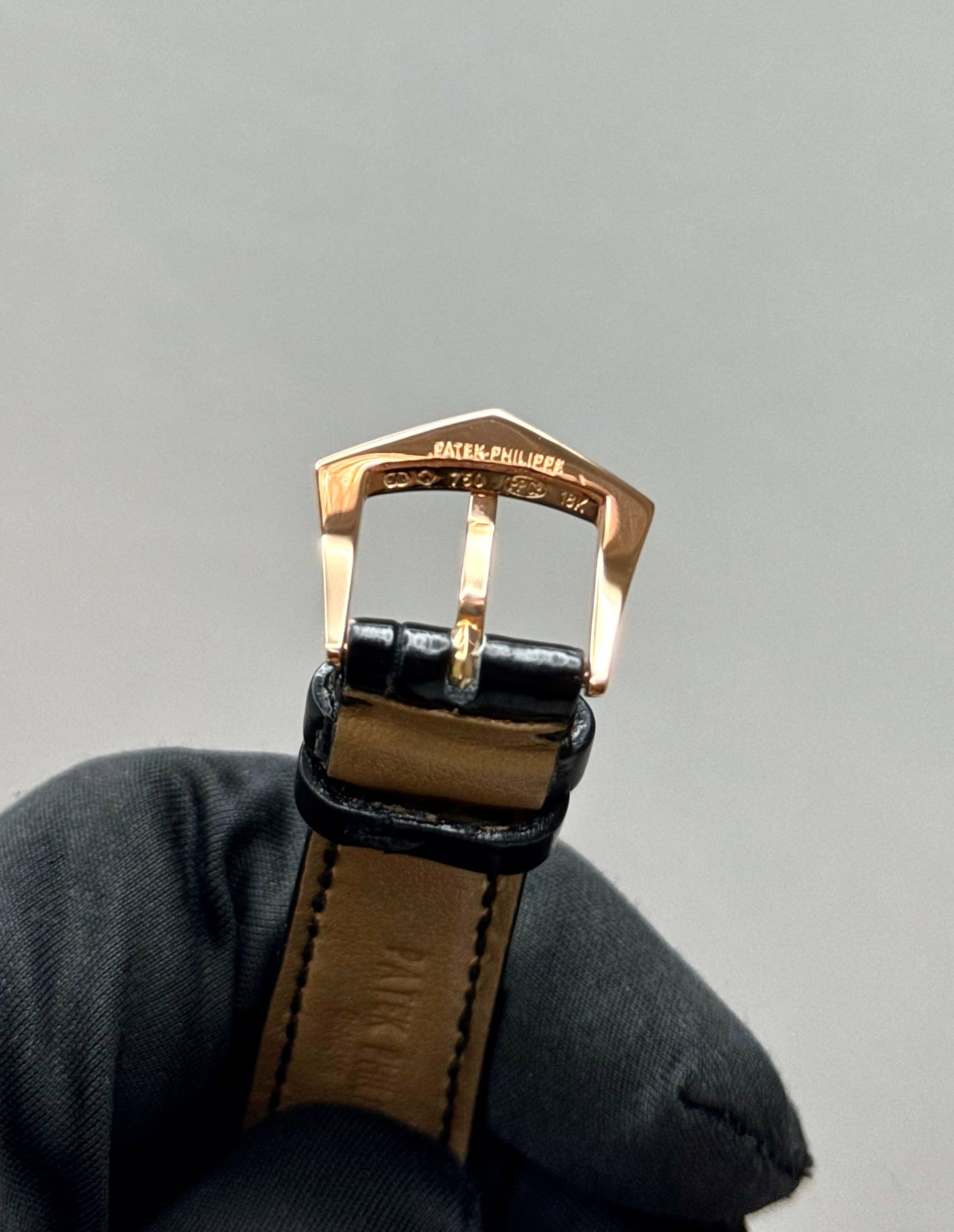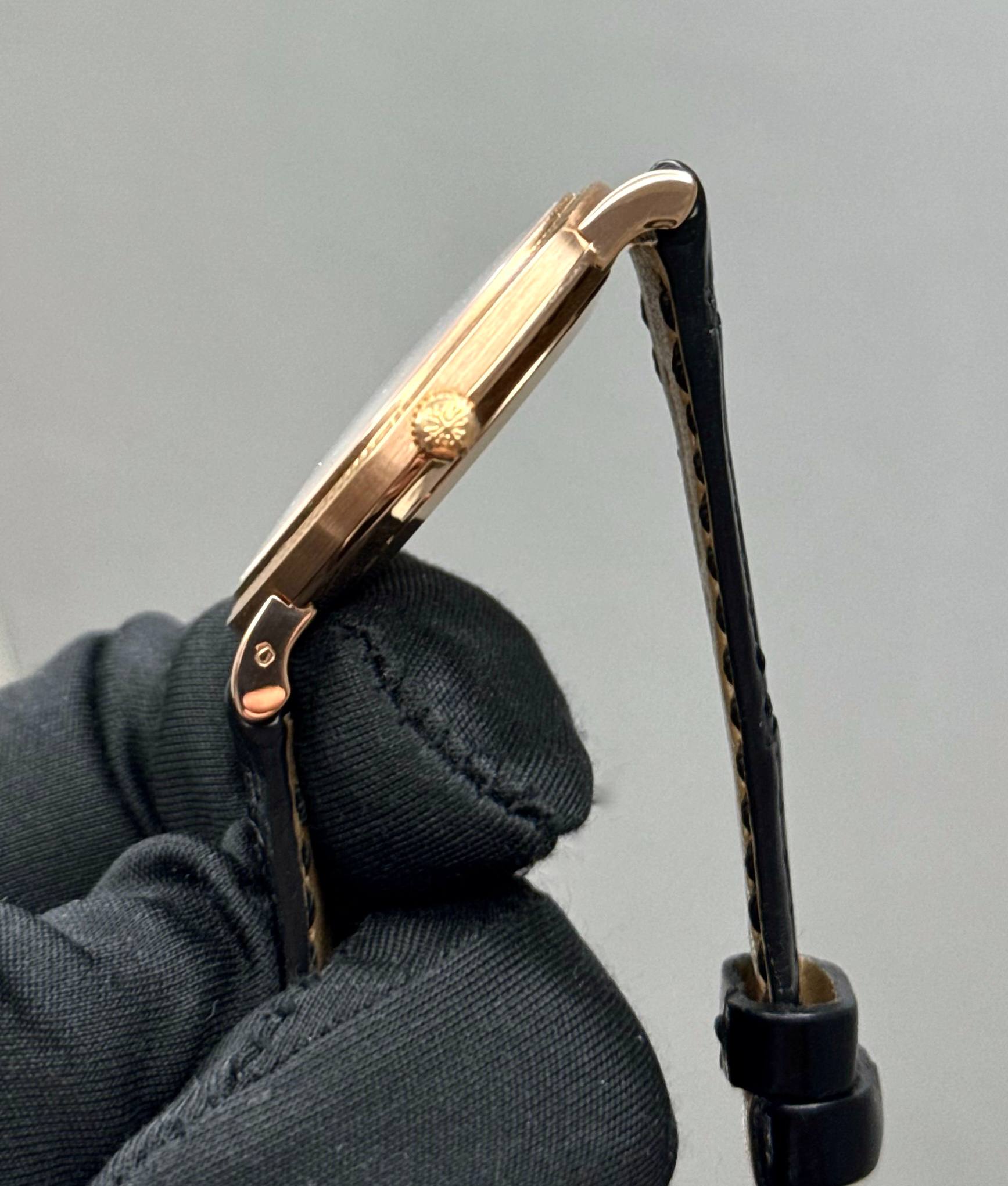 Бренд: Patek Philippe; Кому: Унисекс; Состояние: Как новые; Механизм: С ручным заводом; Ремешок: Кожа; Стекло: Сапфировое; Форма: Круг; Застежка: Пряжка; Комплектация: Переноска; Материал: Розовое золото; Водонепроницаемость : 30 м; Страна: Швейцария; Цвет ремешка: Черный; Циферблат: Белый ; Размер ремня: 19.5 см; Размер корпуса: 33 мм; Функции: Часы, минуты, секунды;