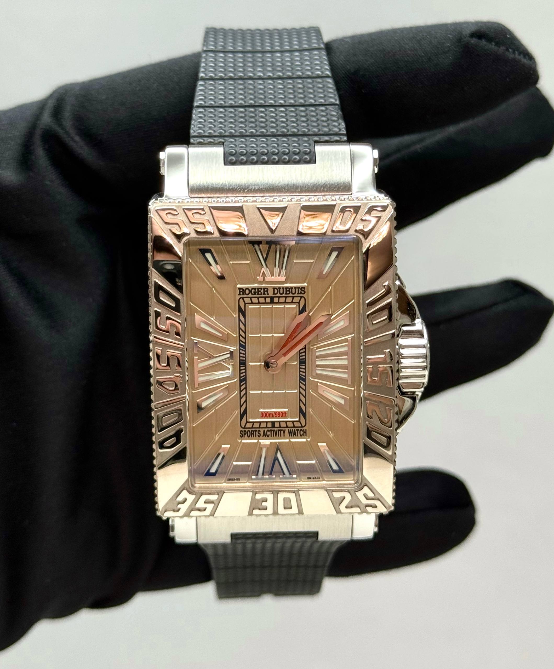 Бренд: Roger Dubuis; Кому: Мужские; Состояние: Как новые; Механизм: Механика с автоподзаводом; Ремешок: Каучук; Материал: Сталь; Стекло: Сапфировое; Форма: Прямоугольник; Застежка: Раскладывающаяся; Материал застежки: Сталь; Комплектация: Переноска; Водонепроницаемость : 300 м; Страна: Швейцария; Цвет ремешка: Черный; Циферблат: Золотистый; Размер браслета: 18.5 см; Размер корпуса: 34 х 60 мм; Функции: Часы, минуты;