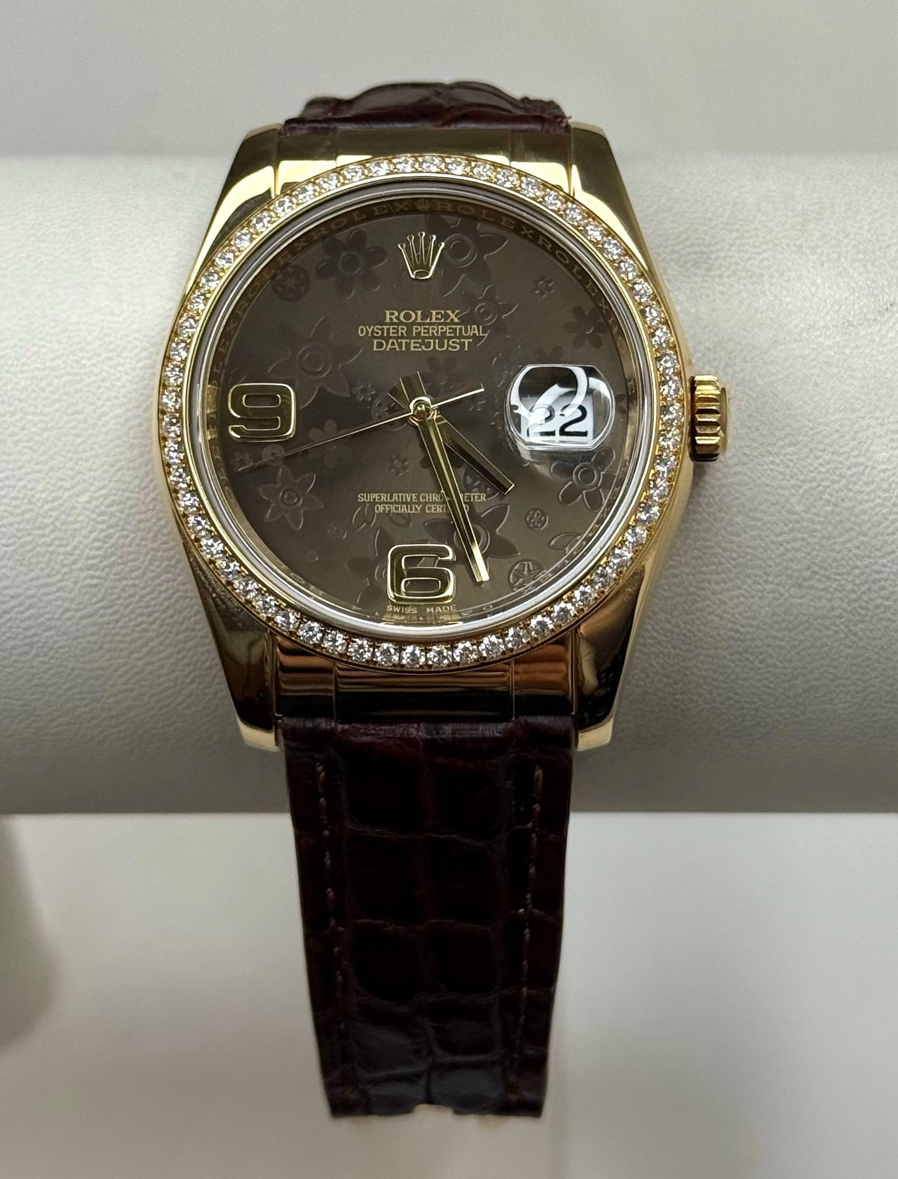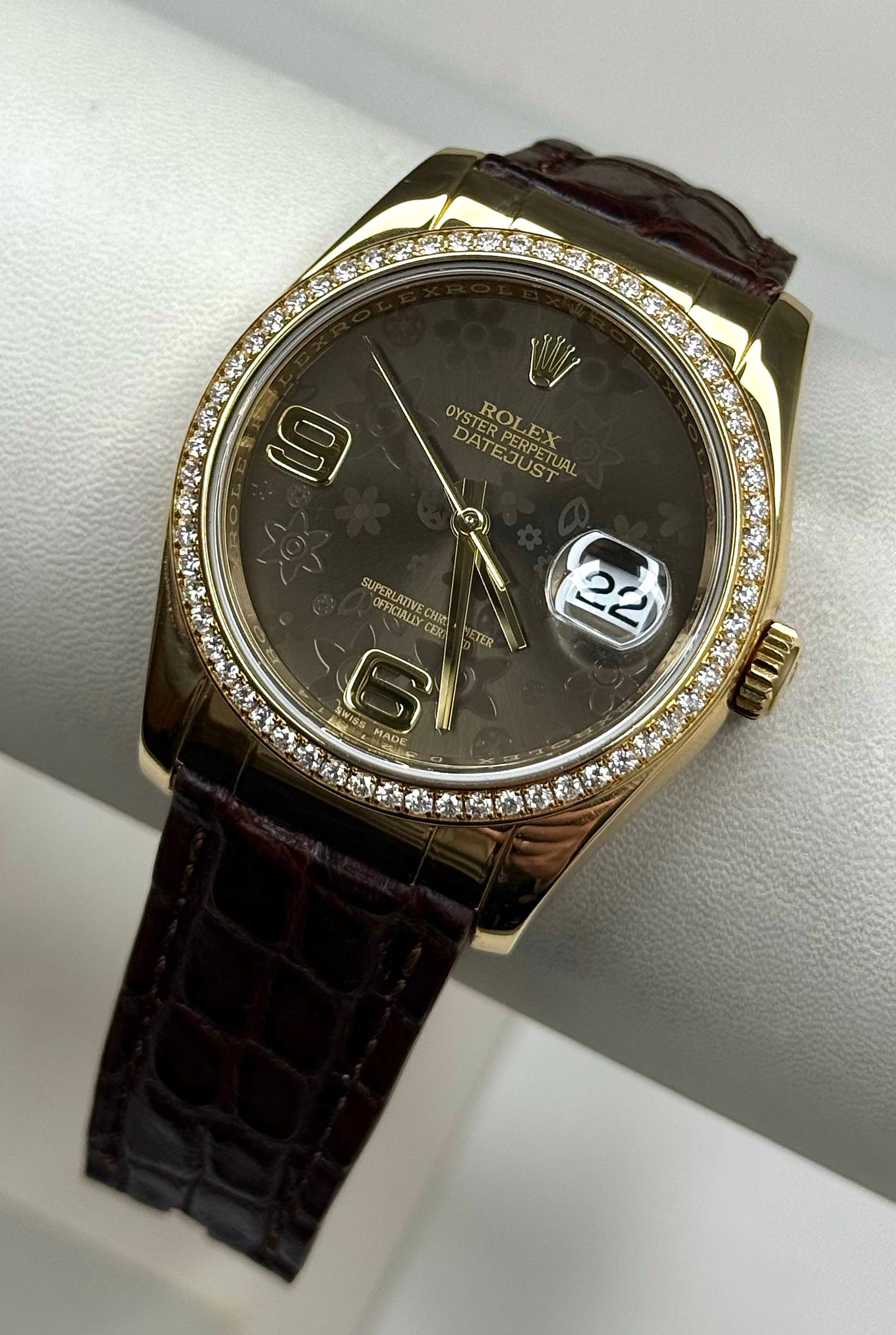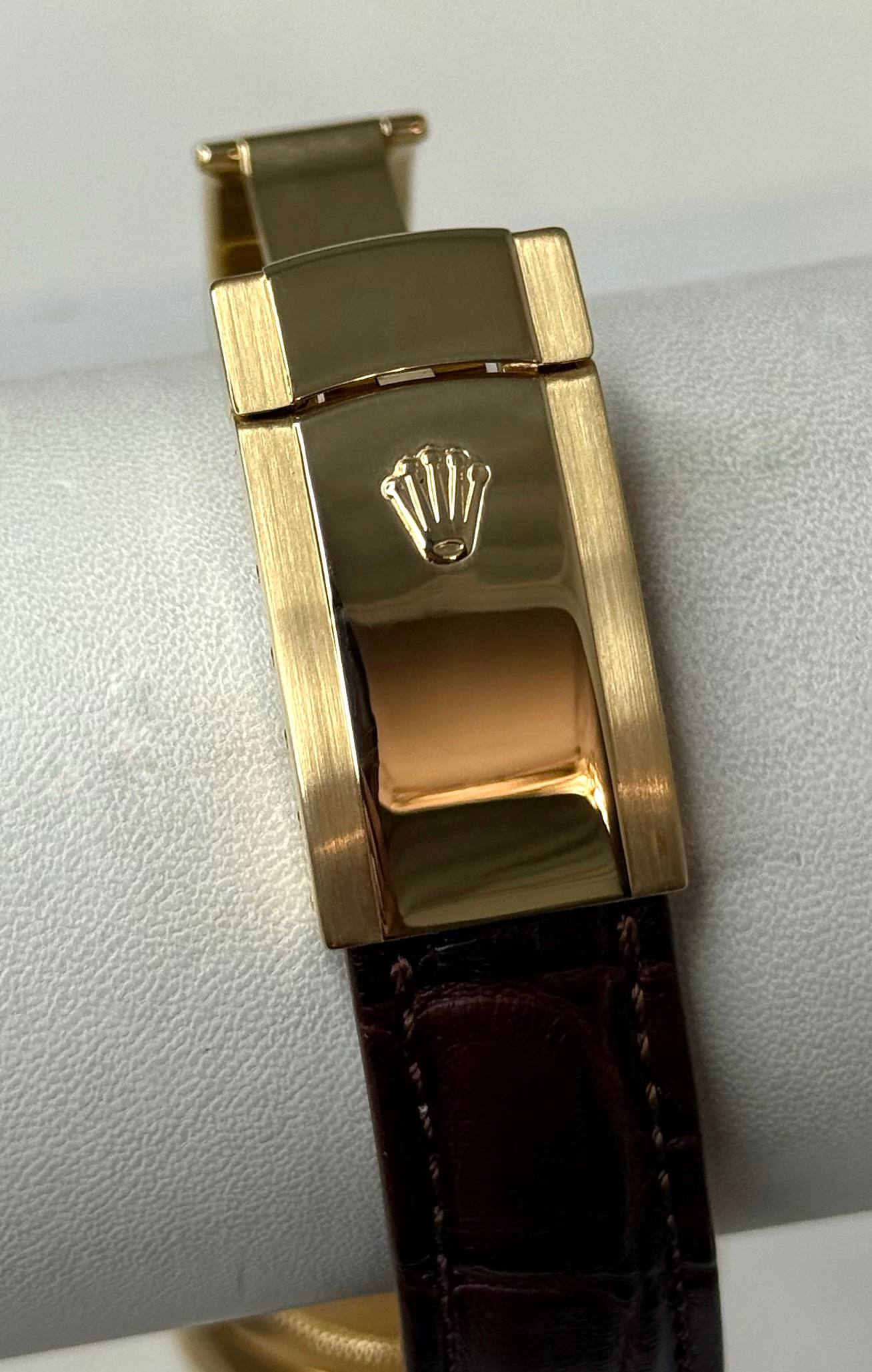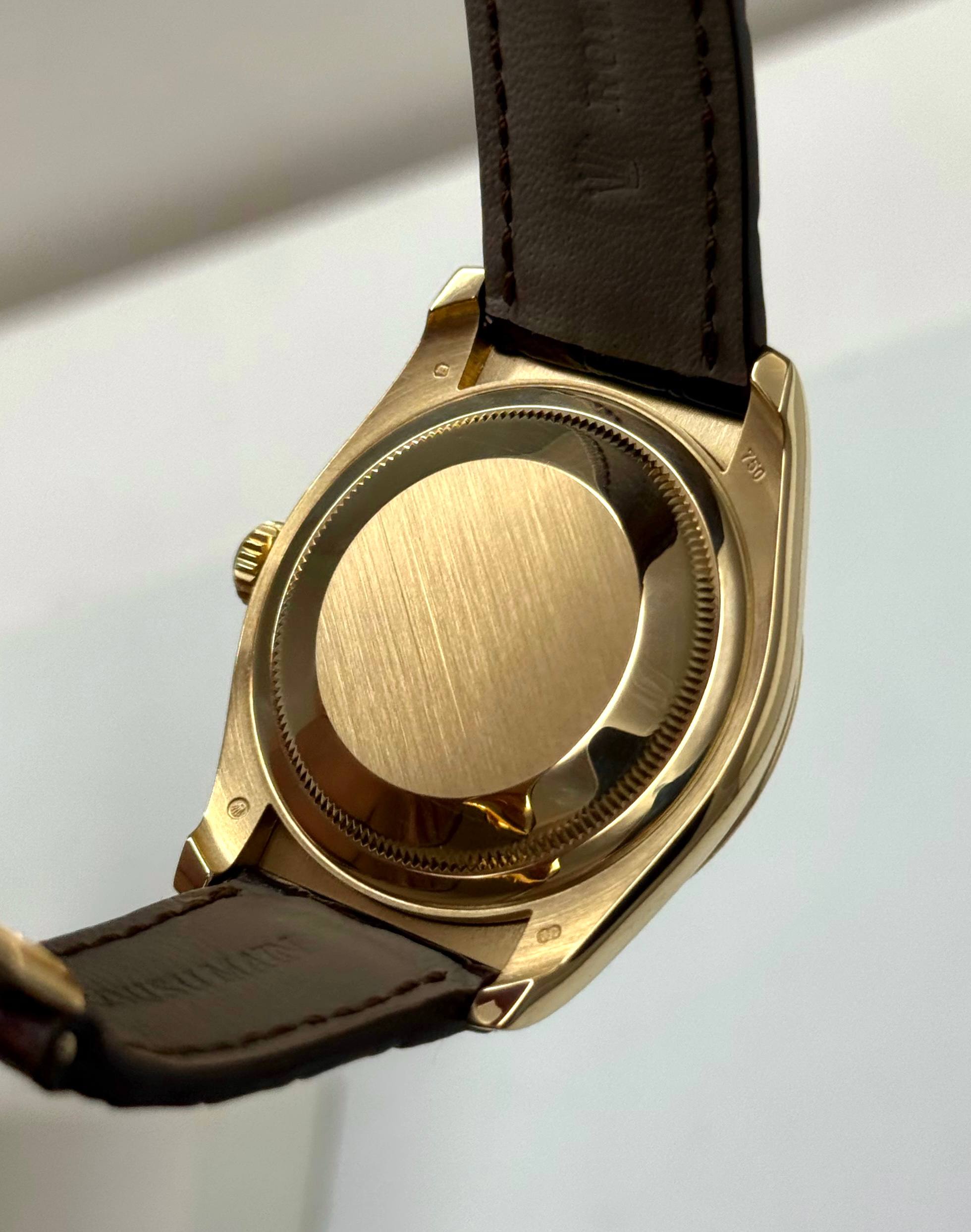 Бренд: Rolex; Состояние: С пробегом; Механизм: Механика с автоподзаводом; Ремешок: Кожа; Материал: Золото; Стекло: Сапфировое; Форма: Круг; Застежка: Раскладывающаяся; Материал застежки: Золото; Комплектация: Переноска; Материал безеля: Желтое золото, бриллианты; Водонепроницаемость : 100 м; Запас хода: 48 ч; Калибр: 3135; Страна: Швейцария; Циферблат: Коричневый; Размер браслета : 15 см; Размер корпуса: 36 мм; Функции: Дата, часы, минуты, секунды;