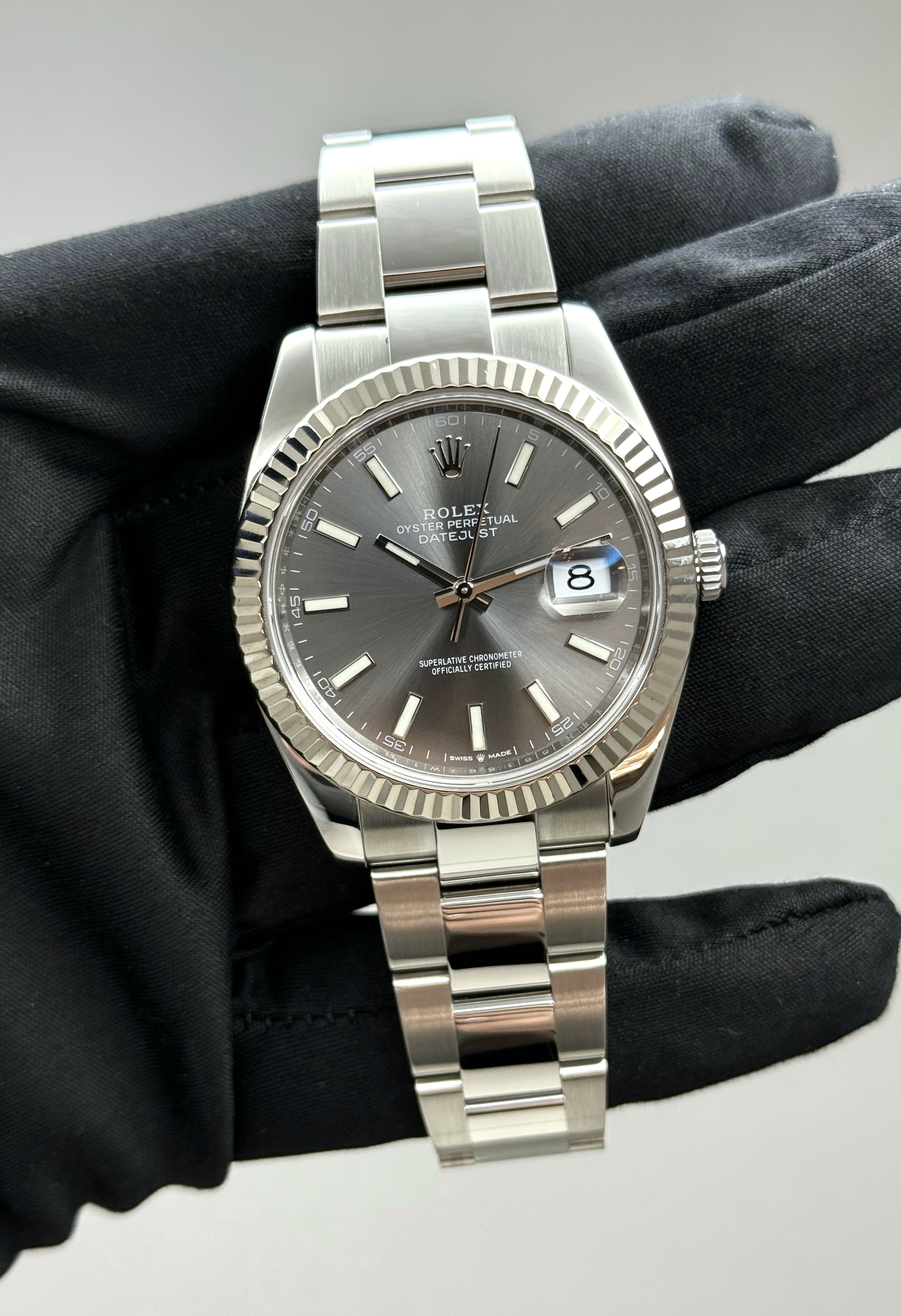 Бренд: Rolex; Кому: Унисекс; Состояние: Как новые; Механизм: Механика с автоподзаводом; Ремешок: Сталь; Материал: Золото/сталь; Стекло: Сапфировое; Форма: Круг; Застежка: Раскладывающаяся; Материал застежки: Сталь; Комплектация: Коробка, документы; Год: 2023; Водонепроницаемость : 100 м; Запас хода: 70 ч; Калибр: 3235; Страна: Швейцария; Циферблат: Серый; Размер браслета: 12 звеньев (18.5 см); Размер корпуса: 41 мм; Функции: Дата, часы, минуту, секунды;