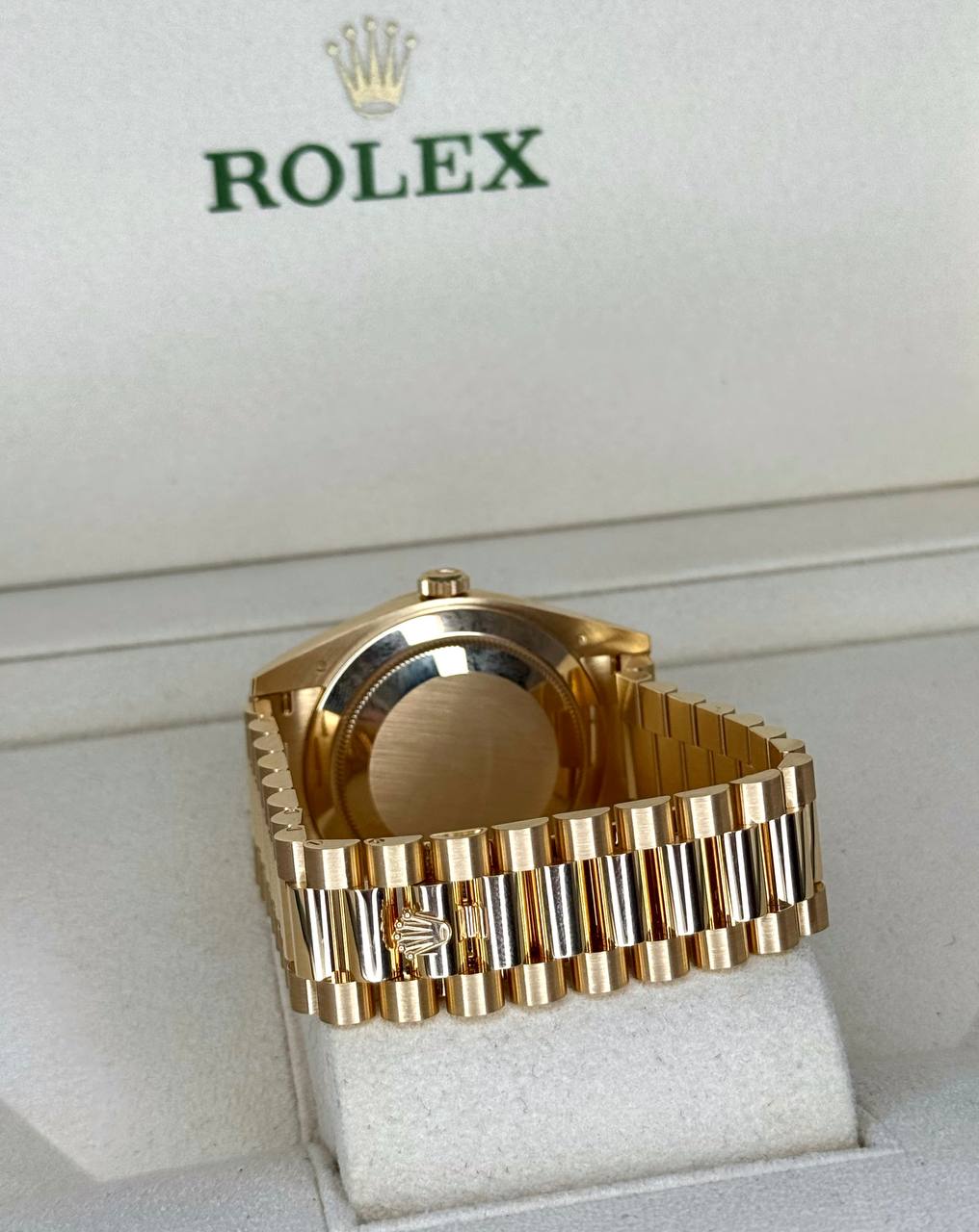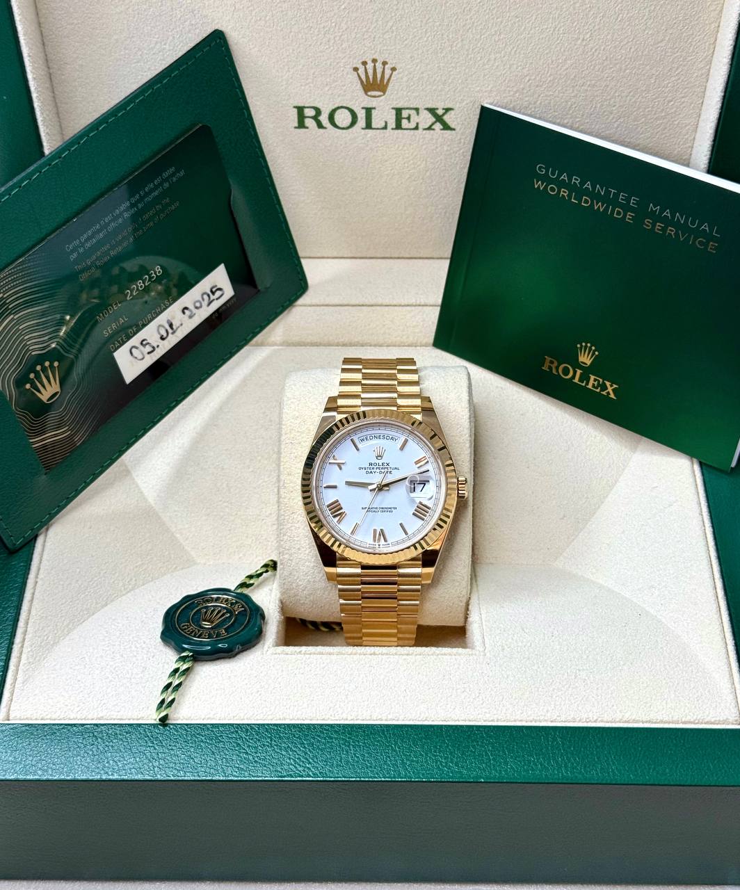 Бренд: Rolex; Кому: Унисекс; Состояние: Как новые; Механизм: Механика с автоподзаводом; Стекло: Сапфировое; Комплектация: полный комлект,2025 год; Материал: 18-к Желтое золото; Водонепроницаемость (м): 100; Запас хода: 70 часов; Калибр: 3255; Циферблат: белый; Размер: 40 мм; Функции: День недели, дата, часы, минуты, секунды;