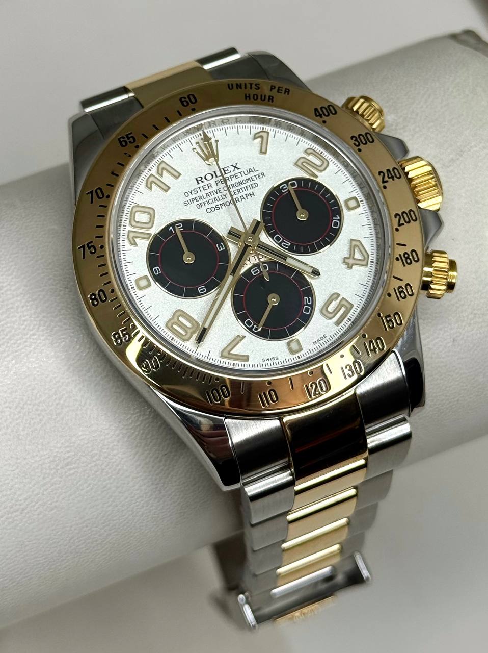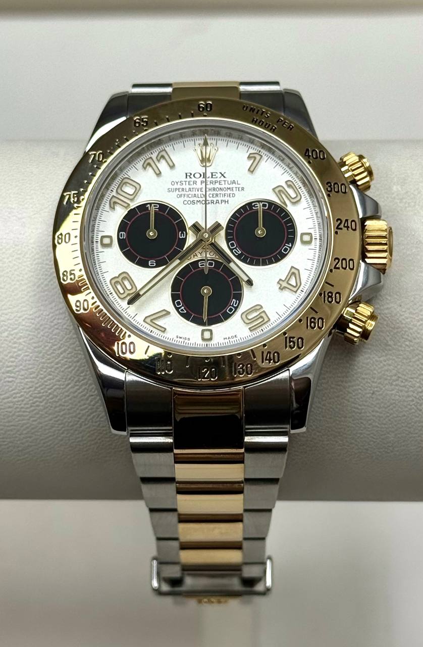 Бренд: Rolex; Кому: Унисекс; Состояние: Как новые; Механизм: Механика с автоподзаводом; Ремешок: Золото/сталь; Материал: Золото/сталь; Стекло: Сапфировое; Форма: Круг; Застежка: Раскладывающаяся; Материал застежки: Золото/сталь; Комплектация: Переноска; Водонепроницаемость : 100 м; Запас хода: 72 ч; Калибр: 4130; Страна: Швейцария; Циферблат: Белый, черный; Размер браслета: 9 звеньев (16 см); Размер корпуса: 40 мм; Функции: Часы, минуты, секунды, хронограф, тахиметр;