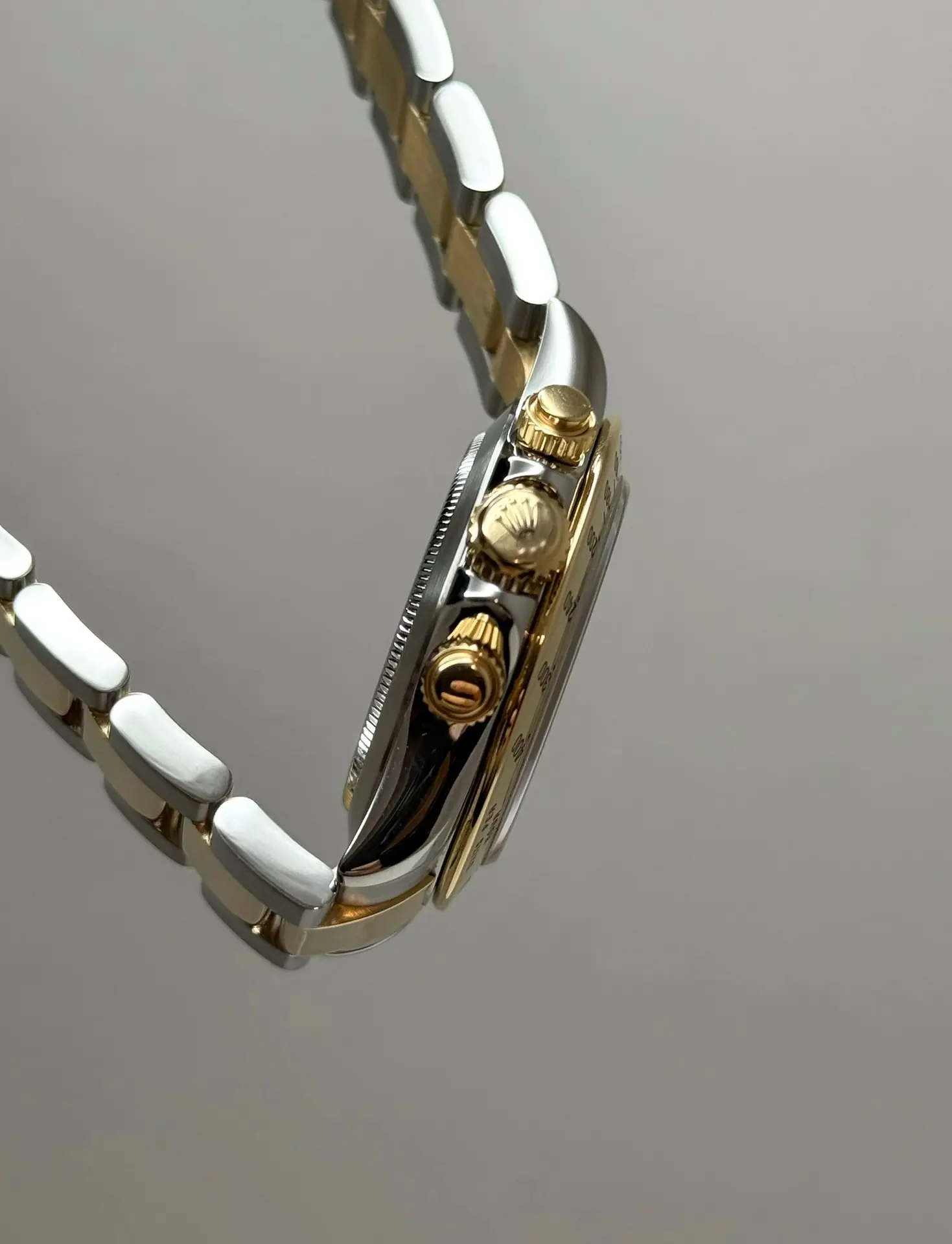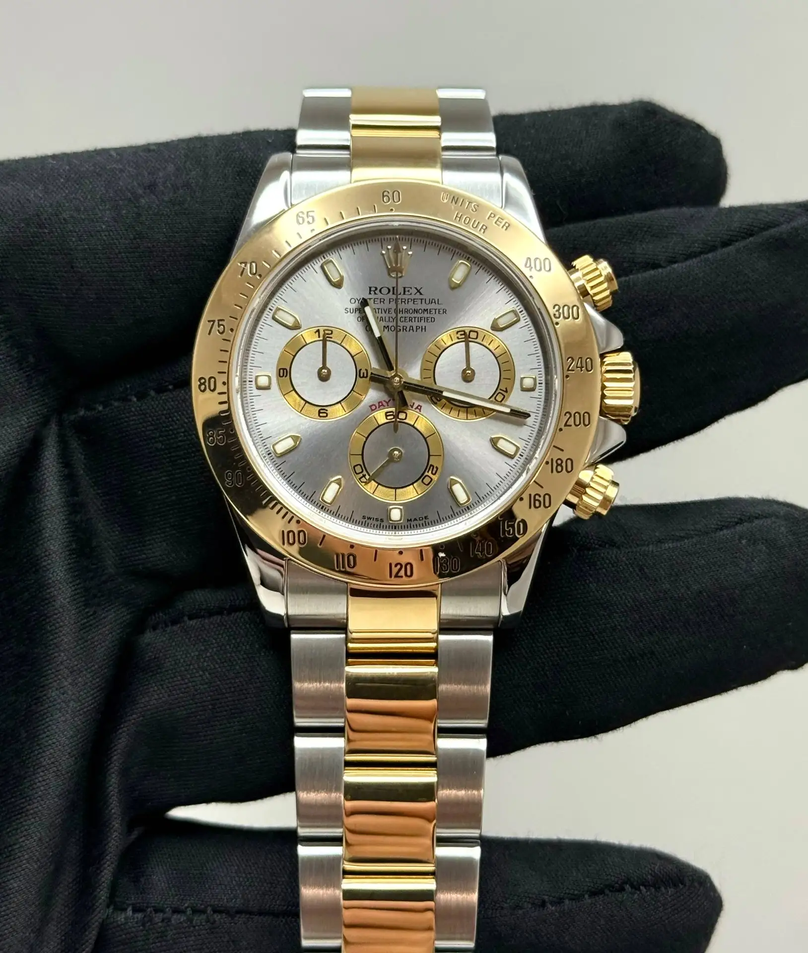 Бренд: Rolex; Кому: Унисекс; Состояние: Как новые; Механизм: Механика с автоподзаводом; Ремешок: Золото/сталь; Материал: Золото/сталь; Стекло: Сапфировое; Форма: Круг; Застежка: Раскладывающаяся; Материал застежки: Золото/сталь; Комплектация: Переноска; Год: 2006-2007; Водонепроницаемость: 100 м; Страна: Швейцария; Циферблат: Светло-серый; Размер браслета: 12 звеньев (18 см); Функции: Часы, минуты, секунды, хронограф,тахиметр;