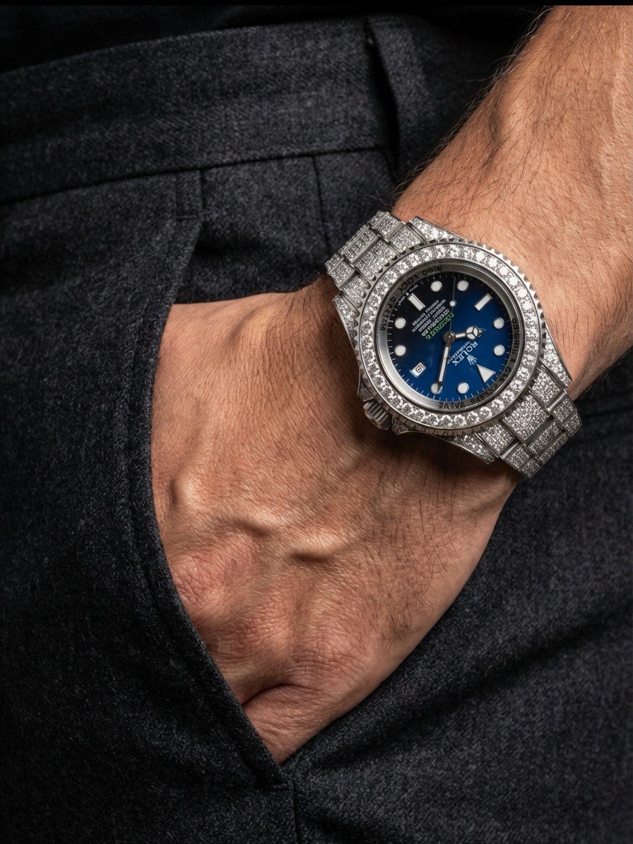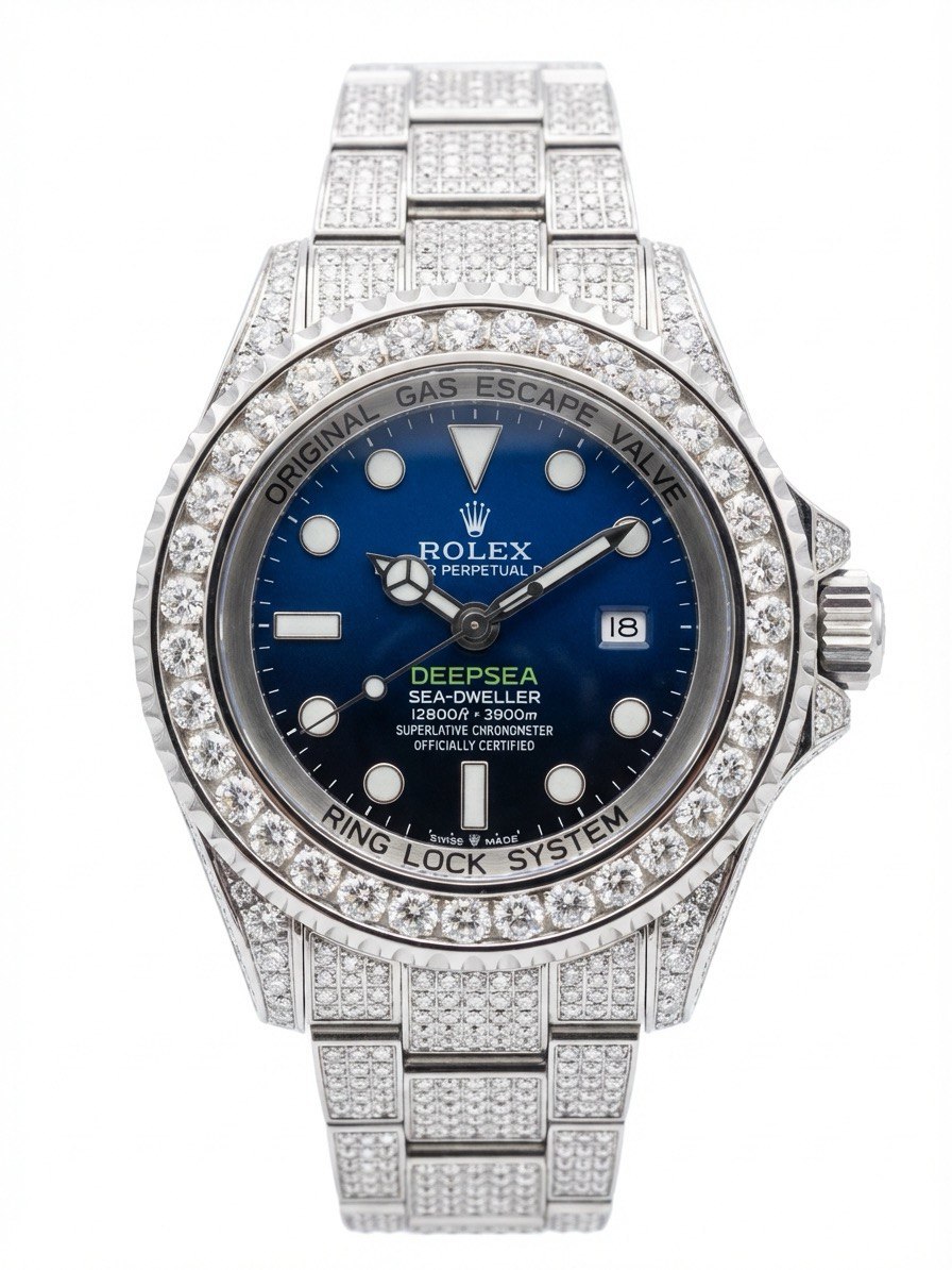 Бренд: Rolex; Кому: Унисекс; Состояние: Как новые; Механизм: Механика с автоподзаводом; Ремешок: Сталь; Стекло: Сапфировое; Форма: Круг; Застежка: Раскладывающаяся; Комплектация: Документы, переноска; Год: 2020; Водонепроницаемость : 3900 м; Запас хода: 70 ч; Калибр: 3235; Корпус: Сталь, дополнительно инкрустированы белыми бриллиантами; Циферблат: От ярко-синего до насыщенно-черного; Размер браслета: 19 см ; Размер корпуса: 44 мм; Функции: Дата, часы, минуты, секунды, клапан декомпрессии;