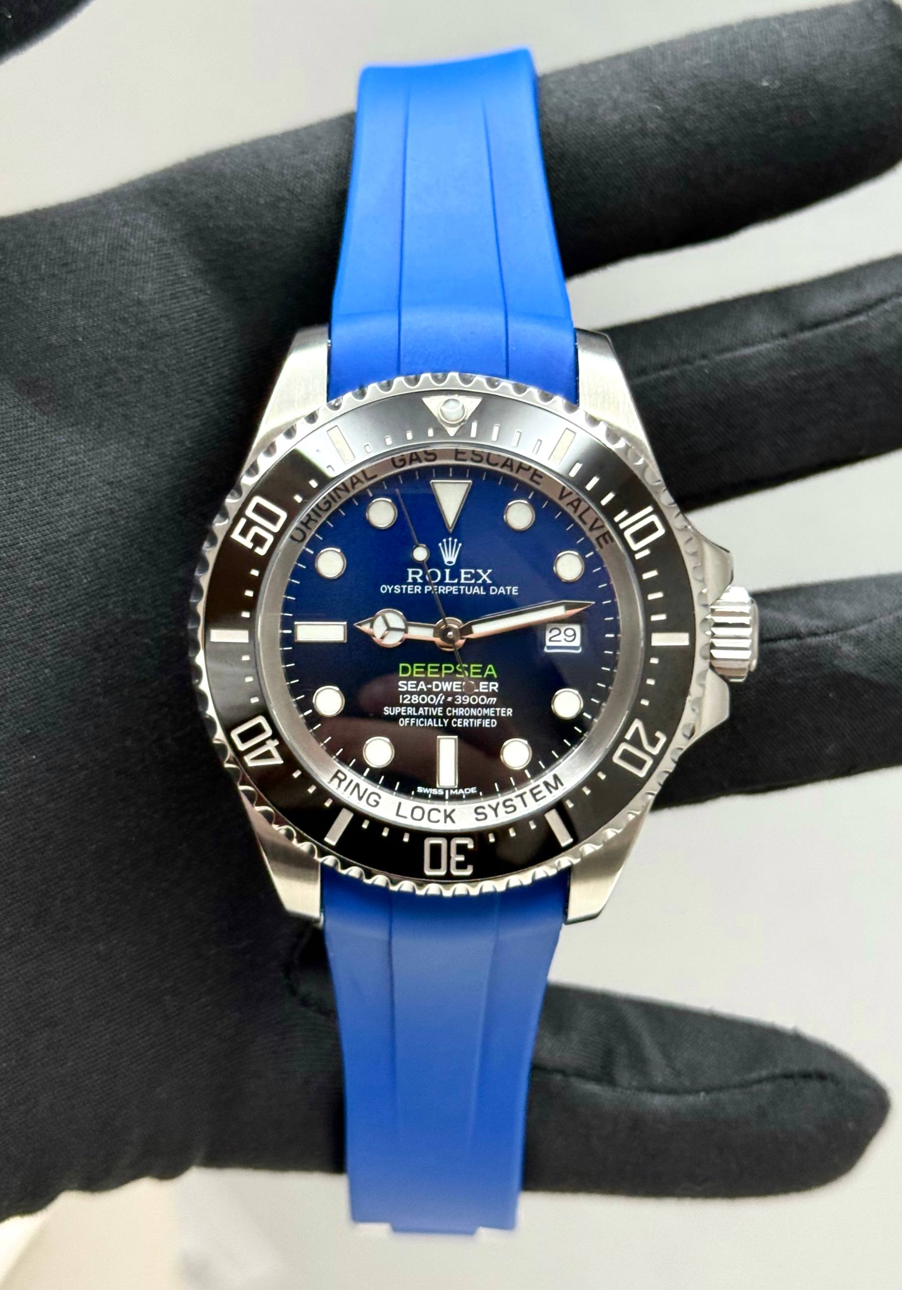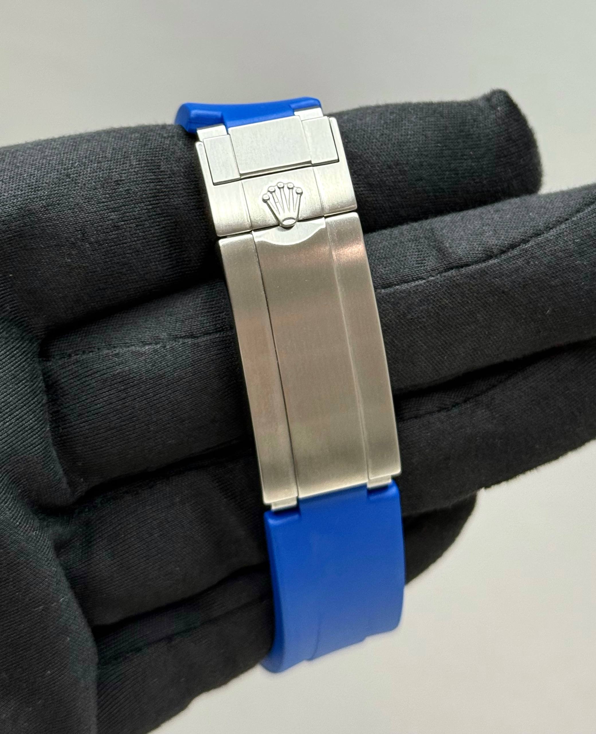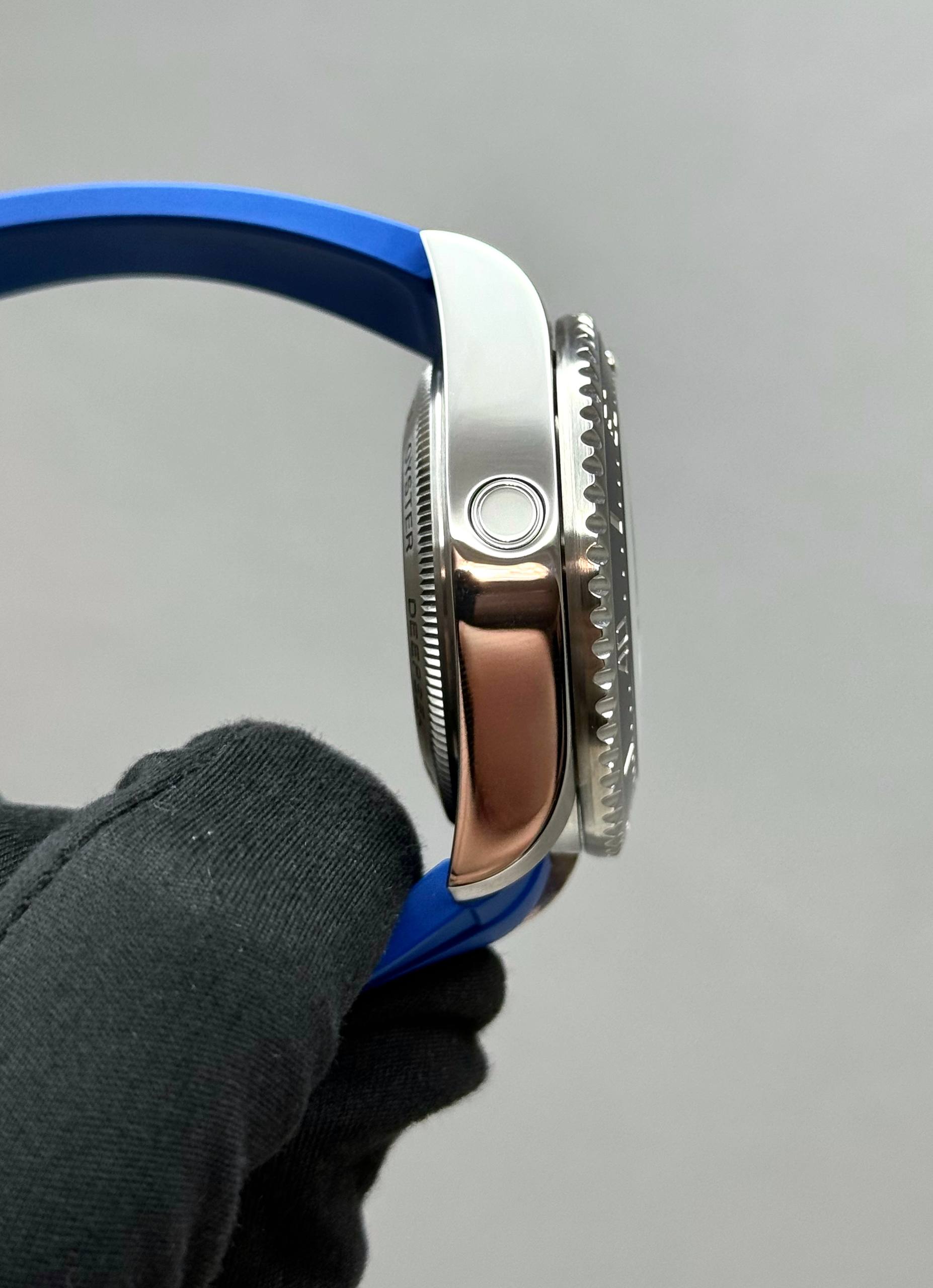 Бренд: Rolex; Кому: Мужские; Состояние: Как новые; Механизм: Механика с автоподзаводом; Ремешок: Каучук; Материал: Сталь; Стекло: Сапфировое; Форма: Круг; Застежка: Раскладывающаяся; Материал застежки: Сталь; Комплектация: Преноска; Год: 2007-2008; Водонепроницаемость : 3900 м; Запас хода: 48 ч; Калибр: 3135; Страна: Швейцария; Цвет ремешка: Синий; Циферблат: Черный с синим; Размер браслета: 17 см; Размер корпуса: 44 мм; Функции: Дата, часы, минуты, секунды, гелиевый клапан декомпрессии;