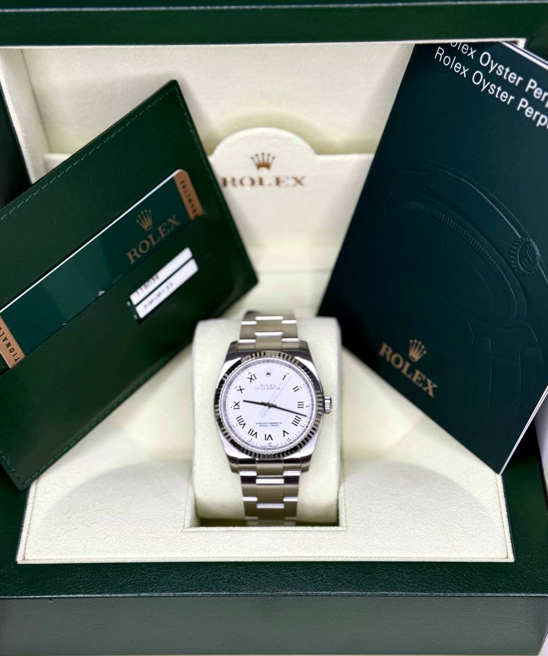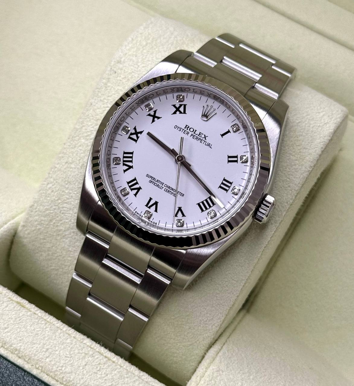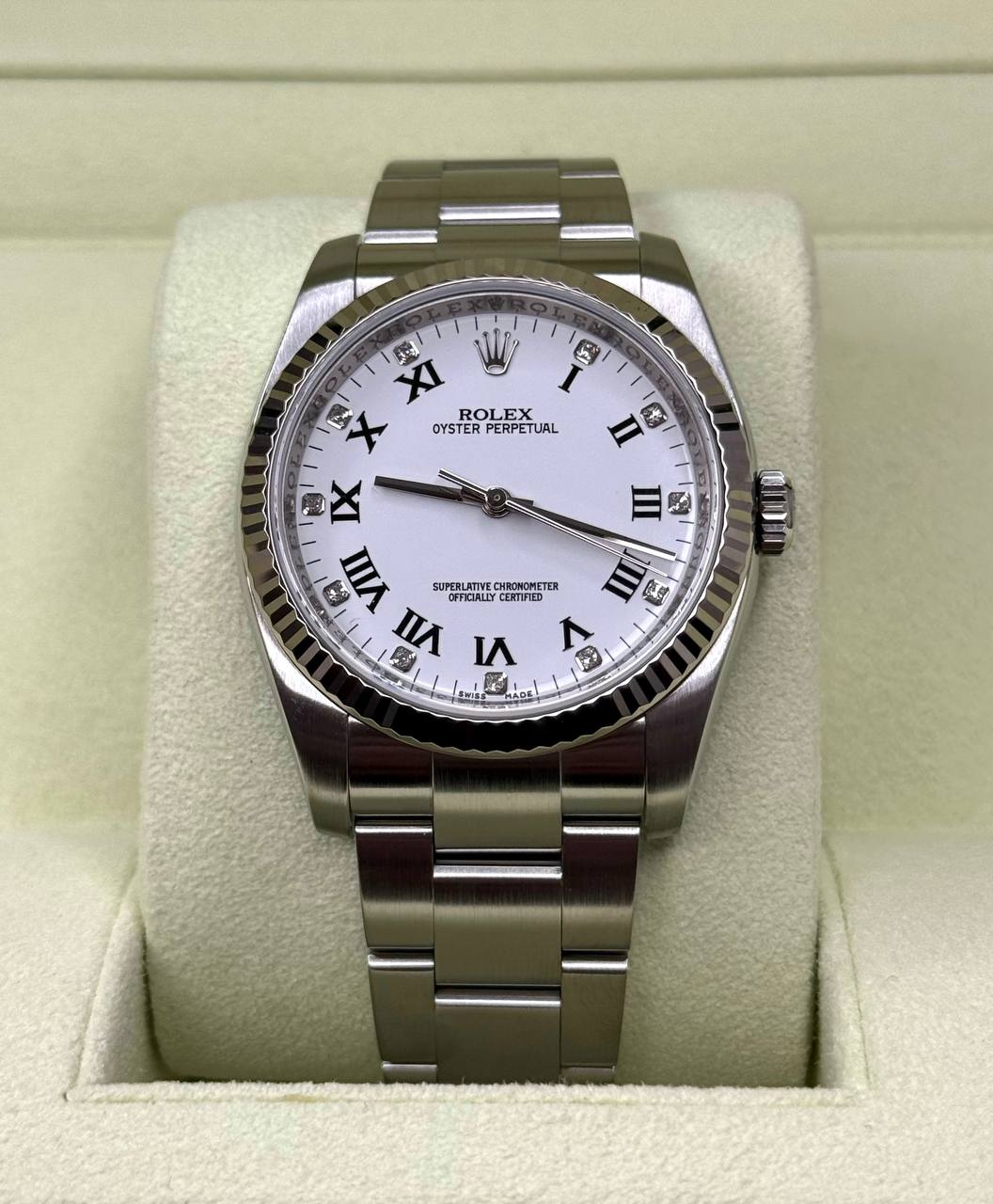 Бренд: Rolex; Кому: Унисекс; Состояние: Как новые; Механизм: Механика с автоподзаводом; Ремешок: Сталь; Материал: Сталь; Стекло: Сапфировое; Форма: Круг; Застежка: Раскладывающаяся; Материал застежки: Сталь; Комплектация: Коробка, документы; Год: 2013; Водонепроницаемость : 100 м; Запас хода: 48 ч; Страна: Швейцария; Циферблат: Белый, 11 белых бриллиантов; Размер браслета: 12 звеньев (18 см); Размер корпуса: 36 мм; Функции: Часы, минуты, секунды;