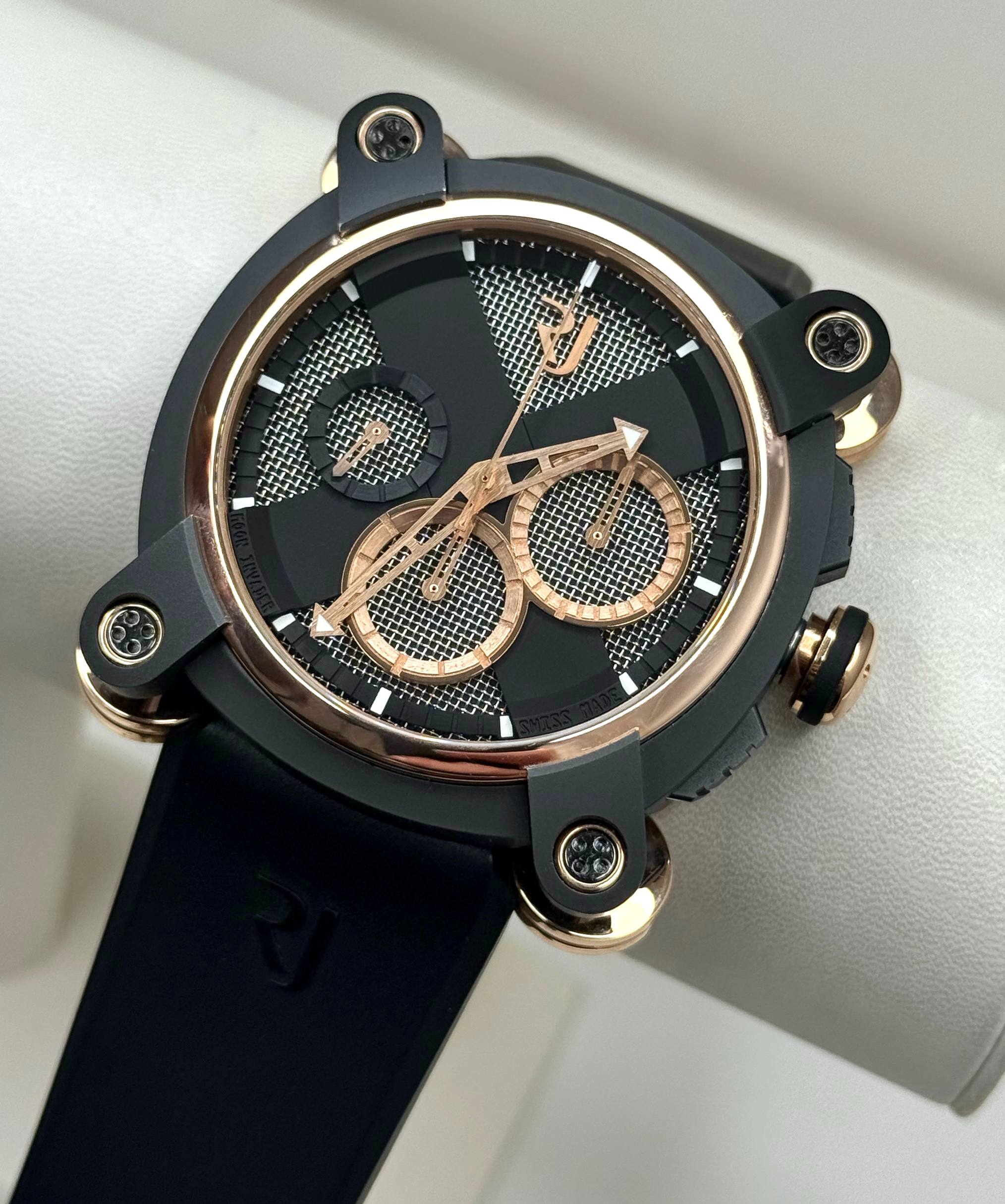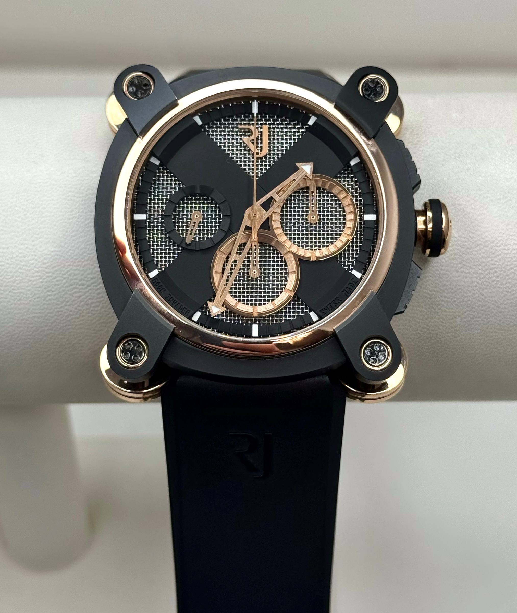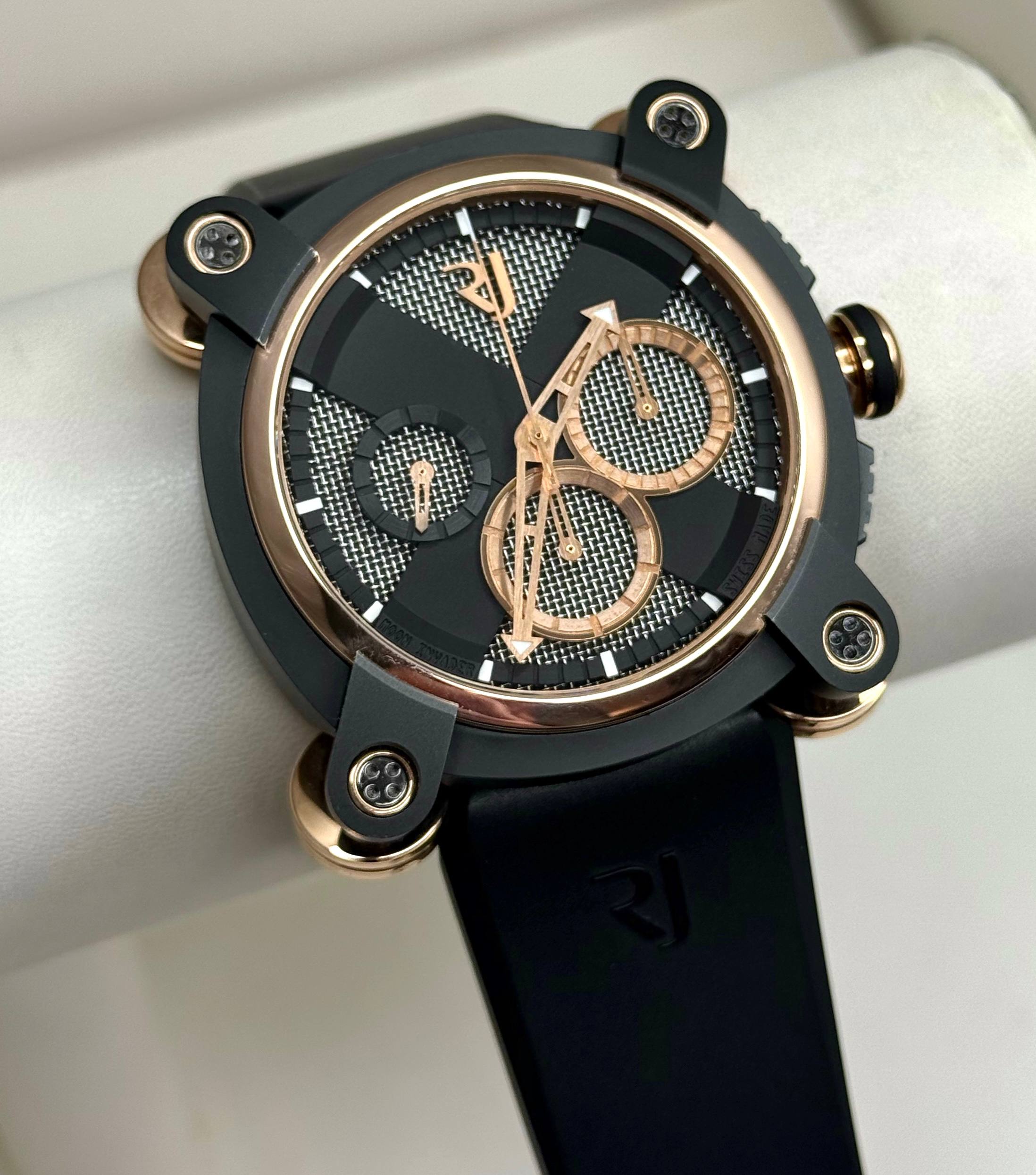 Бренд: Romain Jerome; Кому: Мужские; Состояние: С пробегом; Механизм: Механика с автоподзаводом; Ремешок: Каучук; Стекло: Сапфировое; Форма: Квадрат; Застежка: Раскладывающаяся; Материал застежки: Титан/сталь; Комплектация: Переноска; Материал: Розовое золото, нержавеющая сталь, покрытие PVD; Водонепроницаемость : 30 м; Калибр: RJ001-C; Страна: Швейцария; Цвет ремешка: Черный; Размер корпуса: 46 мм; Функции: Часы, минуты, секунды, хронограф;