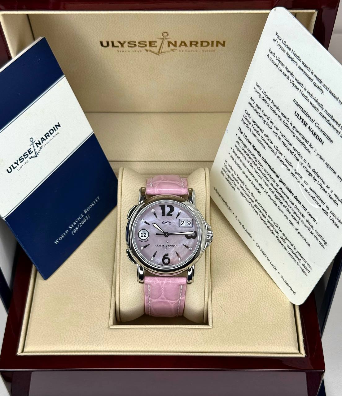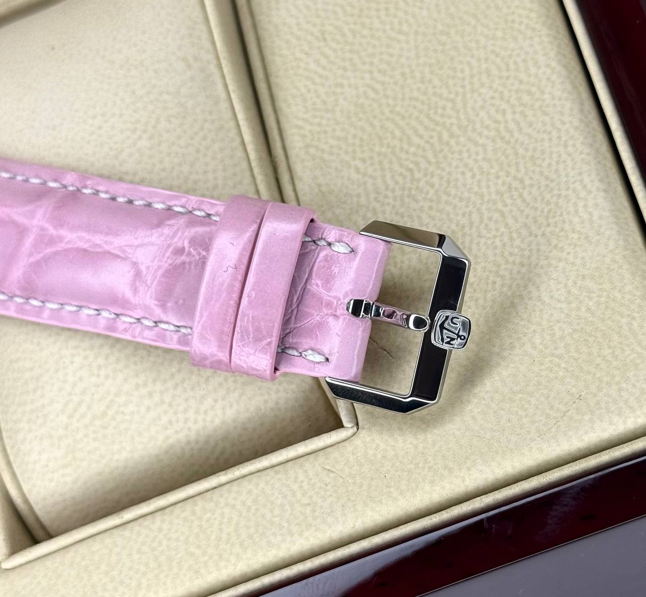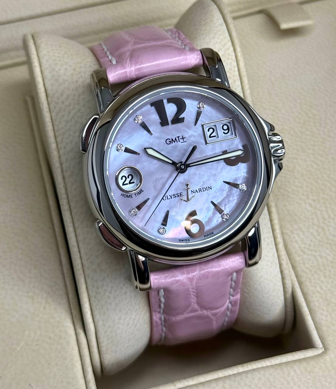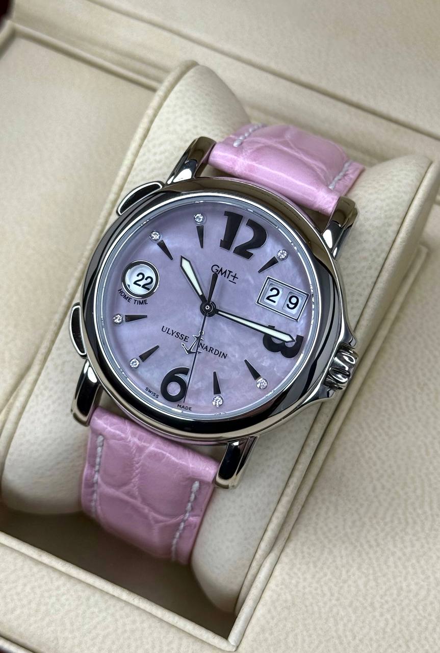 Бренд: Ulysse Nardin; Кому: Женские; Состояние: Как новые; Механизм: Механика с автоподзаводом; Ремешок: Кожа; Материал: Сталь; Стекло: Сапфировое; Форма: Круг; Застежка: Пряжка; Материал застежки: Сталь; Комплектация: Коробка, документы; Водонепроницаемость : 100 м; Запас хода: 42 ч; Страна: Швейцария; Цвет ремешка: Розовый; Циферблат: Розовый перламутровый. 7 белых бриллиантов; Размер ремня: 22 см; Размер корпуса: 37 мм; Функции: Дата, часы, минуты, секунды, второй часовой пояс;