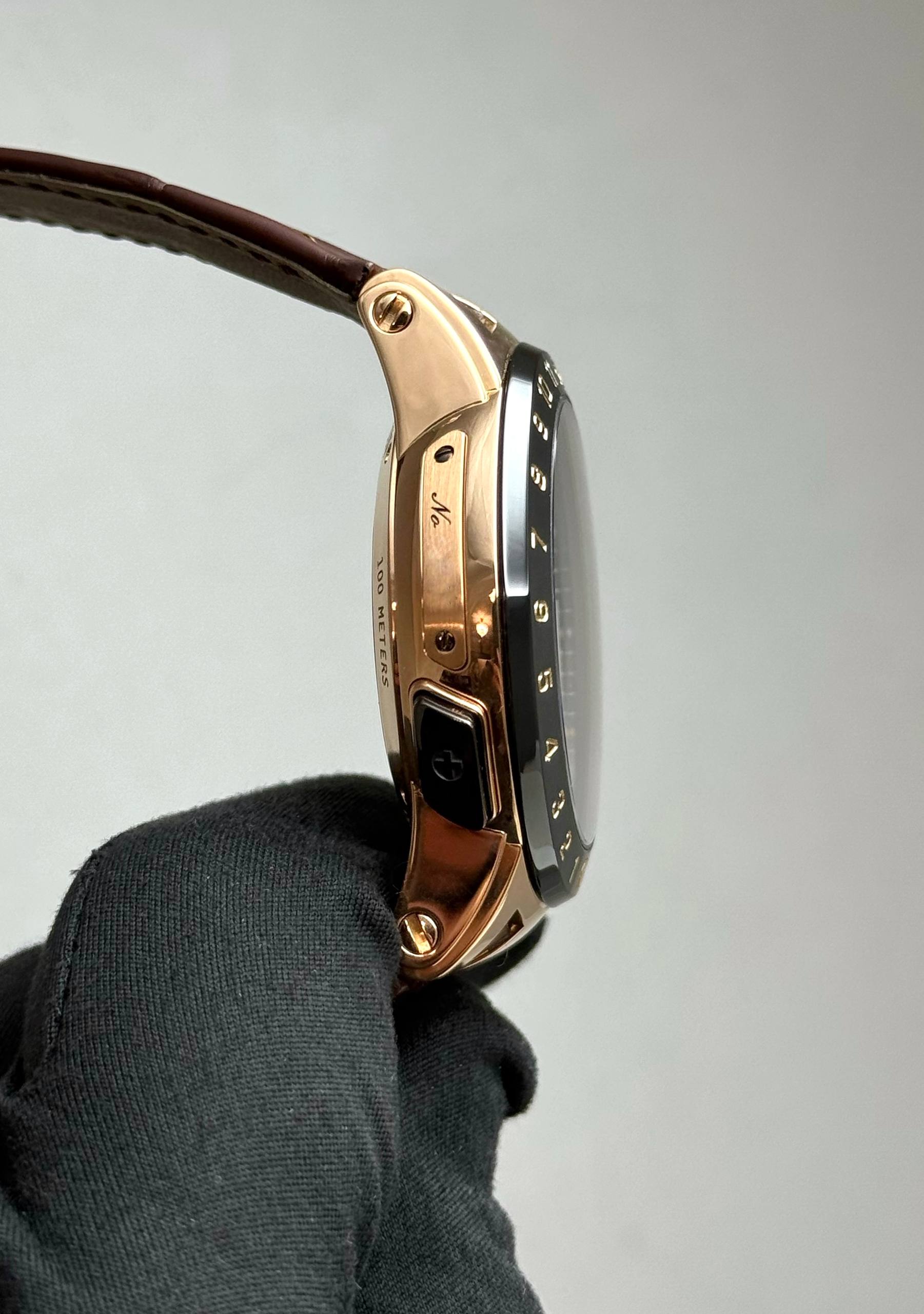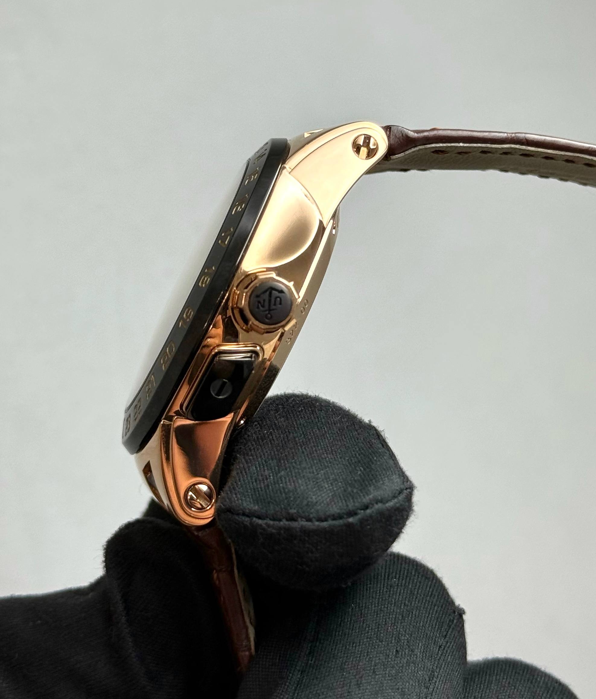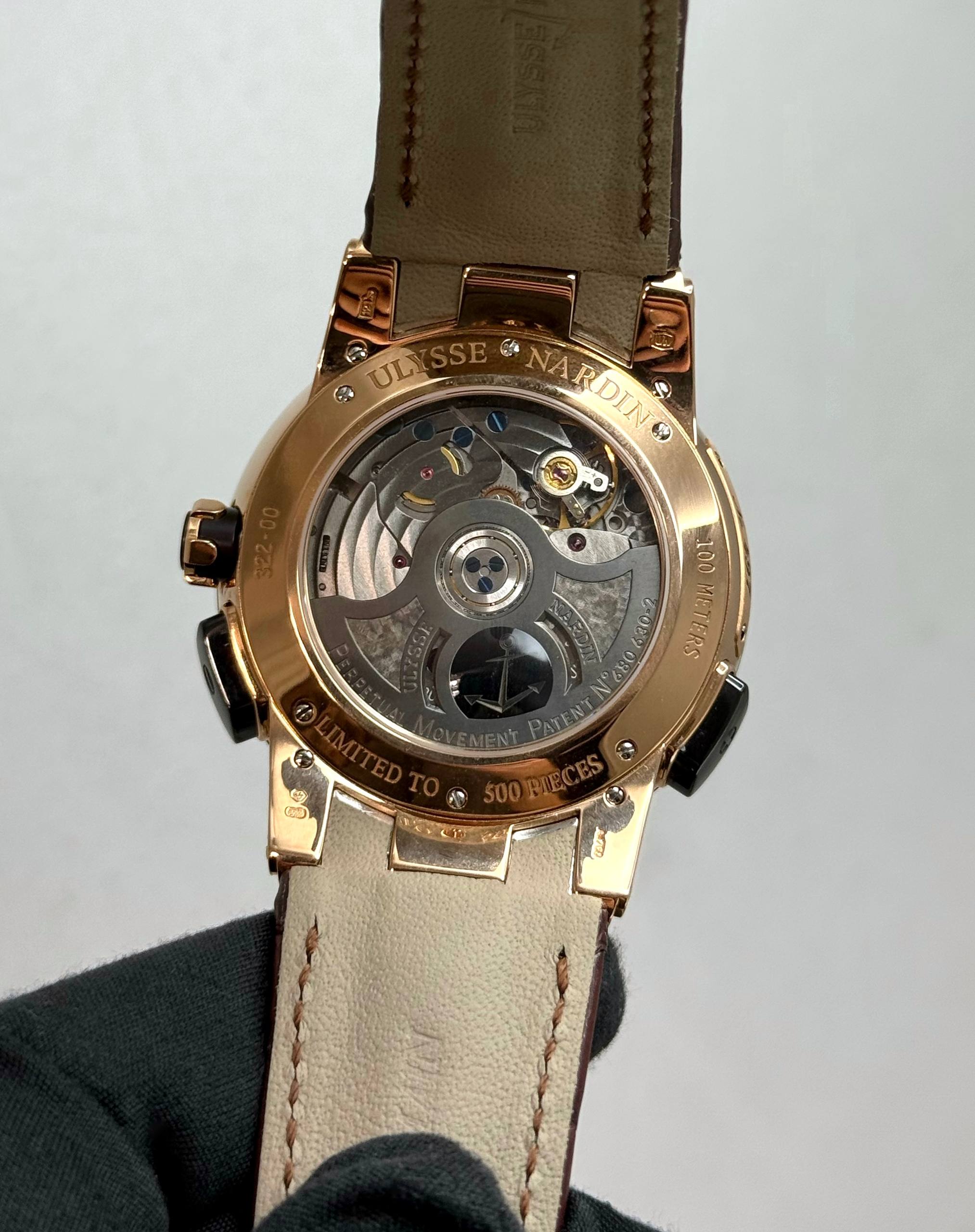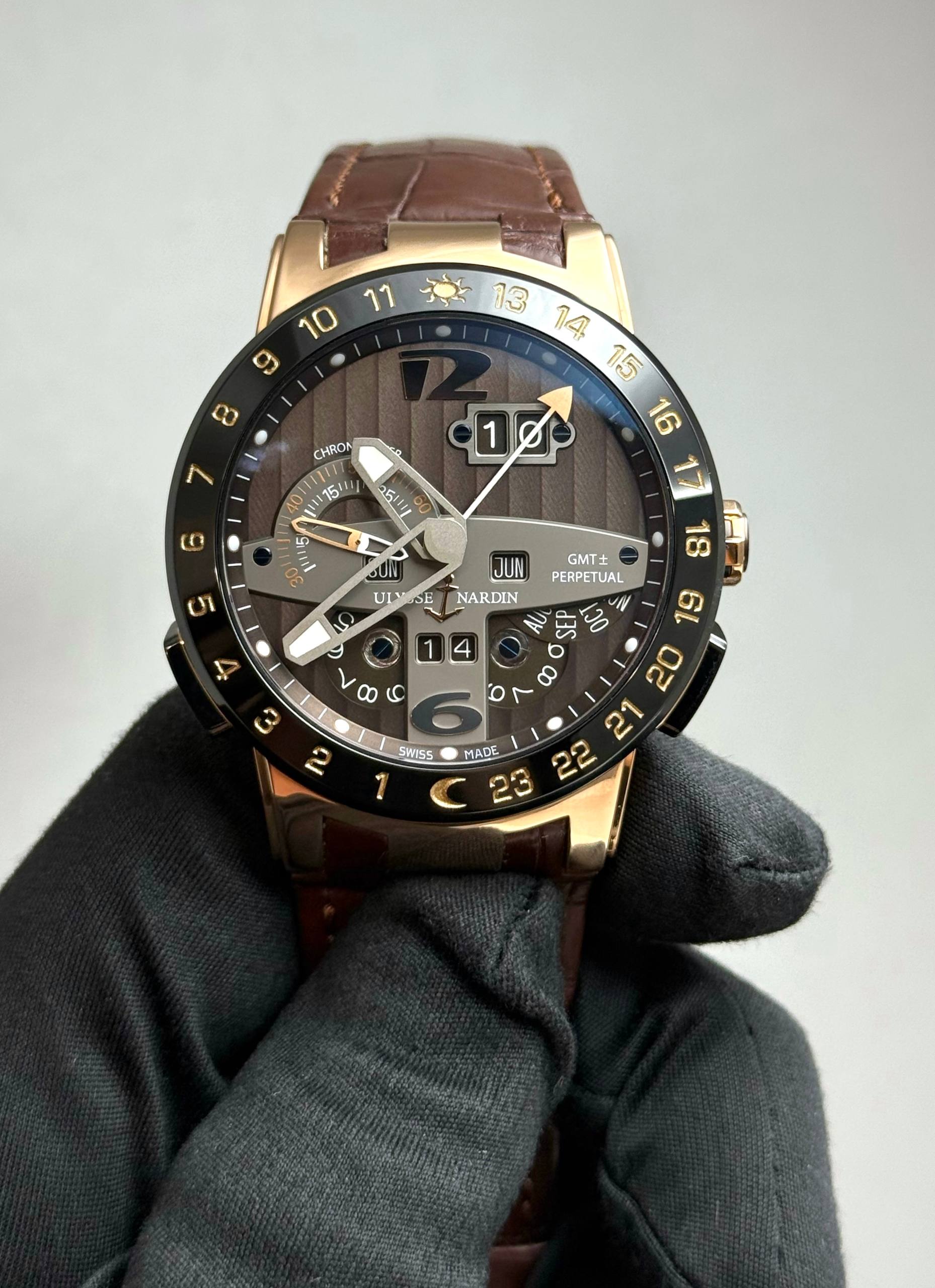 Бренд: Ulysse Nardin; Кому: Мужские; Состояние: С пробегом; Механизм: Механика с автоподзаводом; Ремешок: Кожа аллигатора; Материал: Розовое Золото 18K; Стекло: Сапфировое; Форма: Круг; Застежка: Раскладывающаяся; Материал застежки: Розовое Золото 18K; Комплектация: коробка; Материал безеля: Керамика; Водонепроницаемость : 100 м; Запас хода: 45 ч; Калибр: UN032-010286; Вес: 178 гр; Страна: Швейцария; Ремешок: Регулируется от 14 до 19 см; Цвет ремешка: Темно-коричневый; Циферблат: Коричневый с серым; Размер корпуса: 43 мм; Функции: Часы, минуты, секунды, второй часовой пояс, месяц, день недели, год;