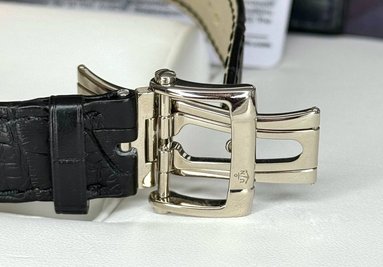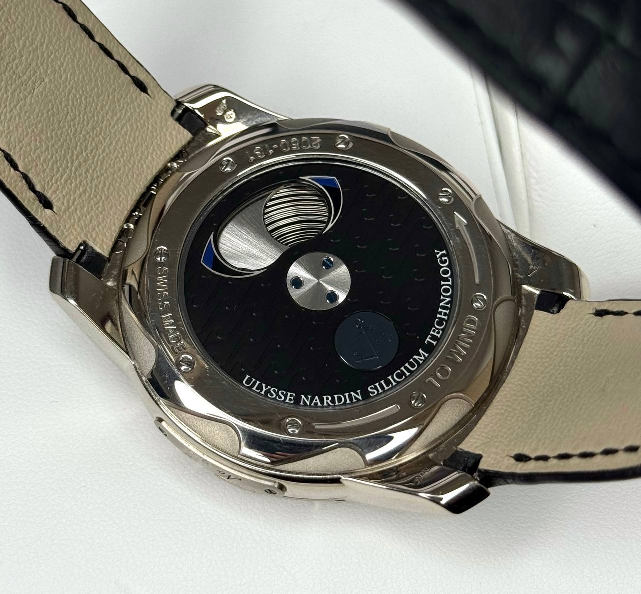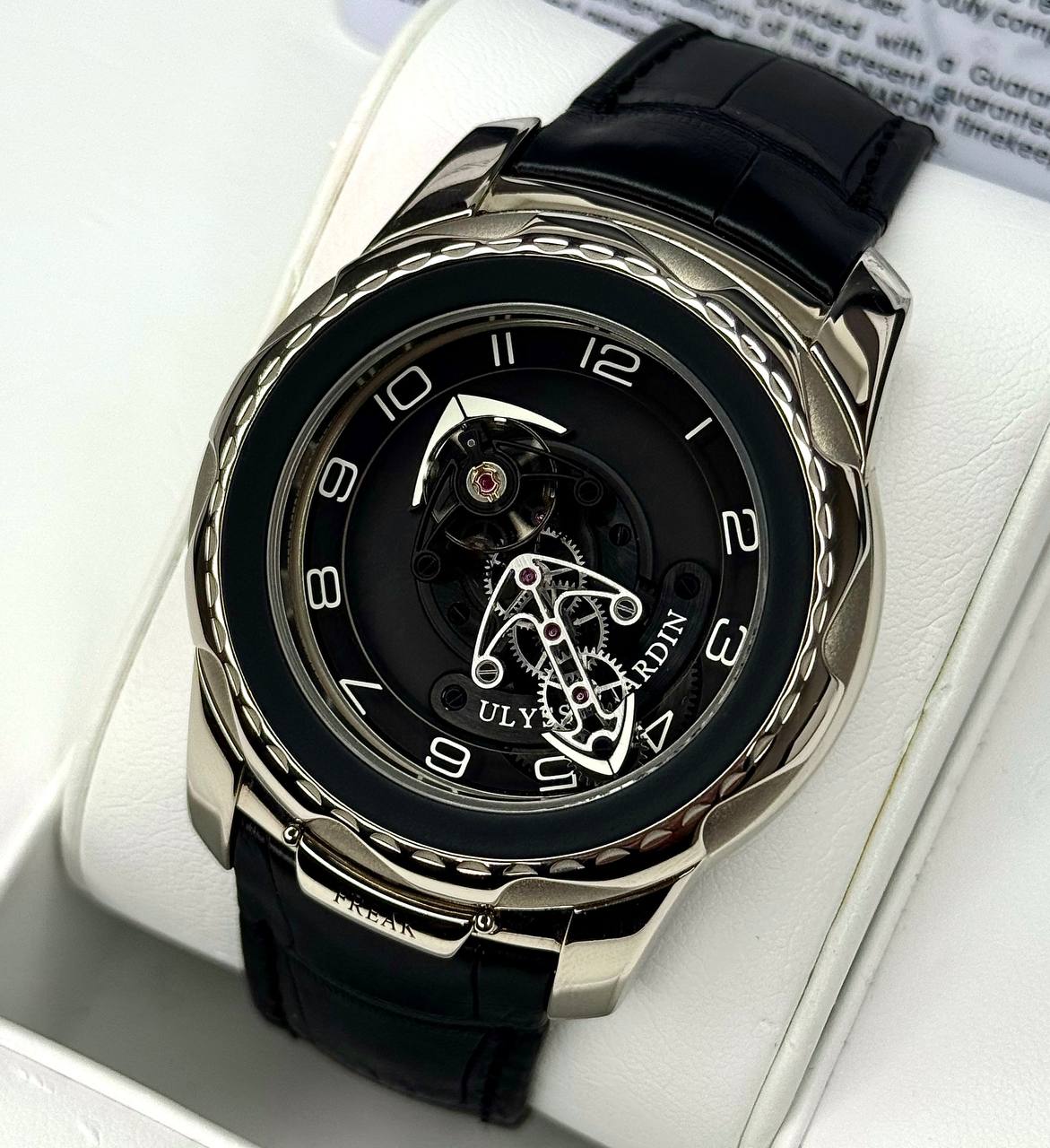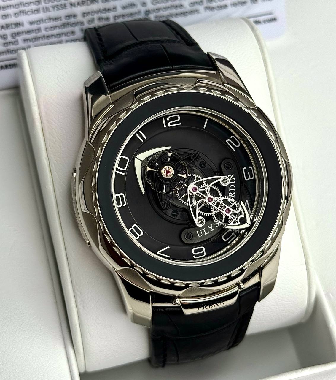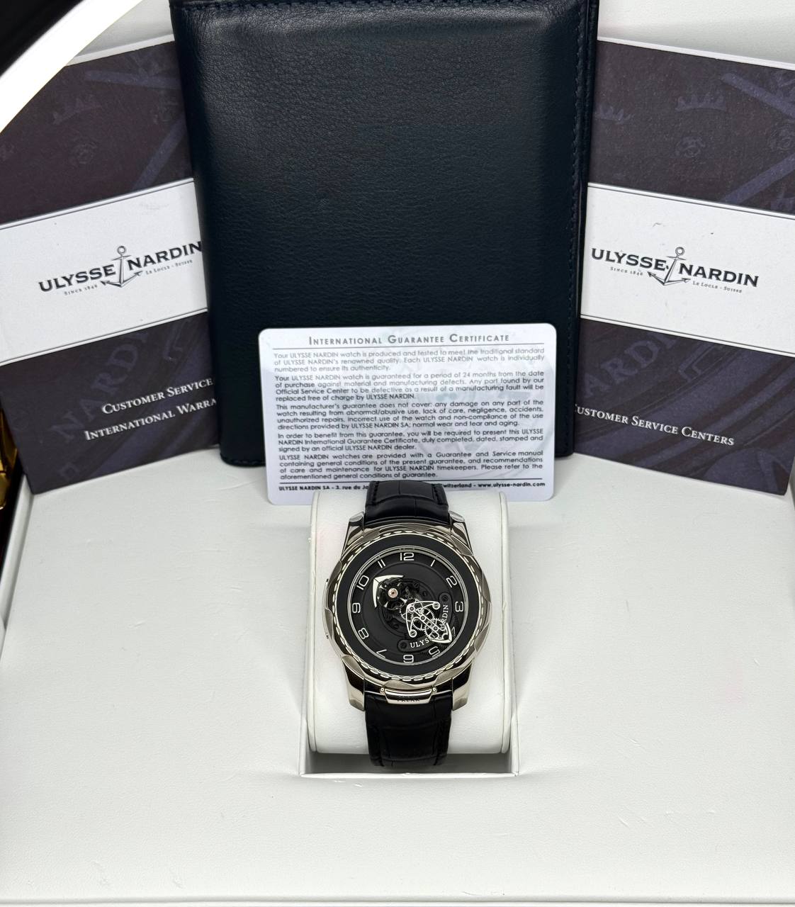 Бренд: Ulysse Nardin; Кому: Мужские; Состояние: Как новые; Механизм: С ручным заводом; Комплектация: полный комплект; Материал: 18- к белое золото; Водонепроницаемость (м): 30; Запас хода: 168 часов; Калибр: UN-205; Циферблат: черный; Размер: 45 мм; Функции: Карусельный турбийон, Минуты, часы;