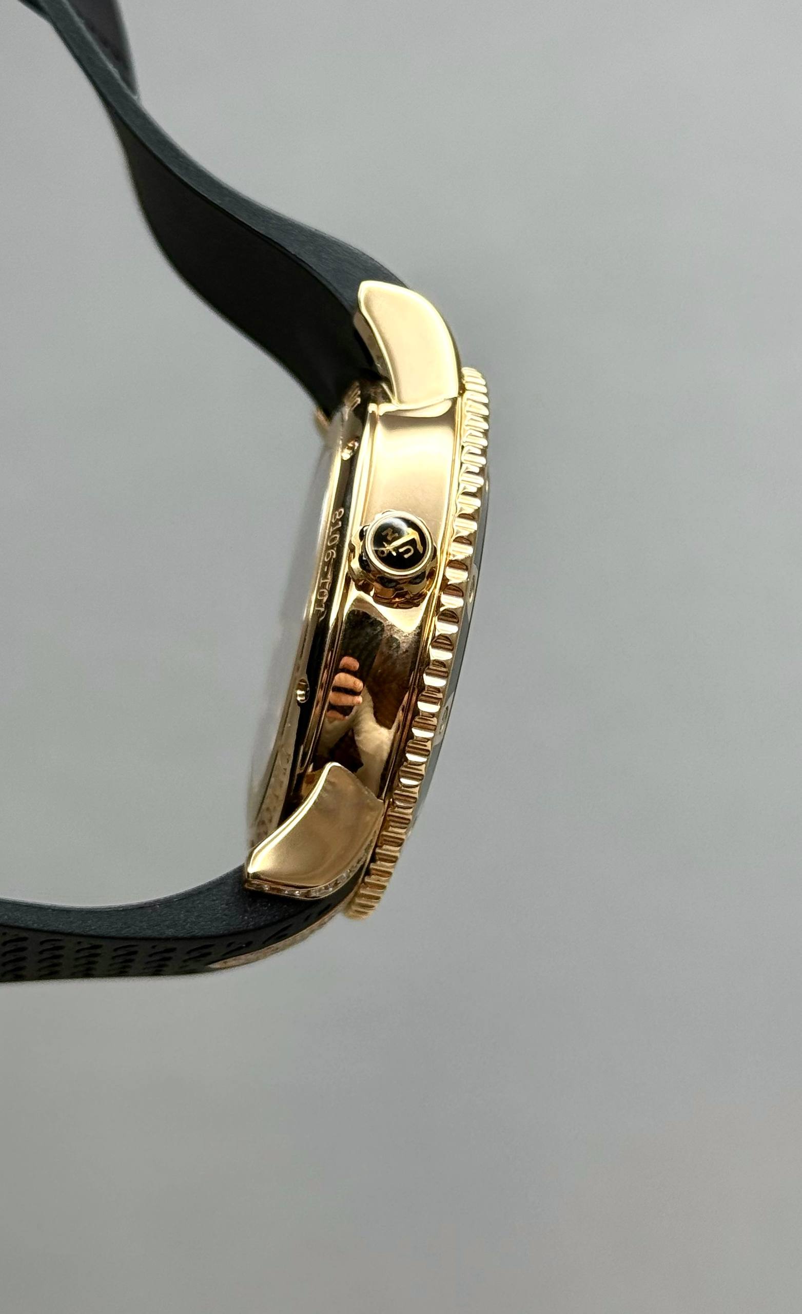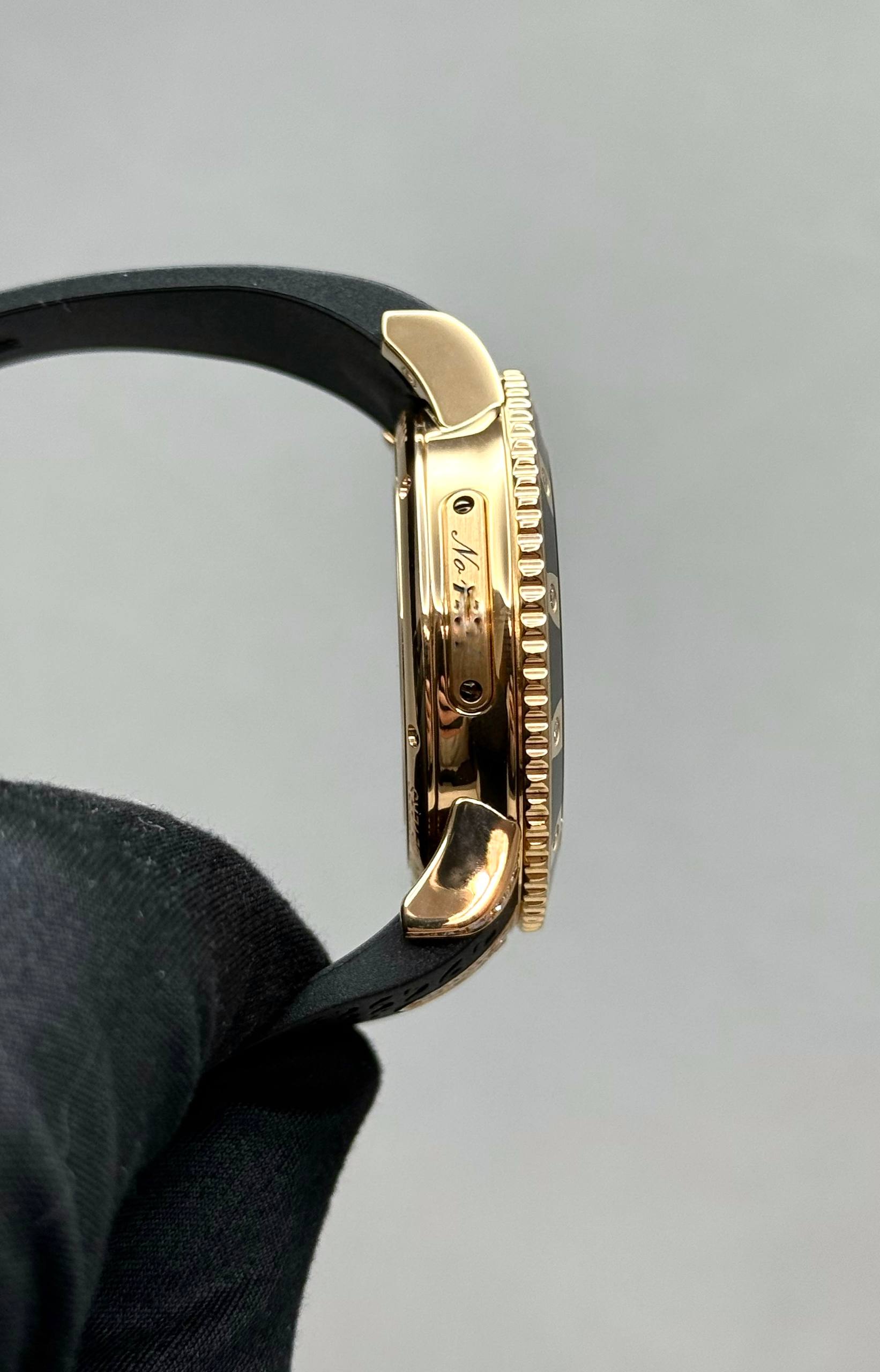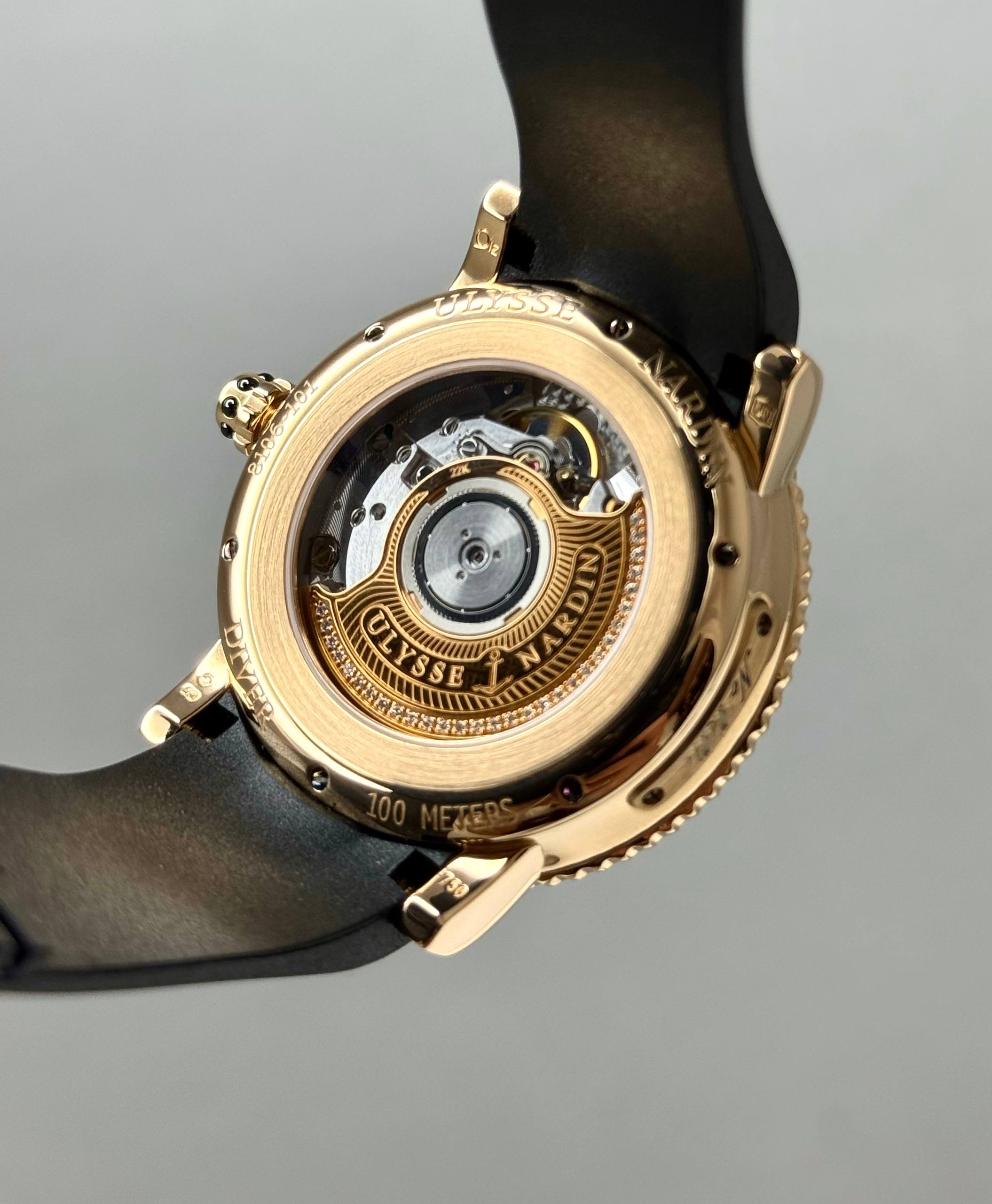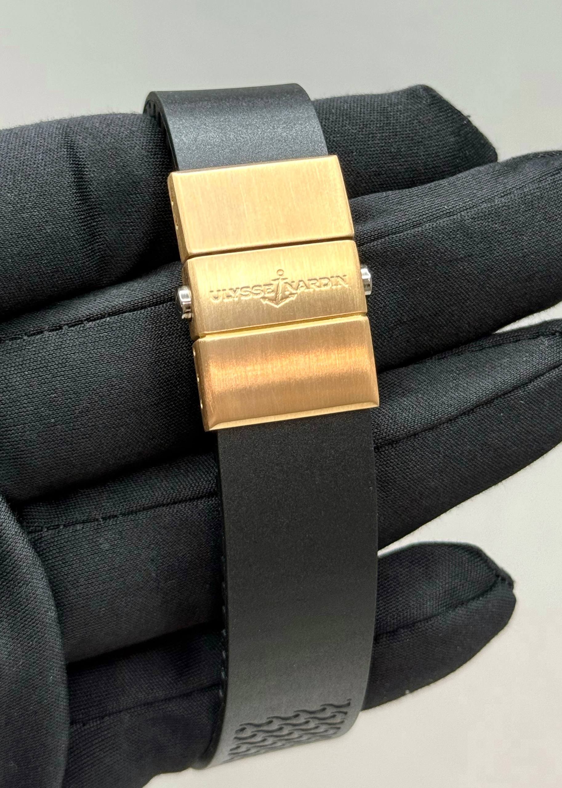 Бренд: Ulysse Nardin; Кому: Женские; Состояние: Как новые; Механизм: Механика с автоподзаводом; Ремешок: Каучук; Материал: Розовое золото; Стекло: Сапфировое; Форма: Круг; Застежка: Раскладывающаяся; Комплектация: Переноска; Материал застежки: Розовое золото / титан; Водонепроницаемость : 100 м; Запас хода: 42 ч; Вес: 125.4 гр; Цвет ремешка: Черный; Циферблат: Черный, белые бриллианты; Размер браслета: 19.5 см; Размер корпуса: 40 мм; Функции: Дата, часы, минуты, секунды;